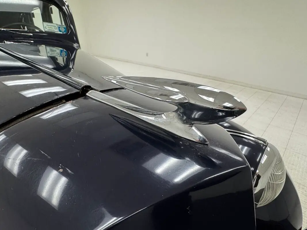 Art deco designs are incised into the gray broadcloth of the doors for a winning design and that material is used more traditionally on the bench seats showing a few tiny tears and round holes. Rear passengers are afforded a footrest, ashtrays, and handles while they lean back just behind the quarter window with plenty of room to spare. Up front, things go dark with full black coverage save for the ivory colored gauges with black numbering and art deco silver lining. Gray carpet covers the flat floor from which the shifter rises and a cloth headliner is in place. The narrow upright trunk shows uses and has a carpet piece on the shelf.