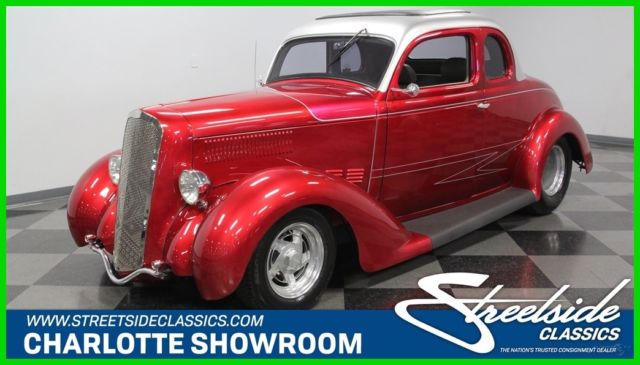 This is how to instantly standout in a crowd in all the right ways. Not many people have a 1936 Plymouth Business Coupe, and you'll likely never see one as well built as this one ever again. With the bold paint package, custom interior, performance suspension, and a 383 stroker V8 under the hood, this speedy custom Plymouth is ready to turn plenty of heads. This one is instantly recognizable the moment it comes into view. Not only are Plymouths a unique vehicle on the custom car scene, but also the custom design in that large grille means everyone is going to remember you. This is a classic steel body with the running boards and fenders in fiberglass for extra flair. So it looks fantastic in a modern Candy Apple Red that has enough clear coat to give it a mirror-like finish. Plus, with the sporty silver two-tone roof design and all the custom-matched pinstriping, this look like the hot rod that ZZ Top should have used in their music videos. Even the details are terrific, like the tri bar headlights, custom bumper, flush-mounted taillights, and caps on the large rear exhaust. But more than just a thoroughly professional build, you can tell this is a true speed machine. After all, those deep Weld wheels with Hoosier tires in the rear are there for more than just show. Inside it feels like no expense was spared to give this classic coupe plenty of real modern conveniences. A nice tan color matches everything on the door panels, seats, and dash. The single bench seat up front was upgraded to two modern leather-covered buckets that are vastly more comfortable than anything out of the '30s. The driver gets a Lecarra sports steering wheel with comfortable grips that match the carpeting. Ahead of that is a full set of AutoMeter gauges. This is built to be a cool comfortable cruiser, that's why you get great features like an AM/FM/CD stereo, and a tilt steering column. Plus, a custom center console houses the power window switches and ratchet-style shifter. Stuffed into the engine bay is plenty of power. This is a 383 cubic-inch stroker motor that has been enhanced and fortified with aluminum fast burn heads, aluminum roller rockers, GM Hot cam, cast valve covers, and an MSD ignition. It inhales deeply though a Holley four-barrel carburetor, and it exhales through shorty headers that add even more power as they contribute to the thunderous dual exhaust. The V8 is backed up by a stout TH350 three-speed automatic, and that feeds the Currie Ford 9-inch rear end running quick 3.73 gears. Those big rear tires stay planted to the pavement thanks to a four-link rear end with stabilizer bark and adjustable coilovers. Up front is a Mustang II-style independent suspension with power steering and front disc brakes. Complete with build receipts, this is the street machine that has far more value than just being a unique Plymouth. So don't wait too long, or this custom creation might be gone. Call now!
