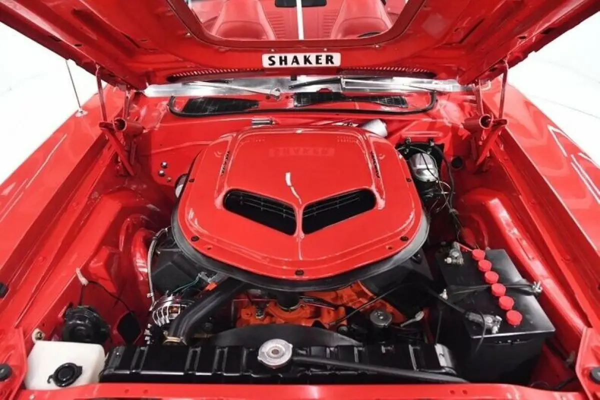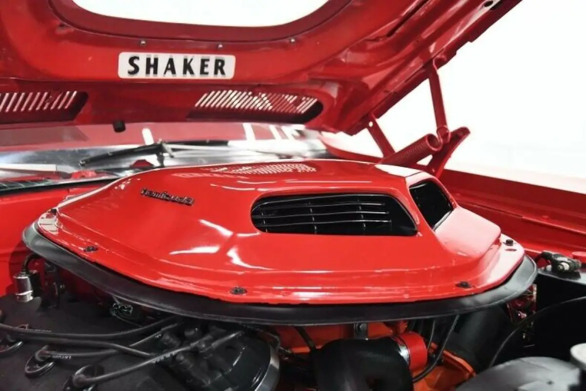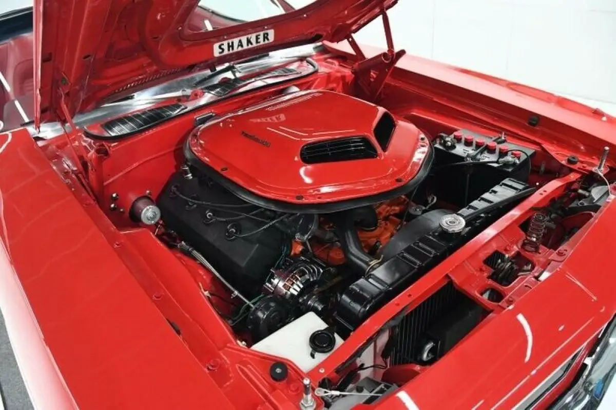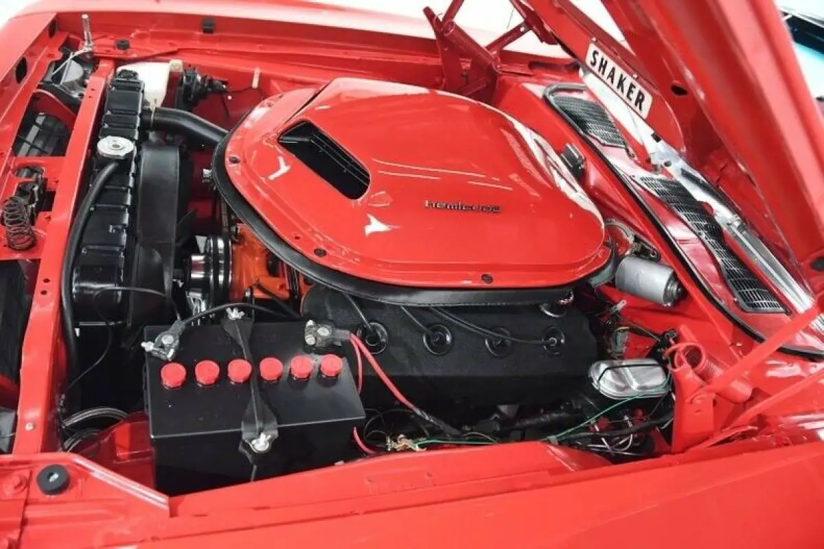 ENGINE COMPARTMENT: Legendary 426 Hemi motor sits under the shaker hood scoop. Built by John Aruzza, it is producing 545 horsepower. Has new set of dual quad carbs and headers. It is a vintage 1968 motor, not a reproduction. The engine bay is spotless. The block has a clean coat of Hemi orange, valve covers have black crinkle finish, brackets and power steering pump is satin black. Pulleys are aluminum. All the components on the firewall look new. Radiator, shroud, fan look new. The engine bay is clean metal painted gloss red, has fender tag. Battery has Mopar topper. There is a transmission cooler with braided stainless hoses in front of the radiator.