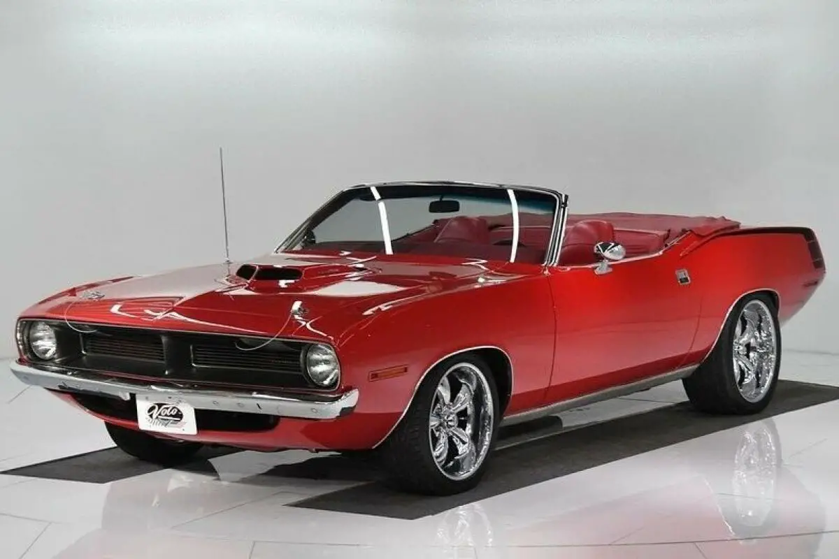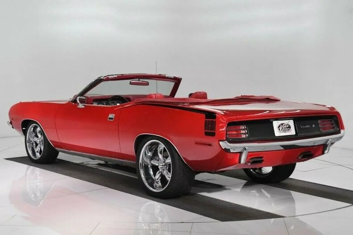 EXTERIOR: The body was restored over 10 years ago and it looks like it was done yesterday. To me it has proven itself. It looks like the quarter panels are original. Has shaker hood with pins. The body is absolutely laser straight. The panels fit nice and square. The red paint is polished like glass, really it's like a red mirror anywhere you look. The hockey stick stripe is painted gloss black and are smooth to the touch. The chrome is new including the bumpers, door handles and sport mirrors. The stainless around the windshield is polished, windshield is new. Has the correct antenna. The grill has been repainted, has a small crack. Has a great stance with staggered size chrome Coy's wheels, 18s in front, 20s in back. Also extra wide in back, performance tires all the way around. Black convertible top has the correct Mopar grain with a glass window. The weather strips are new. Rectangle exhaust tips exit through the valance.