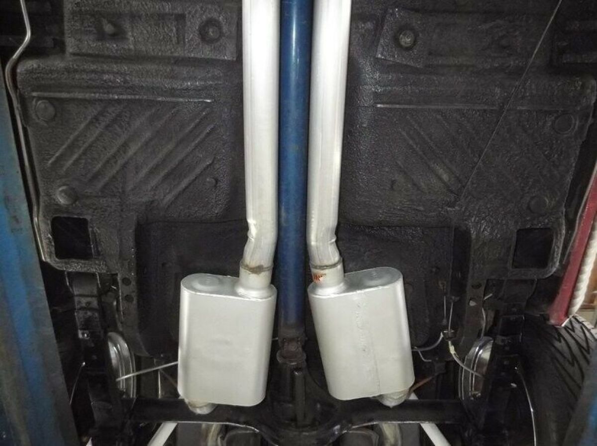 UNDERSIDE: The entire front suspension, k member was out of the car- rebuilt and detailed. Has bigger swaybar. Bottom of the motor is spotless. Has flywheel cover, starter looks new. The 727 Torqueflite auto trans has finned aluminum pan. Replaced driveshaft connects to a 3.91 posi rear. In back it has new shocks. Upgraded brake system with disc brakes at all four wheels. E-brake system looks complete. New fuel system including tank, straps, lines etc. Has a great sounding fat exhaust system. Has crossover pipe, Flowmaster mufflers and correct rectangular tips through the valance.