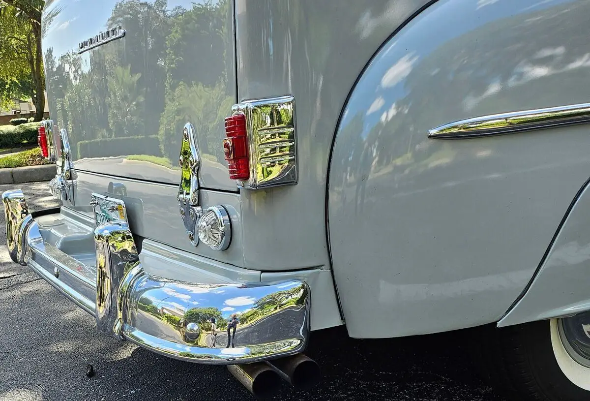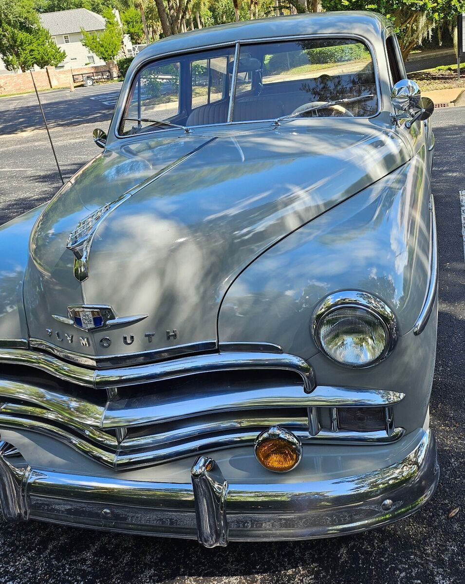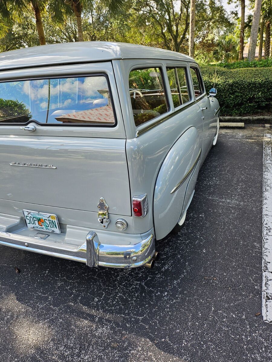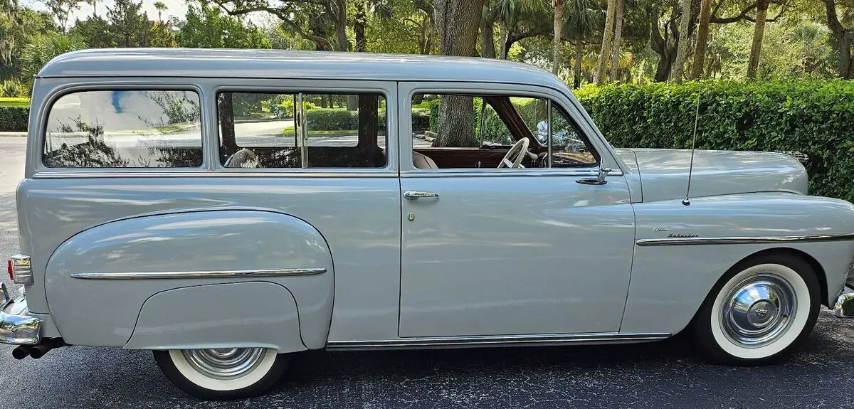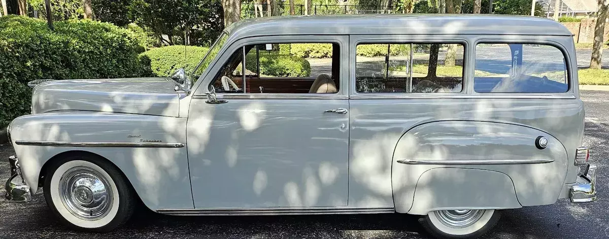 This 1950 Plymouth Special Suburban wagon was in a California collection for many years and was featured in an article in the August 1993 issue of Car Collector magazine. It was described as “faultless quality in a plain gray wrapper.” The plain gray wrapper is still there. The body, frame and bright work are all original and in pristine condition. I bought the car a few years ago and decided to bring it into the 21st century. I had the car shipped to St. Louis to a specialty shop and had it modified to provide all the comforts that we expect today: new engine (replaced the inline 6 with a rebuilt 318 V8), EFI, Automatic Transmission, Air Conditioning, Power Steering, Mustang II Front End, Power Brakes (Disc on front), Power Windows. It has an aluminum radiator with electric cooling fan, alternator, 12-volt system throughout the car, electric windshield wipers, rebuilt dashboard instrument cluster, coil over springs front suspension, rebuilt rear leaf springs, reworked differential, rebuilt drive shaft. It has new steering wheel made especially for this car; tilt steering column, back up lights, custom dual exhaust, original radio modified for AM/FM (has the look of the original), new American Classic wide whitewall radial tires plus spare, new headliner and new door panel inserts to match the headliner, new matching floor mats, installed seatbelts. I replaced the driver-side door glass (was delaminating).