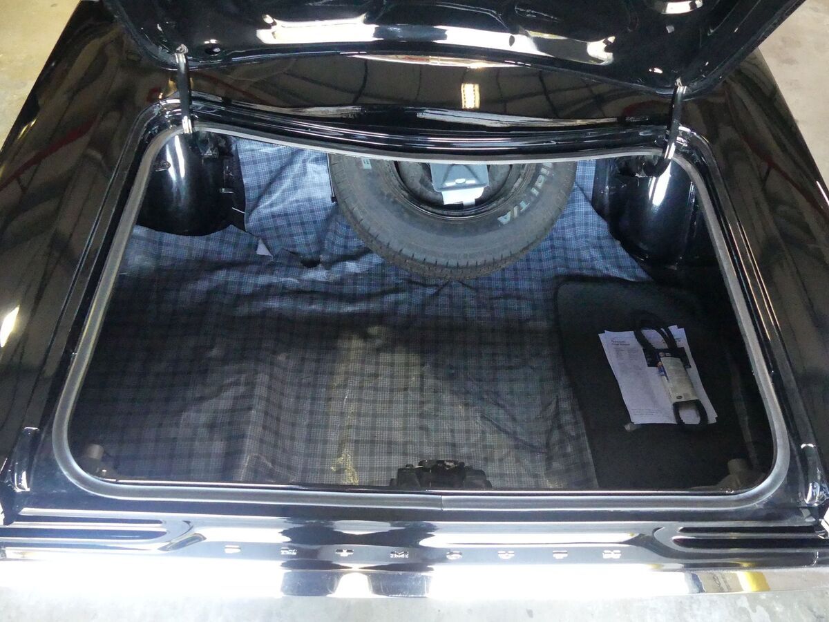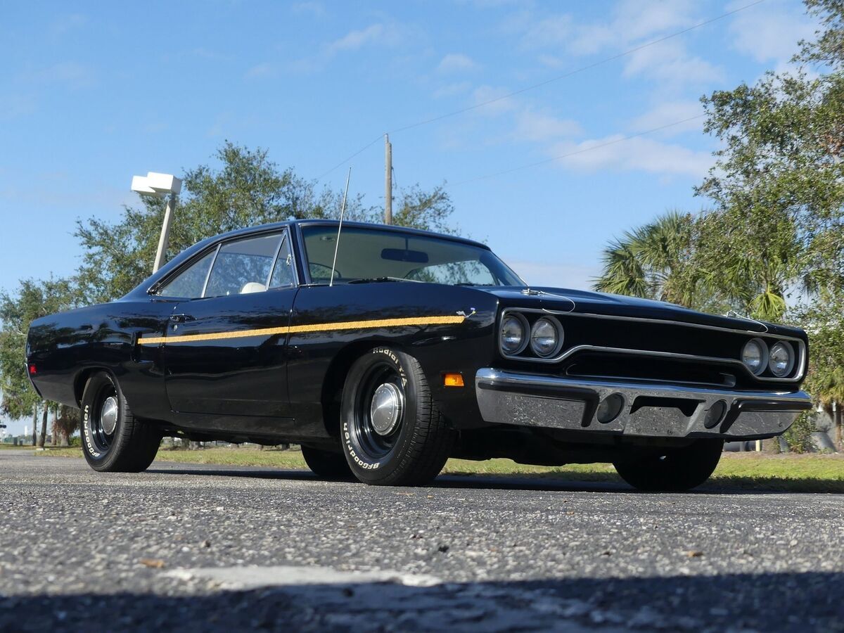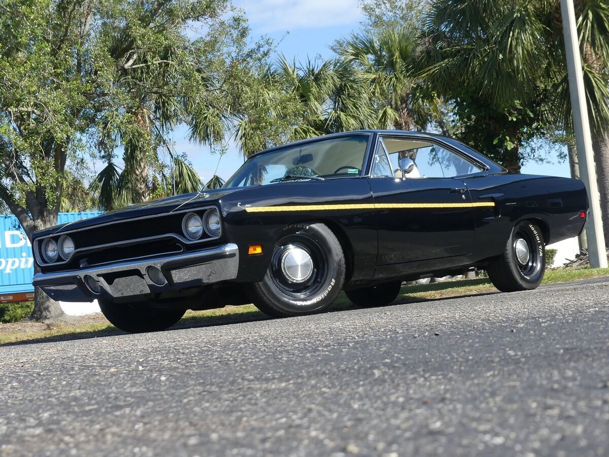 This car is very correct and absolutely gorgeous in the factory correct Black Velvet paint with White interior. The Road Runner with the gold dust trail extends down the sides of the car while hood pins and black steel wheels with center caps finish it off. Those wheels are wrapped in BF Goodrich Radial T/A raised white letter radial tires for sure grip and a nice ride quality.