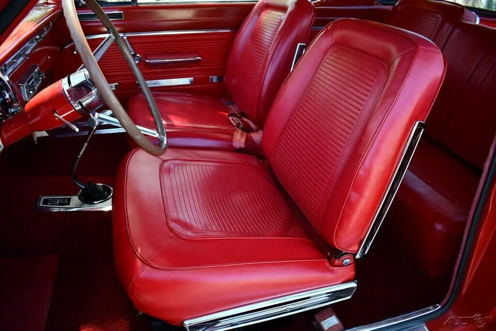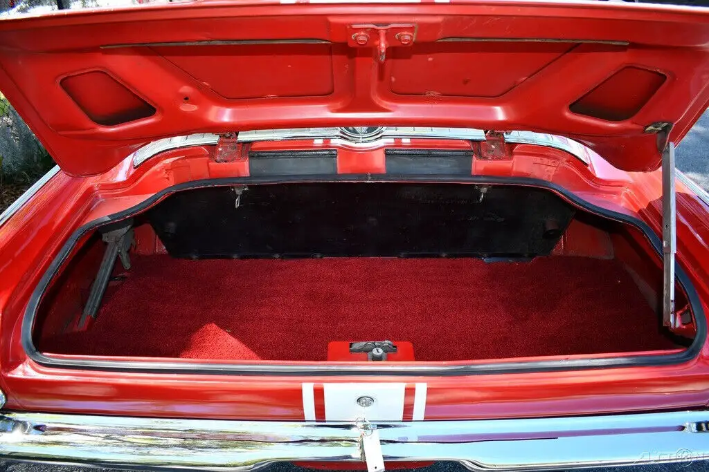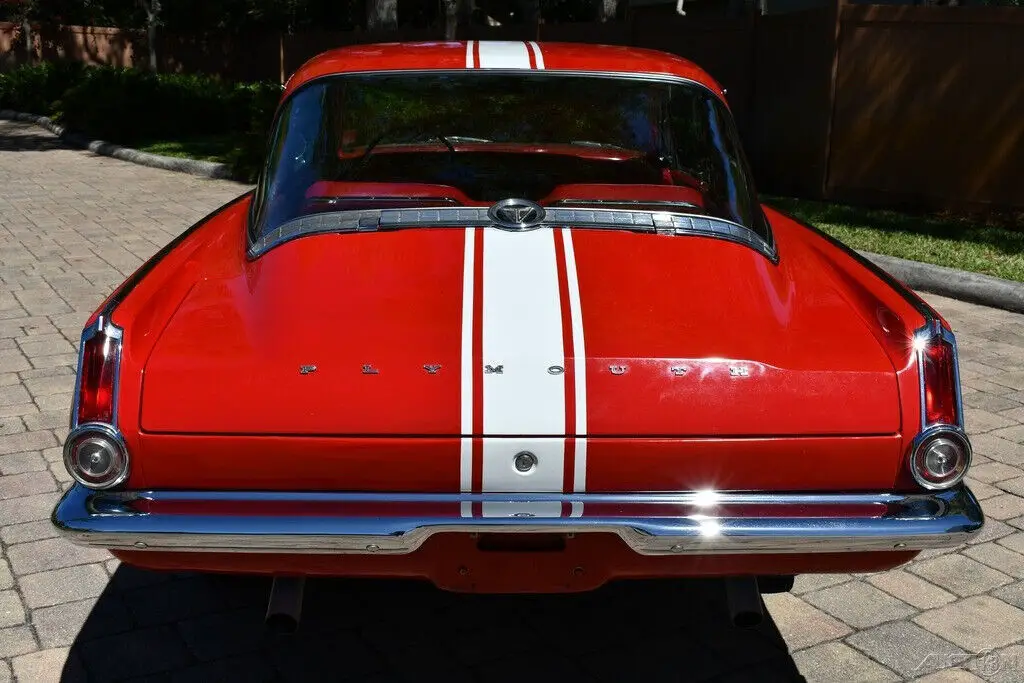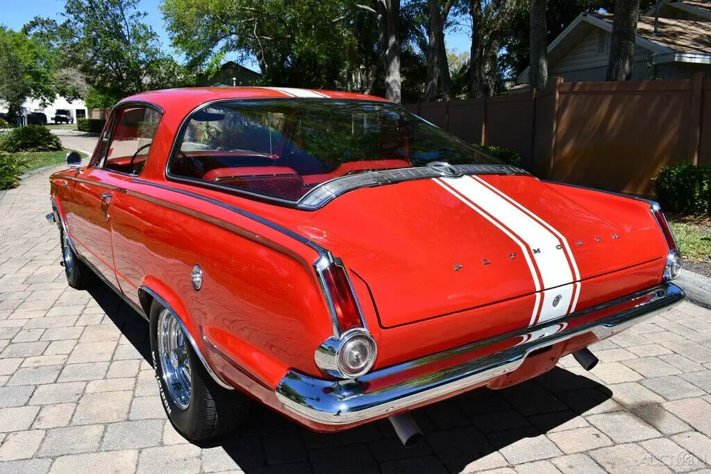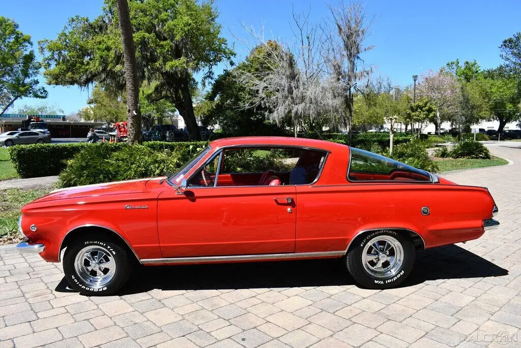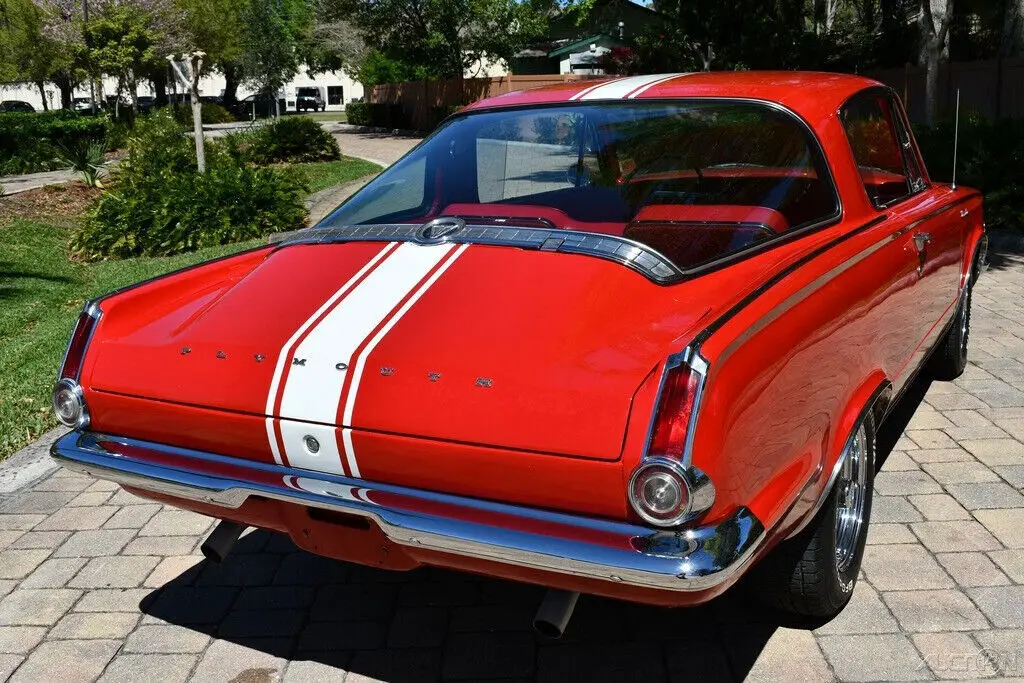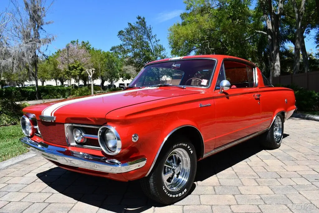 Remarkable 1965 Plymouth Barracuda 273cid Commando V8 Engine w/ 4 bbl Carburetor Factory 4 Speed Manual Transmission Bright Red Exterior Rally Stripes Red Bucket Seat Factory HD Suspension Largest Rear Window at the Time! Amazing Chrome Bumpers
