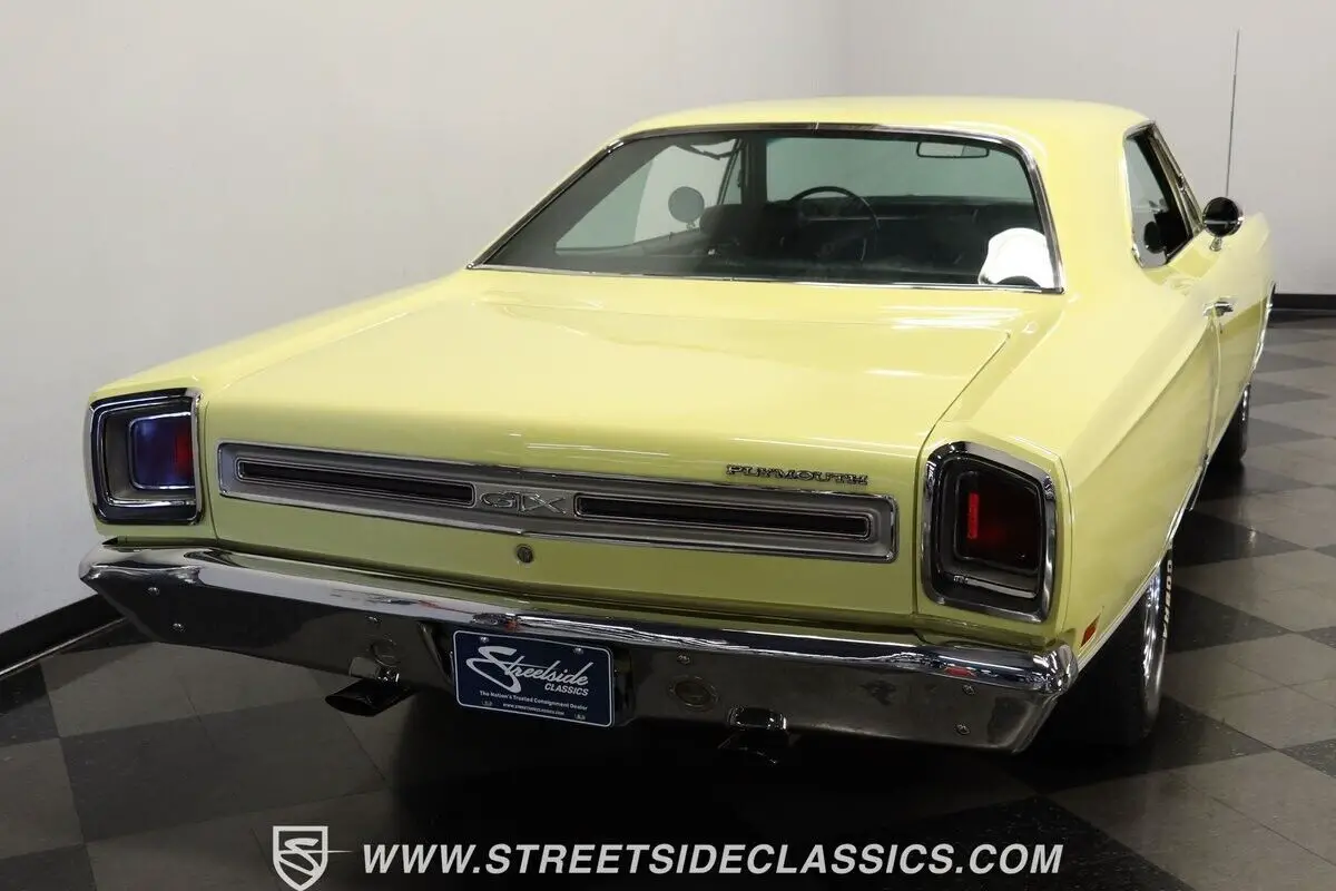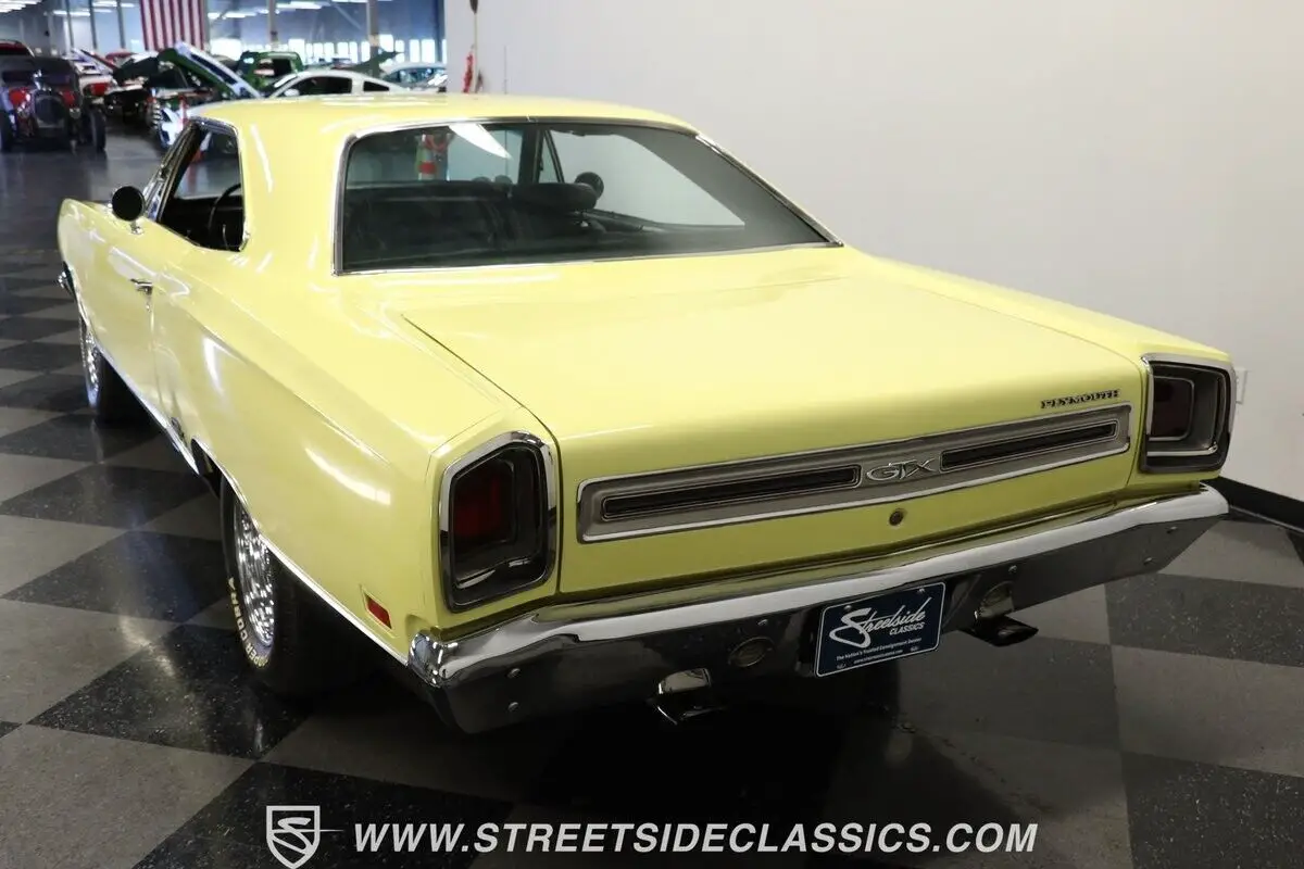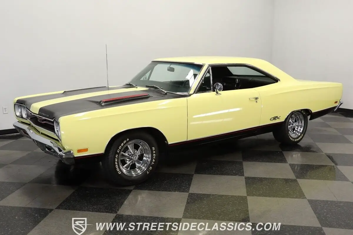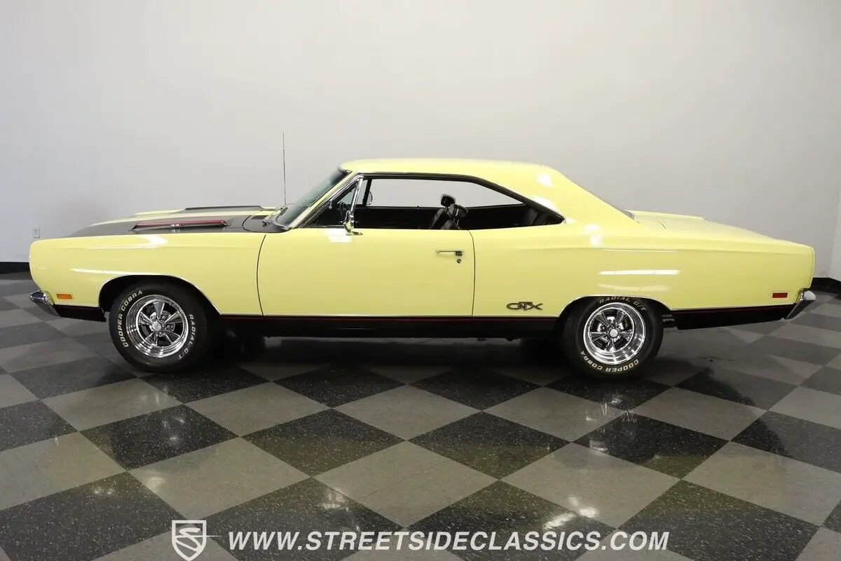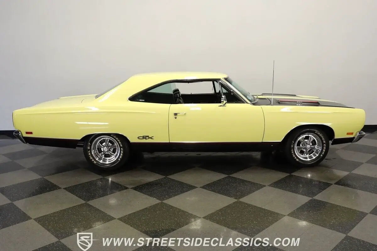 Vehicle Original VIN : RS23L9G2115644913-TPA 1969 PLYMOUTH GTX HIGHLIGHTS: • Numbers-matching 440 Super Commando V8 Engine • A727 TorqueFlite 3-Speed Automatic Transmission • Holley 4-Barrel Carburetor • Borgeson Power Steering • Power Front Disc Brakes • Flowmax Exhaust System • R134a Air Conditioning System • Sunfire Yellow Paint • Black Accent Stripes • 15" Cragar Wheels with Cooper Cobra Tires - 215/70R15 Front, 255/60R15 Rear • Chrome Bumpers and Trim • Black Interior with Bucket Seats • Center Console • Factory Gauges • AutoMeter Engine Temperature and Oil Pressure Gauges • AM Radio • Power Steering • Original Rally Wheels with F70-14 Polyglas Redline Tires • Owner's Manual • Service Manual • Build Sheet • Body Tag Documentation