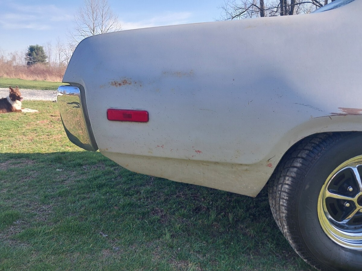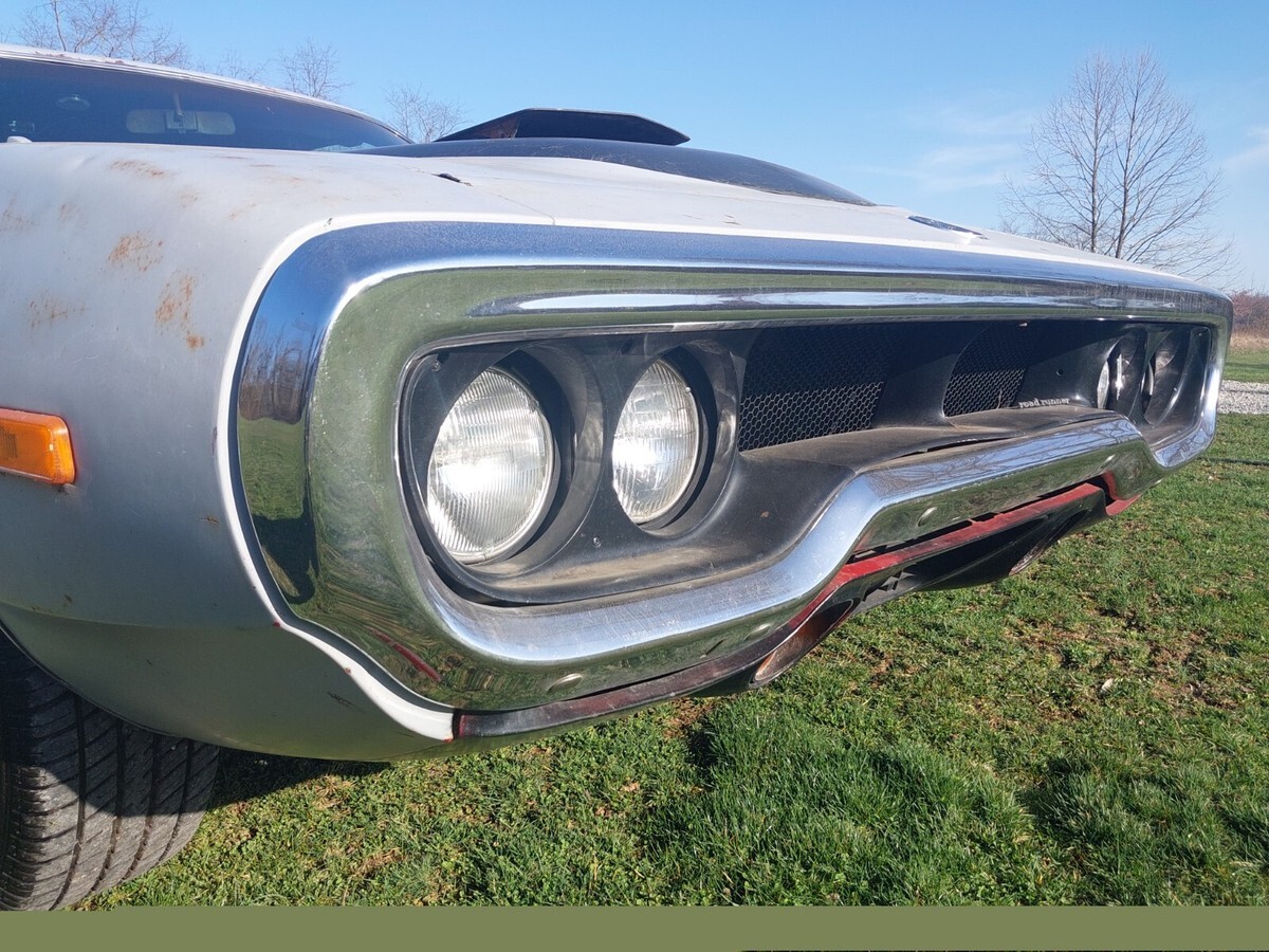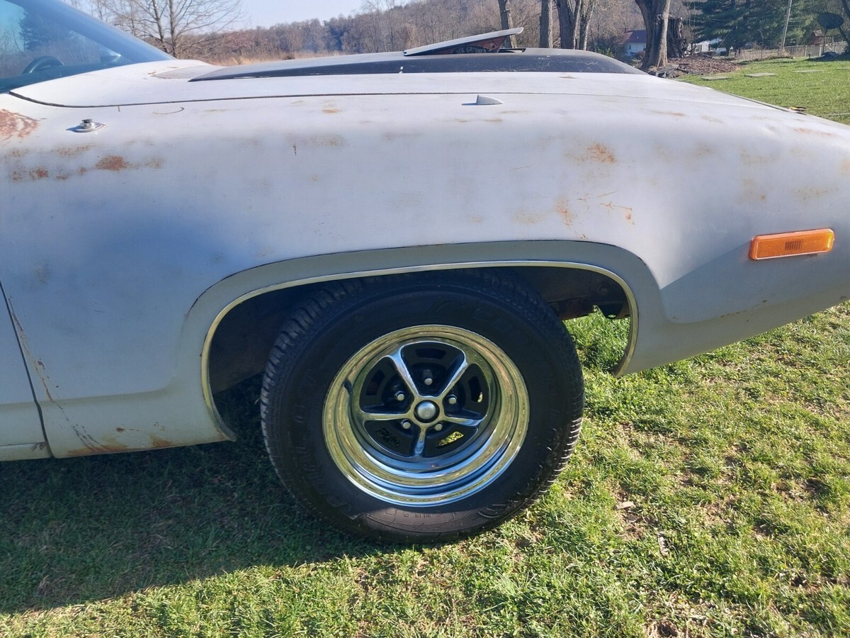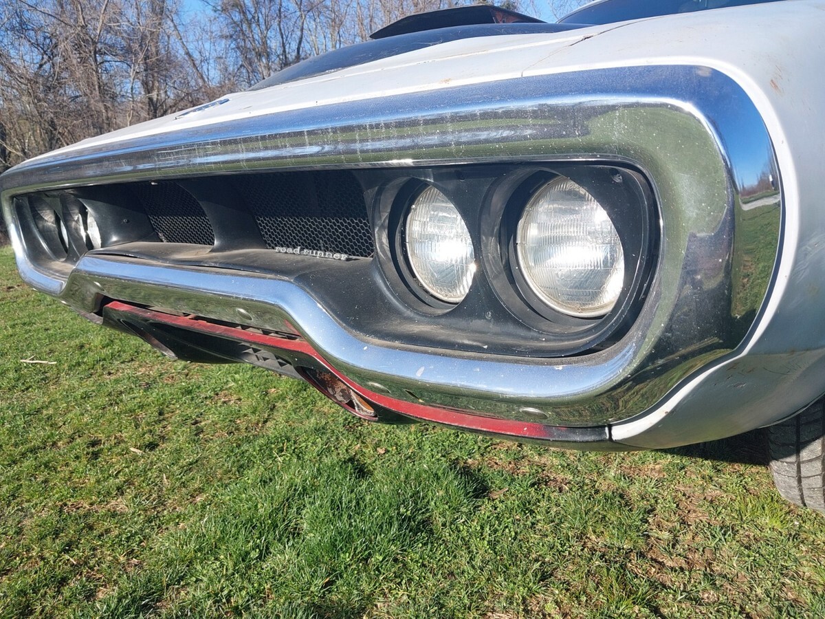 Up for auction is a very complete, very well optioned, unrestored, running, driving, 1 of 906 1972 Plymouth RoadRunner N96 Air grabber, 400, 4Spd console cars. Other options on the car include fender mounted turn signals, tuff wheel, inside hood release, rear defogger, buckets, rear speaker adjust, tach dash, black interior with buckets and Gf7 green outside.This bird runs and drives great ! Is originally GF7 green then at some point the exterior was painted red, including top of engine, then someone in the past stripped all the red off the exterior and primed the whole car, then parked it where it sat from about the late 80's till the late teens when the guy I bought it from aquirred it. Pretty much everything works from the buzzer to the lights to the reverse light on dash to the tach, blinkers, dash lights, wipers, ect..and is a perfect candidate to just continue to enjoy and drive in its raw form, as you work on it and restore it at your pace, as they don't all have to be immediate perfect trailer queens.Nearly all the hard to find and expensive stuff is present on this car, from the original nearly perfect 72 RR grill, to the original Air Grabber hood (which is functional) the ag vacuum canister, AirGrabber switch ( switch is functional but needs new vac fittings on back, hose kit ect..) and solenoid is present. Air cleaner and base are missing.Rear defogger switch is present but the fan on the rear panel is not. Tach works (slowly) as does the speedometer, temp gauge, fuel gauge will jump when grounded at sending unit. Front buckets are in good shape, bottoms will need recovered, back seat is in very good original condition. All seat belts are present.Console and pistol grip handle is from Tony's Mopar parts. A top plate is not present or included. Carpet presently in the car is a new correct 4 spd console carpet that I mistakenly ordered wrong, and mistakenly cut for a 72 bench seat 4spd car I have, but would of been correct for this car being a console 4spd prior to me cutting.. So I used it for this car for the time being.All lights, including dash, high/low beam, turn signals, dimmer, ect.. are functional.Over all this is a very solid car. Fenders, fire wall, cowl, torsion mounts, front and rear frame rails, rockers, hood, deck lid, trunk floor, rear deck filler, lower front valance and rear dual cutout valance, doors, and roof are all very solid and straight. Passenger door has a small rust area on inside lip, but overall a solid door.Driver side will need the typical lower rear quarters replaced as will the passenger side. Passenger side should receive a quarter or 1/2 quarter, but that's up to the new owner to decide. Rocker panels are solid and straight from lower rear quarter lead seam fwd.See pictures for floor. Over all the floor is in great shape and very solid. I did replace the section under the foot area of the driver floor up to the seam. Passenger side just a palm size patch will be needed when ready to do so, but, a full passenger front is included for new owner to cut from.Glass is all good. Passenger side door has a small rust spot on the lower inside corner on the latch side of door, but other wise solid. Only other mentionable rust is a easily repairable 1/2 dollar size spot on the drivers inner fender ahead of the seam. Both front and rear bumpers are straight, solid with typical age stains and pits and are good candidates for rechome or, prep for body color which was my path. All trim on the car is in very nice shape. It is missing the upper door trim piece on both sides.As far as drivability goes, it does run and drive very well, ive put about 1000 miles on it over last few yrs and will continue to add to that till it sells. I installed new pirate jack 4 wheel disc brake conversion kit, new InlineTube full brake line kit, new master cylinder, new hoses, fittings, etc...New rear shocks,New fuel tank, and sending unit, new Speed demon carb ( modern thermoquad ), the thermoquad that was on it was incorrect for the car, new fuel pump, new water pump and belts. 4 new cooper tires on 15x7 front 15x8 rear magnum/road wheels.As far as numbers go, this road runner has its original fender tag, but no build sheet was found yet. Core support matches the dash, cowl, title and fender tag. The 400 in the car is a correct 72 400 big block and is about as close to numbers matching as it gets, only being 32 numbers off the vin of the car. Maybe this car left the factory with this block and the car that was built 32 cars ahead of this one is still out there and has this cars block, but, it is what it is, 32 numbers off the vin of the car and is Not numbers matching. See pics of engine #s. Trans is not matching to the car but is a 23 spline with the correct shifter mechanism and rods. Shifts excellent. 8-3/4 323 rear.All in all this is a very complete running driving un restored one of 906 very well optioned real 1972 big block 4spd N96 Road Runners. I do my best to describe what I have for sale, but I'm sure I've missed a few things that you'd like to know so don't hesitate to ask any questions you might have. If you would like more pics of anywhere on the car, to see the car before the end of auction, or any more info let me know. As far as payment goes, other than the non refundable deposit of $500.00 due once auction ends, I will only accept cash or direct wire transfer for remainder of payment. No other forms of payment will be accepted. And full payment must be made within 7 days of auction end. Wire or any form of payment must fully clear before vehicle or title will be released. I do not offer shipping but will assist where I can.As expected with a 50+ year old unrestored car there are no warranties or guarantees written, expressed or implied.Auction may end at anytime. Bidders with zero or negative feedback please contact me prior to bidding or your bid will be removed.Thanks and good luck with the auction.