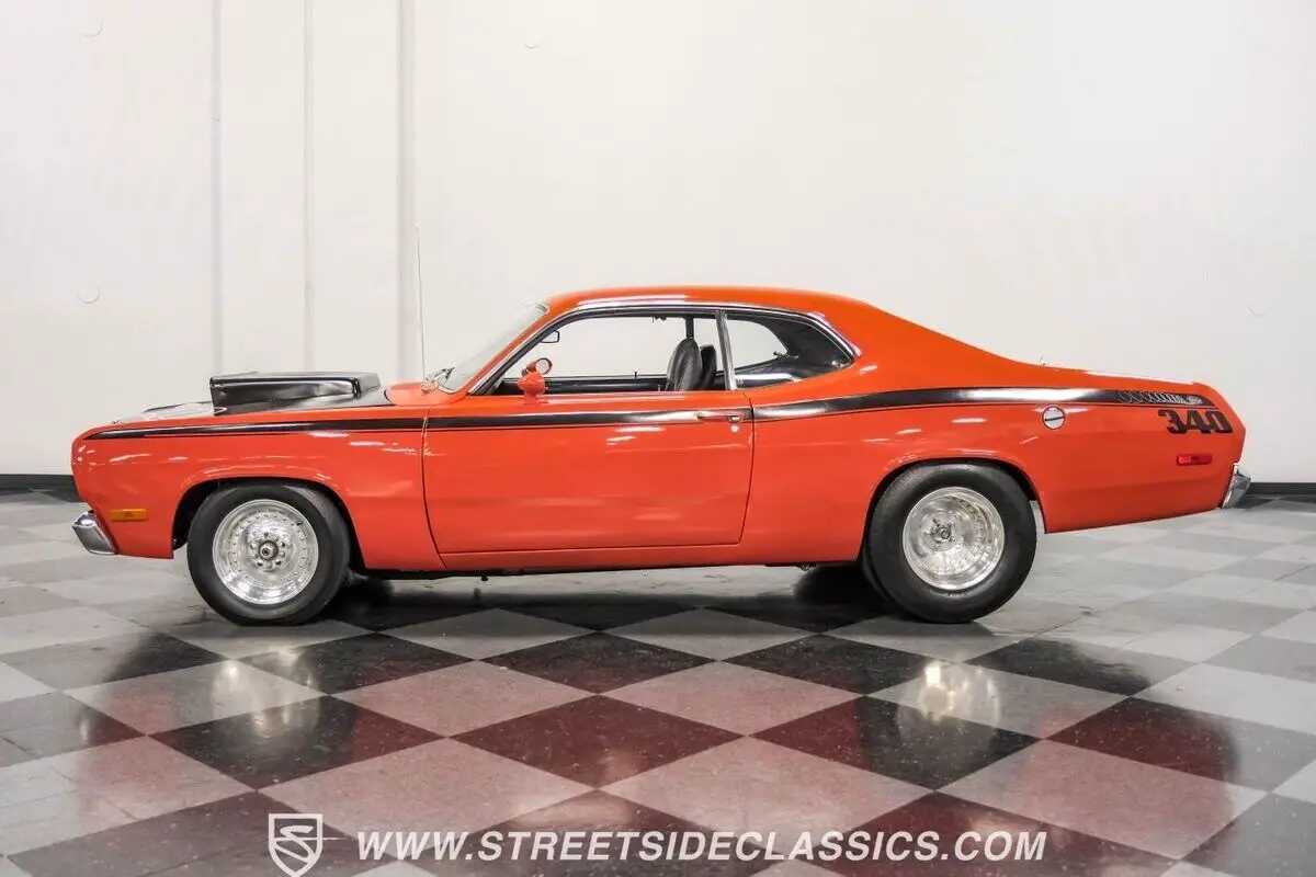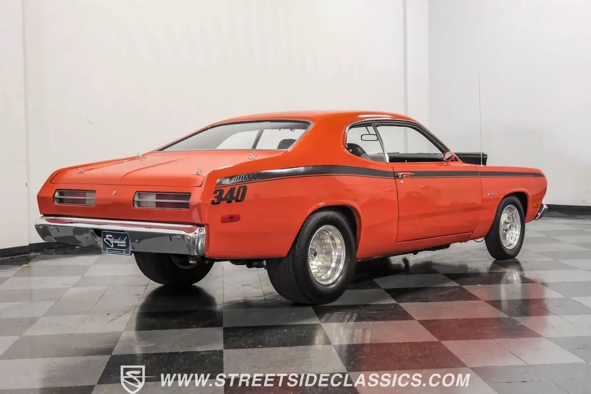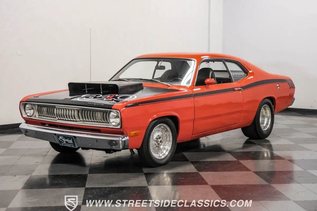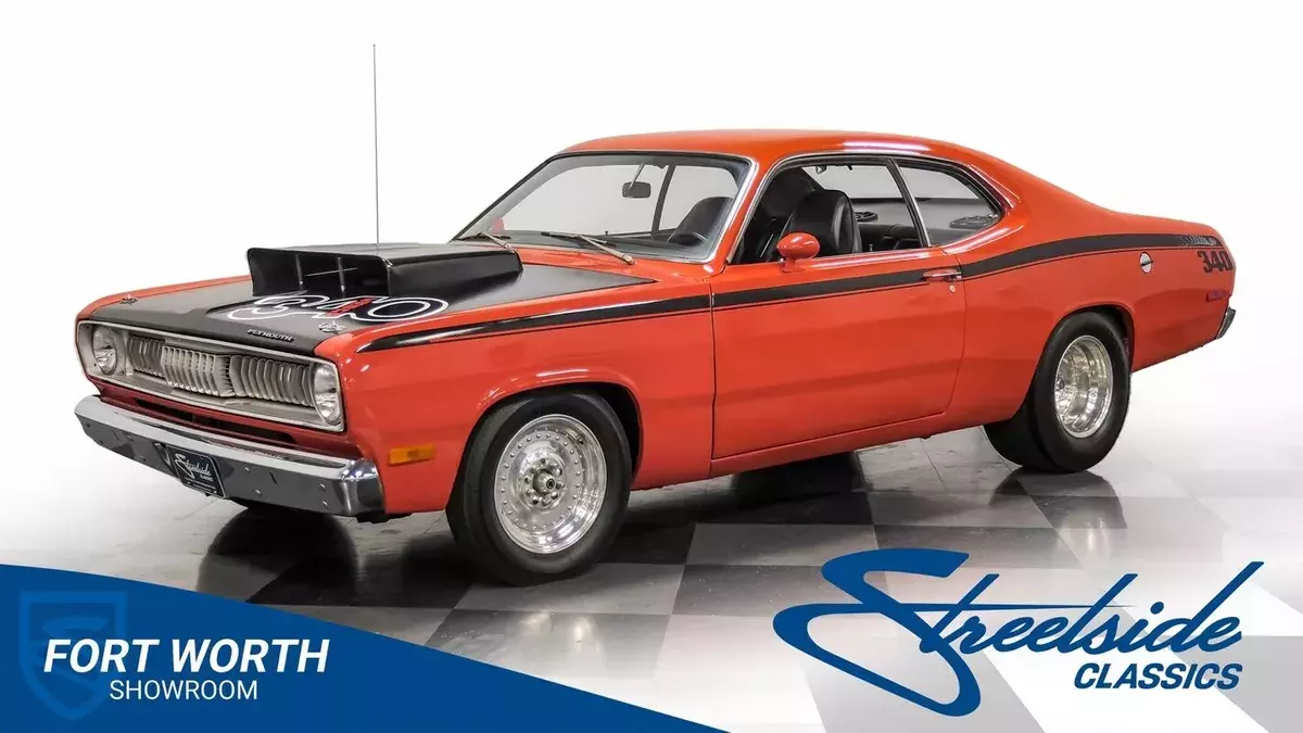 Vehicle Original VIN : VS29H2B371247Packing Mopar's potent 340 V8, this 1972 Plymouth Duster Pro Street displays an aggressive, track-ready stance that makes its performance intentions clear. The orange exterior with black accent stripes and hood create a classic muscle car color combination that demands respect on the street. Large functional hood scoop channels air while the lift-off trunk lid reduces weight for maximum acceleration. Rolling on 15" Centerline wheels wrapped in 5.60-15 PRO-TRAC front tires and N50-15 PRO-TRAC rear tires, this Duster sits perfectly with its competition-inspired stance and race-ready proportions. Black vinyl bucket seats anchor an interior built for serious driving duty. The clean, straight dash houses the stock gauge cluster alongside Bosch under-dash gauges that provide critical engine information. A race-style steering wheel and Hurst shifter with B&M T-handle put precise control at your fingertips. The factory radio remains on display in the dash, maintaining the period-correct appearance. Black carpeting completes the purposeful cabin that's ready for action. The 340 V8 engine delivers impressive power through the 4-speed manual transmission. Performance enhancements include an Edelbrock carburetor, aluminum intake manifold, and long-tube headers flowing into straight pipes for an aggressive exhaust note. The sophisticated suspension system features tubular control arms with coilovers up front and a 4-link with coilovers in the rear, allowing precise handling adjustments. Rack and pinion steering and 4-wheel power disc brakes improve control, while the 9-inch rear end handles the power delivery with ease. HIGHLIGHTS: • 340 V8 Engine • 4-Speed Manual Transmission • Edelbrock Carburetor • Aluminum Intake Manifold • Long-Tube Headers • Straight Pipe Exhaust • Electric Fuel Pump • Aluminum Radiator • Tubular Control Arms with Coilovers (Front) • 4-Link with Coilovers (Rear) • 9-Inch Rear End • Rack and Pinion Steering • 4-Wheel Power Disc Brakes • Orange Paint with Black Decal Stripes • 15" Centerline Wheels • Functional Hood Scoop • Hood Pins • Lift-Off Trunk Lid • Black Interior with Bucket Seats • Hurst Shifter with B&M T-Handle • Factory Dash w/ Bosch Under-Dash Gauge Cluster This 1972 Plymouth Duster Pro Street combines classic muscle car style with serious performance hardware. Built around a Mopar 340 V8, upgraded suspension, and race-ready components, this orange beast offers both street presence and track capability. Call today!
