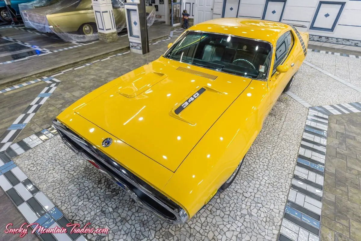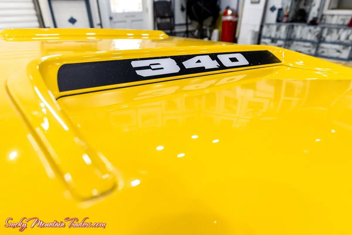 We will start off with the exterior of this Road Runner. The body on it was meticulously prepped and fitted during the restoration. It resulted in one of the straightest and best fitting Mopars we have ever had the pleasure of owning. It's showcased in the factory optioned Lemon Twist Paint Scheme that was redone in base coat clear coat. The paint is buffed and polished out to stunning finish that's slick as ribbon. The Lemon Twist yellow is accented by the Black Transverse stripes and Black Spolier that are both factory options for it. This is a factory 340 car that is equipped with the correct hood and comes with dual mirrors. Both front and rear bumpers have a brilliant finish and excellent fit. All the glass is phenomenal and new seals and weather stripping were installed at the time of the restoration. To finish off the stance it's sitting on a set of custom built Billet Specialty wheels with 18" on the front and 20" on the rear, and it has a new set of Toyo tires.