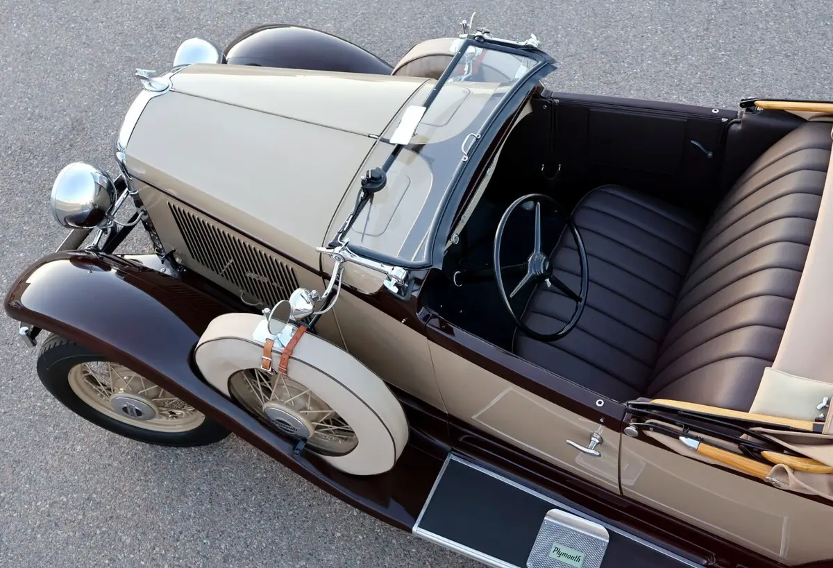 Plymouth and Dodgewere both brands of Chrysler Corporation (and later Daimler-Chrysler), they often shared platforms and even models, resulting in many Plymouth cars being virtually identical to their Dodge / Chrysler counterparts. This 1931 Plymouth PA Sport Roadster for sale here was professionally restored a few years ago by an avid prewar car collector, car features Dual Side Spare Mounts and Rumble Seat, 6 wire wheels and new Firestone Classic tires, super clean engine compartment, brand new interior upholstery matching the exterior - same inside rumble seat area, beautiful 2 tone paint job in excellent condition, vintage tan and dark maroon/brown fenders + trim and tan wire wheels matching the body. Only 2680 Plymouth PA produced, the small number makes this prewar beauty a very rare car. Features a luggage rack and metal trunk chest, chromed grill shell and flying lady hood ornament, cowl lamps and headlights in good working order, amber vintage fog lights, new convertible top made out of quality canvas and matching spare tirecovers, dual side mirrors with leather straps, Plymouth logo wheel center caps, polished aluminum steps installed on the solid running boards left and right, folding down windshield for extra air when driving the car on a nice warm day, car also comes with a pair of side curtains (windows) if that nice summer day will turn into a rainy one. Runs and drives very good, engine fires up right away within every key turn, powered by a 3.2 L - 196 ci Inline 4 Cylinders with an outcome of 56 hp, floor shift manual transmission and 4 corners hydraulic brakes, super clean undercarriage.... the asking price is much lower than what was spent to restore it - and that does not include the hundreds of hours of passionate labor in order to bring it back to it's prewar original condition! This rare piece of automotive history is ready to go to a new home and be enjoyed, car comes with an instructions book / manual and a clean Arizona title, registered as 1931 Plymouth Roadster 2 door Convertible.