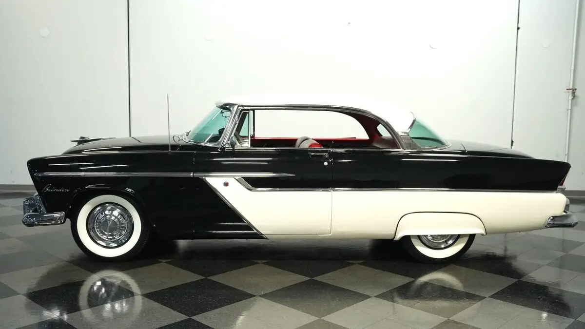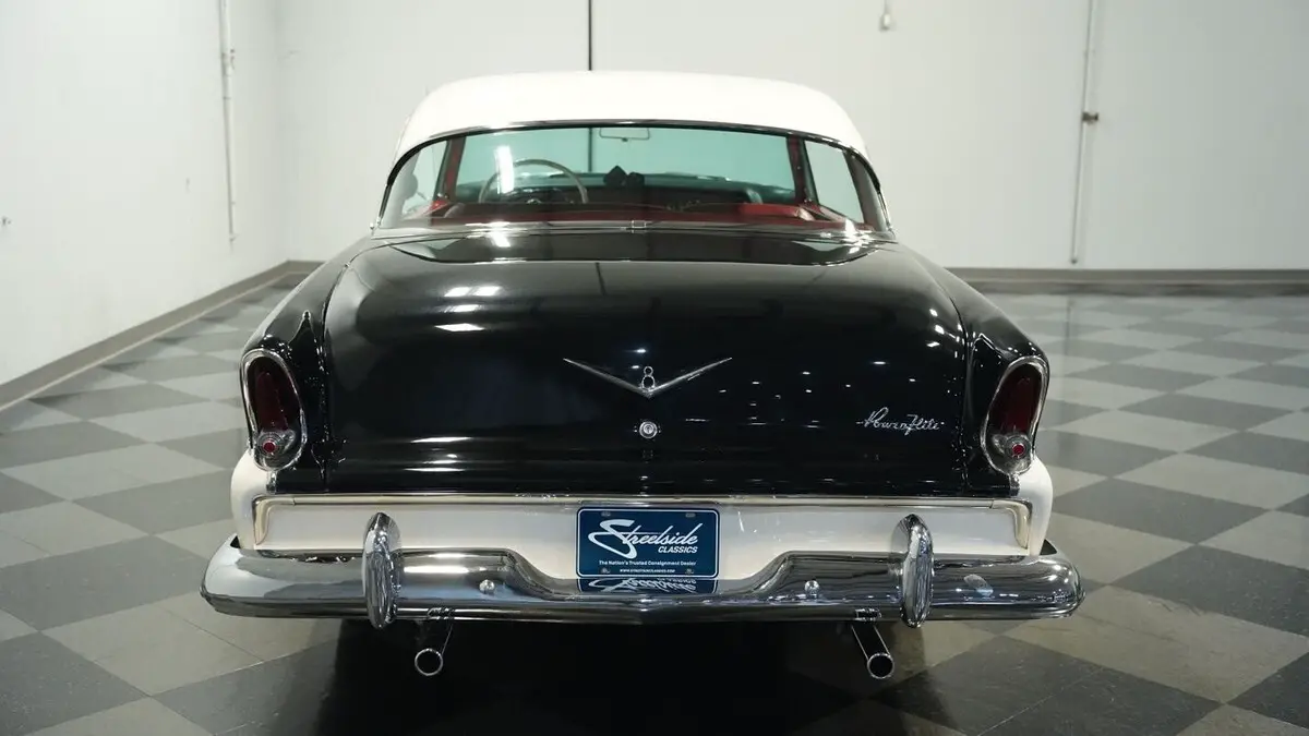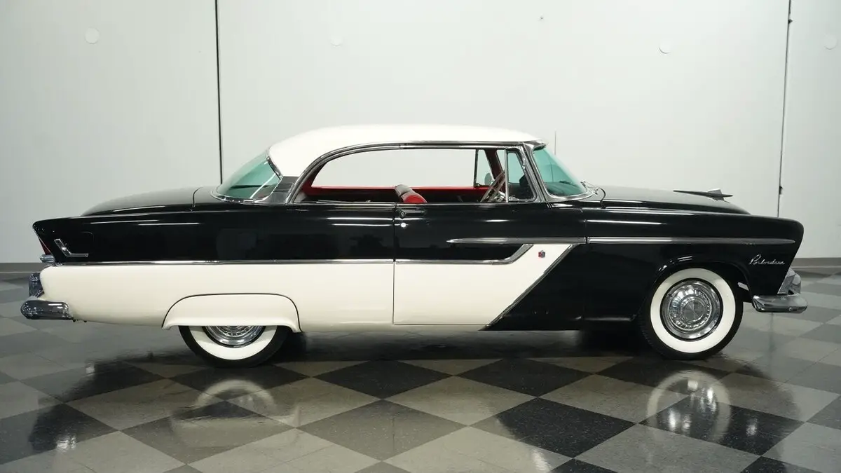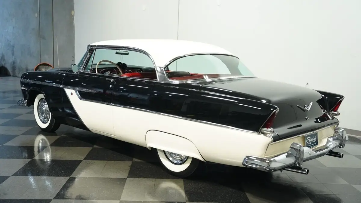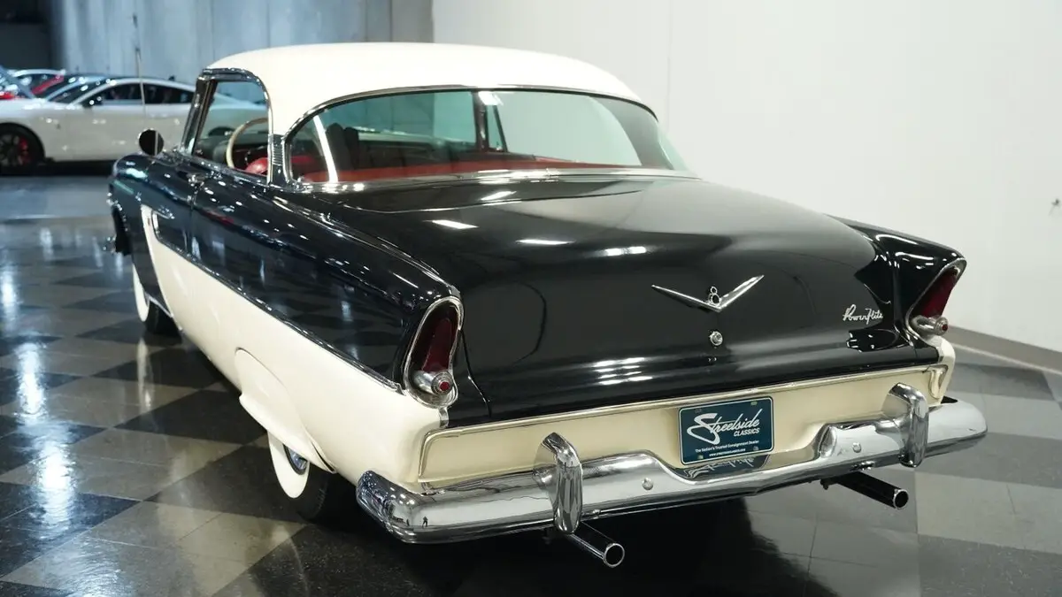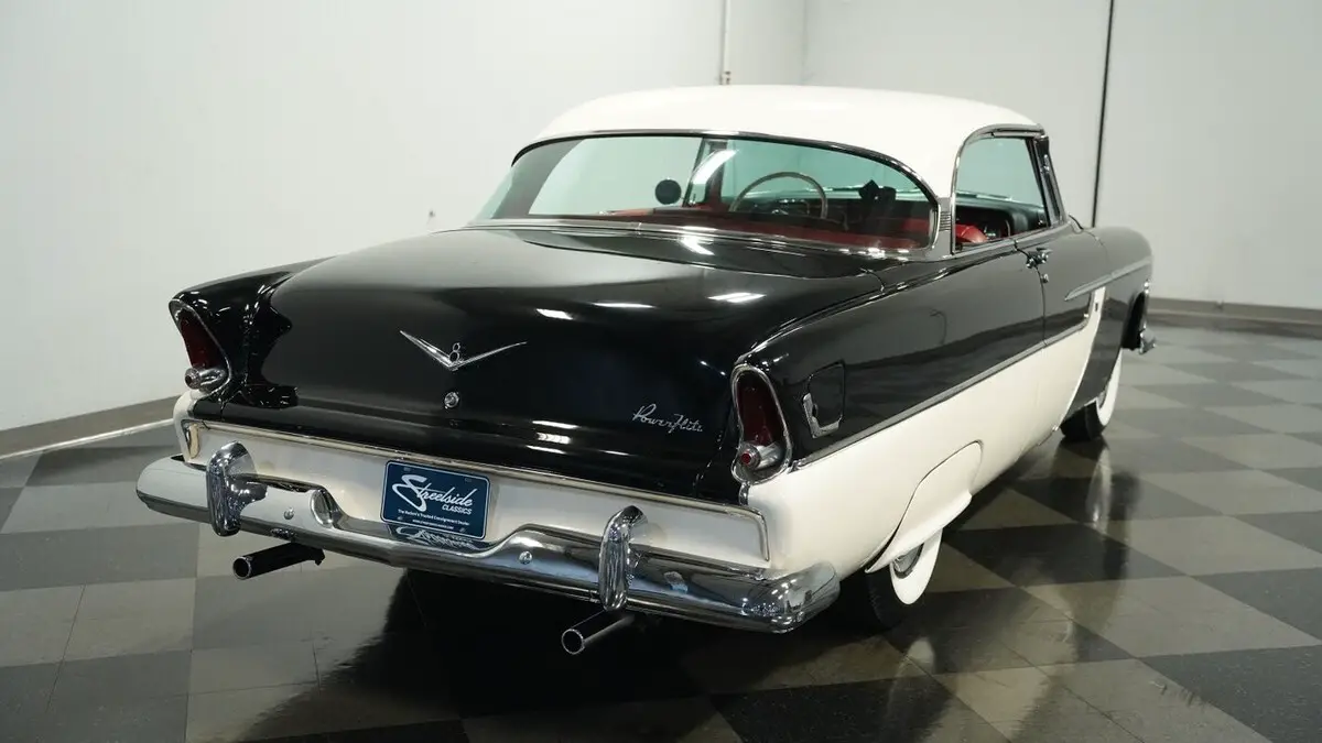 Vehicle Original VIN : 22220298• 259 CI V8 engine • 2-speed Powerflite automatic transmission • Single 2-barrel carburetor • Dual exhaust with aftermarket mufflers • Drum brakes • Coil spring front suspension • Leaf spring rear suspension • Two-tone black and white paint • Chrome body trim • Fender skirts • Tailfins • 15-inch wheels in 6.70-15 whitewall tires • Red Interior with Split-bench seating • Column-mounted shifter • Factory AM radio • Air conditioning • Custom floor mats