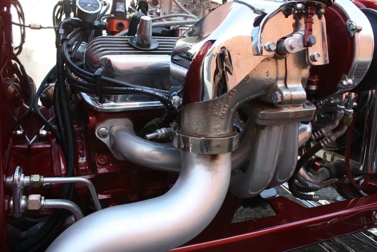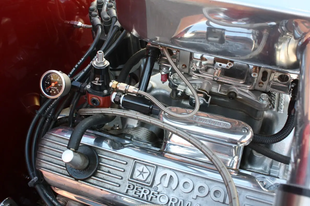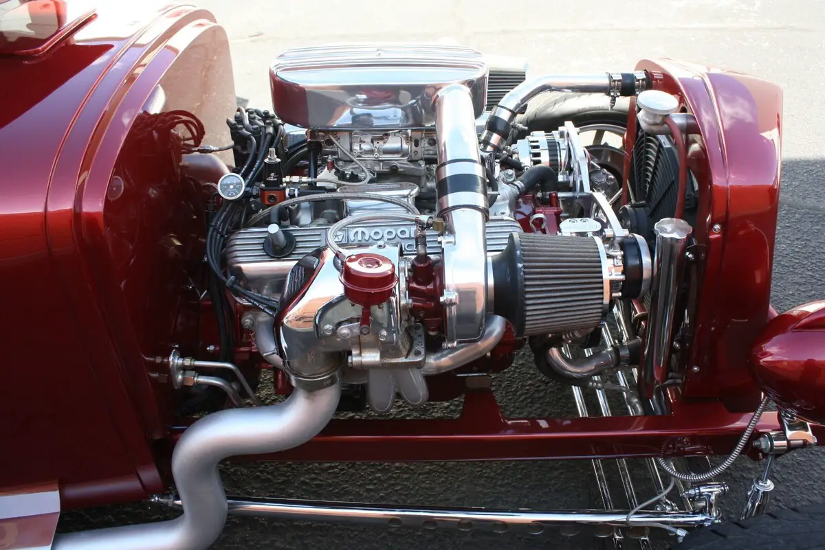 a 340 Chrysler v8 built by Jamie Braden for street use. All of the best internals were used, including a forged Crank, and compression was kept at 8.5 to1 compression to allow it to run on pump gas. It does have Water/ methanol injection fitted but was never needed and never used. Twin turbos were fitted and push through a QuickFuel 4 Barrel Carburetor. Backed by a TH400 with shift kit built by Sharps Transmission. As radical as the car looks its actually very tame to drive, but watch out under full throttle when the turbo boost kicks in.