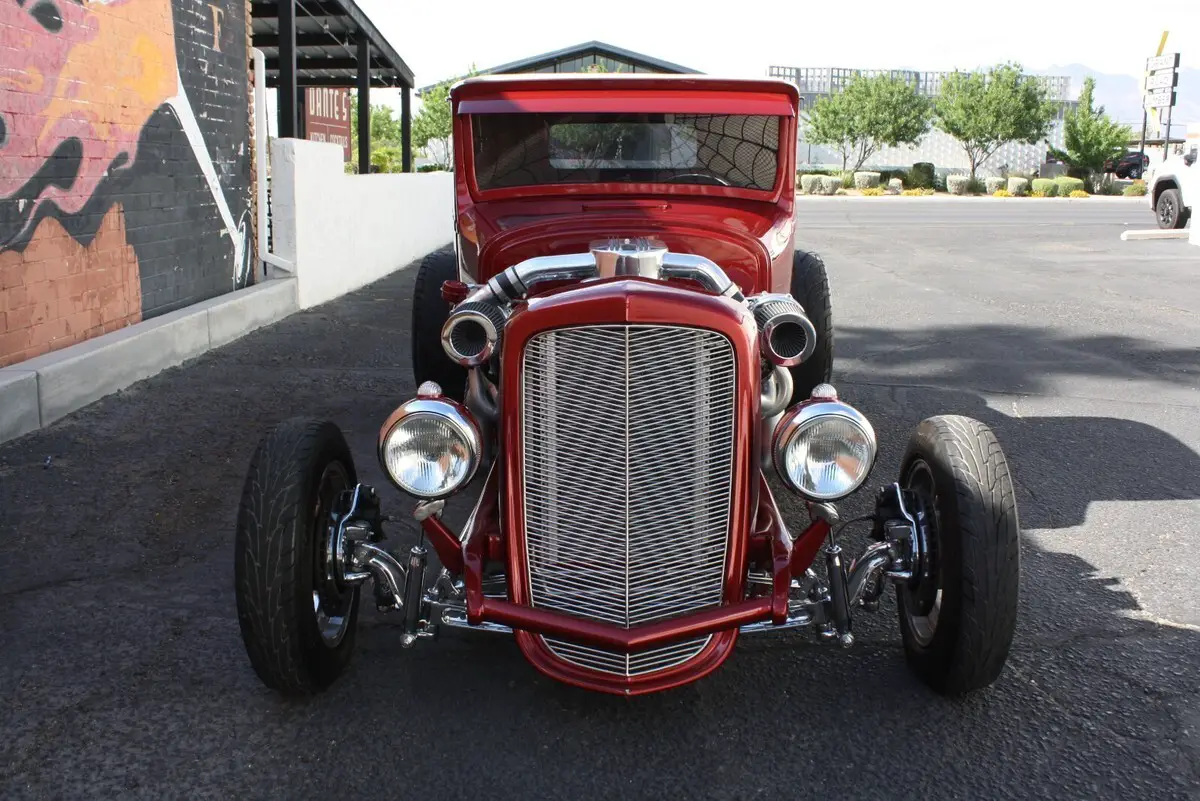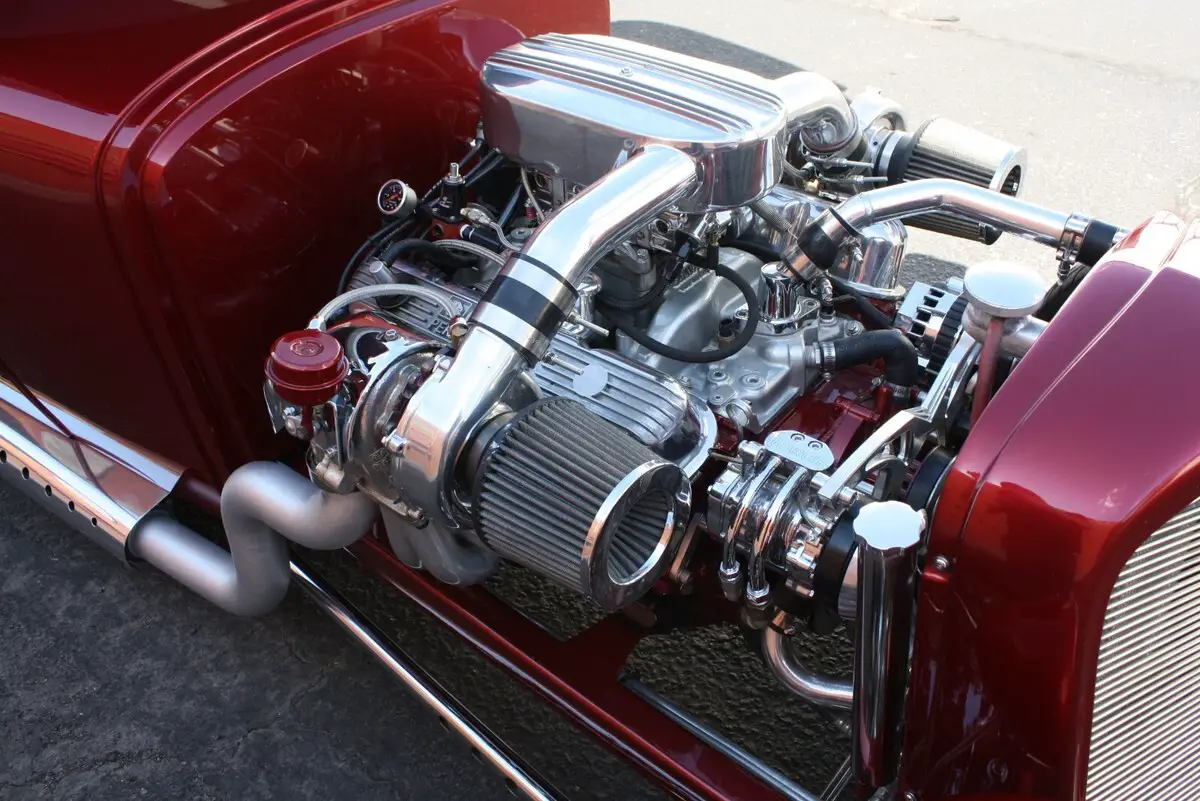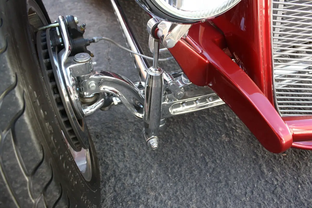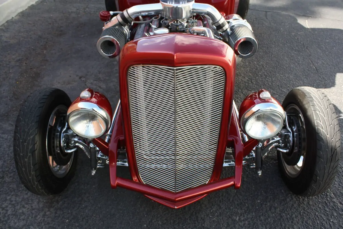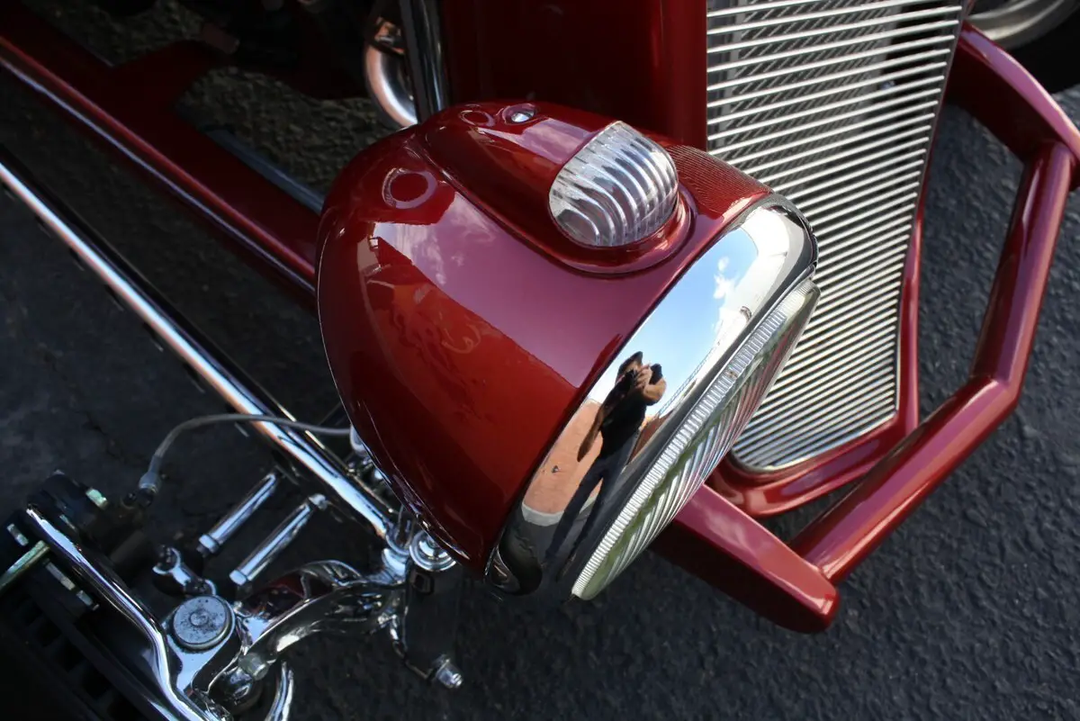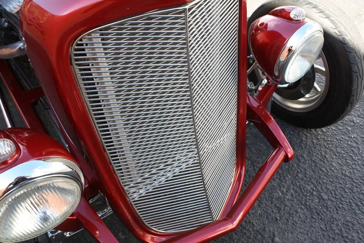 The steel 3 window body was chopped 3” and the doors were made to open suicide style with hidden hinges. The body was massaged to perfection assuring very straight panels and nice even and flush door and trunk fitment. The grille was completely hand made from scratch, the grille bars are polished stainless steel. Show quality “Candy Apple” paint was applied to body and frame, fully sanded and buffed for a show quality mirror finish.
