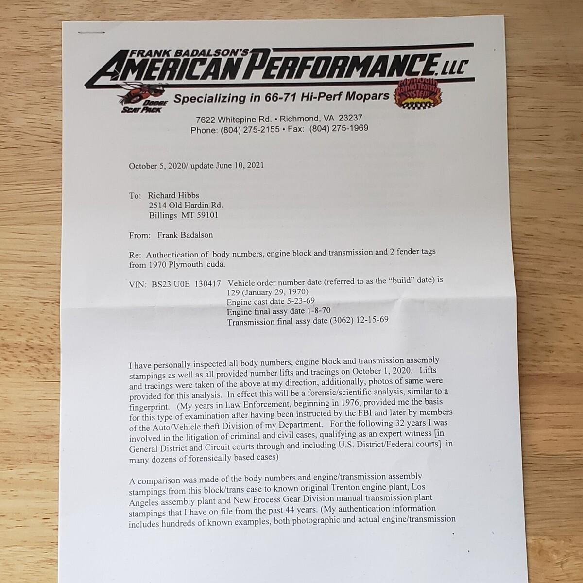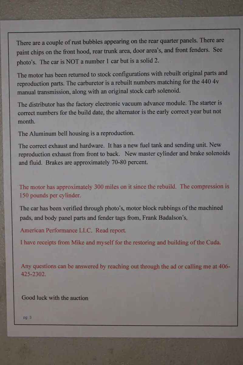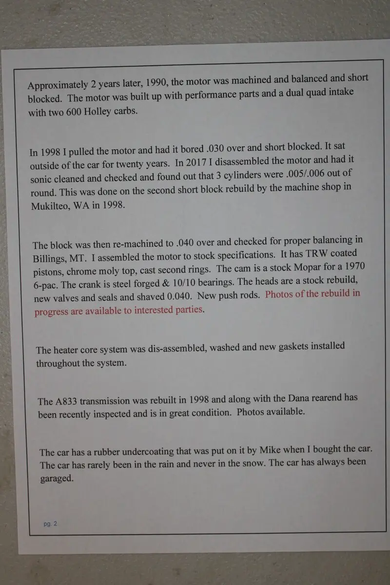 Read the letters in the picture section of the car to get a brief synopsis of my buying the car originally and the car authentication from American Performance LLC.The motor was recently rebuilt and put back to stock configuration. The original parts are the 6 pack rods, block, intake manifold, exhaust manifolds, oil pan, valve covers. New parts are, steel crank, Speed pro .040 pistons and rings, rebuilt heads, Cleavite rod and main bearings, cam and bearings, oil pump, shaft and bearing. Complete reproduction (Accurate manufacture) Exhaust. Rebuilt Starter, Alternator, and numbers matching Carburator.The only body work I found on the car was the left rear quarter panel was sectioned behind the wheel. You will notice the joining line in the photo's. When I bought the car, there was carpeting glued to the floor pan and side walls. Noticed it in 2019 when putting car back to stock configuration.Go to my website to see a lot more pictures than Ebay alllow's on this site. The vehicle is only on the website for pictures and is NOT being sold through the website. This is my personal car that I have owned since 1988.The web site is: beartoothhogsandrods.com.The motor sat outside of the car for 20 years until I started assembling it in 2017 and installed it in 2019.There are hard to find OEM parts on the car and some were rebuilt.There is no warranty implied or expressed on this vehicle.Sold as is, where is.The vehicle will remain in my possession until funds clear the bank for ten business days due to fraud and fake money orders being used to buy vehicles on the internet.I will not accept any trades whatsoever.This is nice car and you should be happy with the purchase.Call with any questions or concerns and I will answer to the best of my ability. If I do not answer, leave a message and I will get back to you as soon as possible.Richard Hibbs406-425-2302On Apr-30-24 at 18:01:20 PDT, seller added the following information: