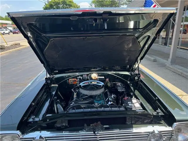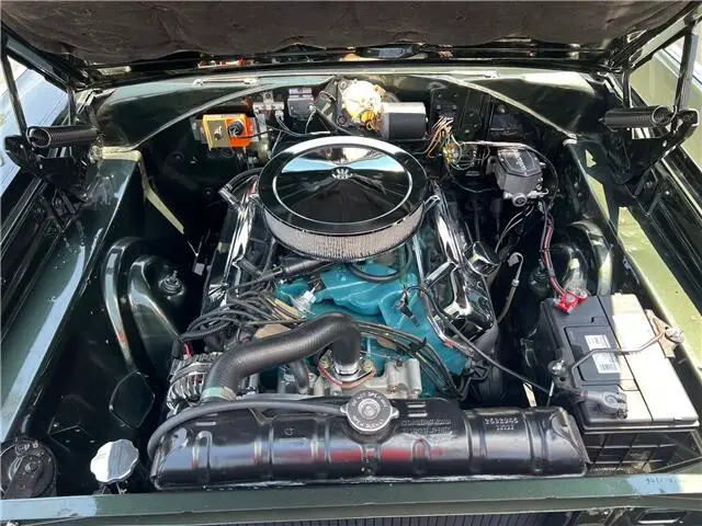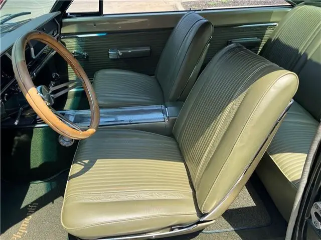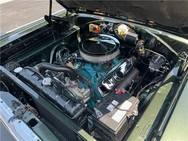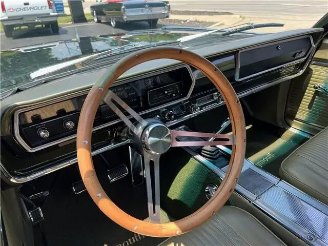 Recent Body-Up Restoration, beautiful factory (GG) Dark green metallic car, all new Legendary factory (P4Y) Citron gold vinyl interior, original 361 ci engine, factory (A883) 4 speed manual transmission, Carter 600 cfm 4 bbl, factory intake & exhaust manifolds, electronic ignition, chrome air cleaner & valve covers, Wilwood front disc brakes with slotted & drilled rotors, Mopar radiator with shroud, factory bucket seats with center console, wood steering wheel, factory dash & gauges, original am radio, factory shifter, dual exhaust, factory 8 ¾ 3.23 Sure Grip rear axle, new 235/70R15 BF Goodrich Radial T/A tires, new 15” chrome Magnum 500 wheels, fender mount turn signals, Mopar Muscle!