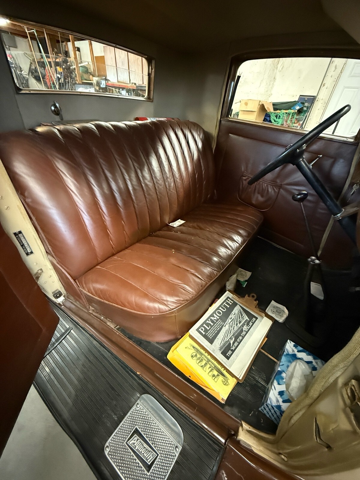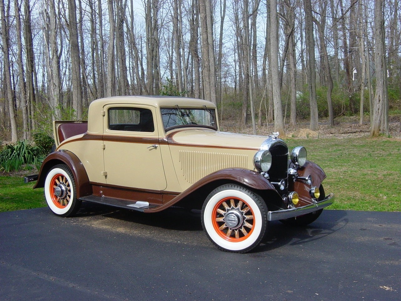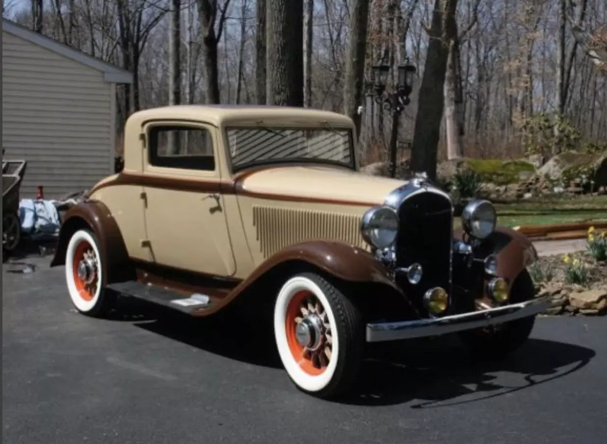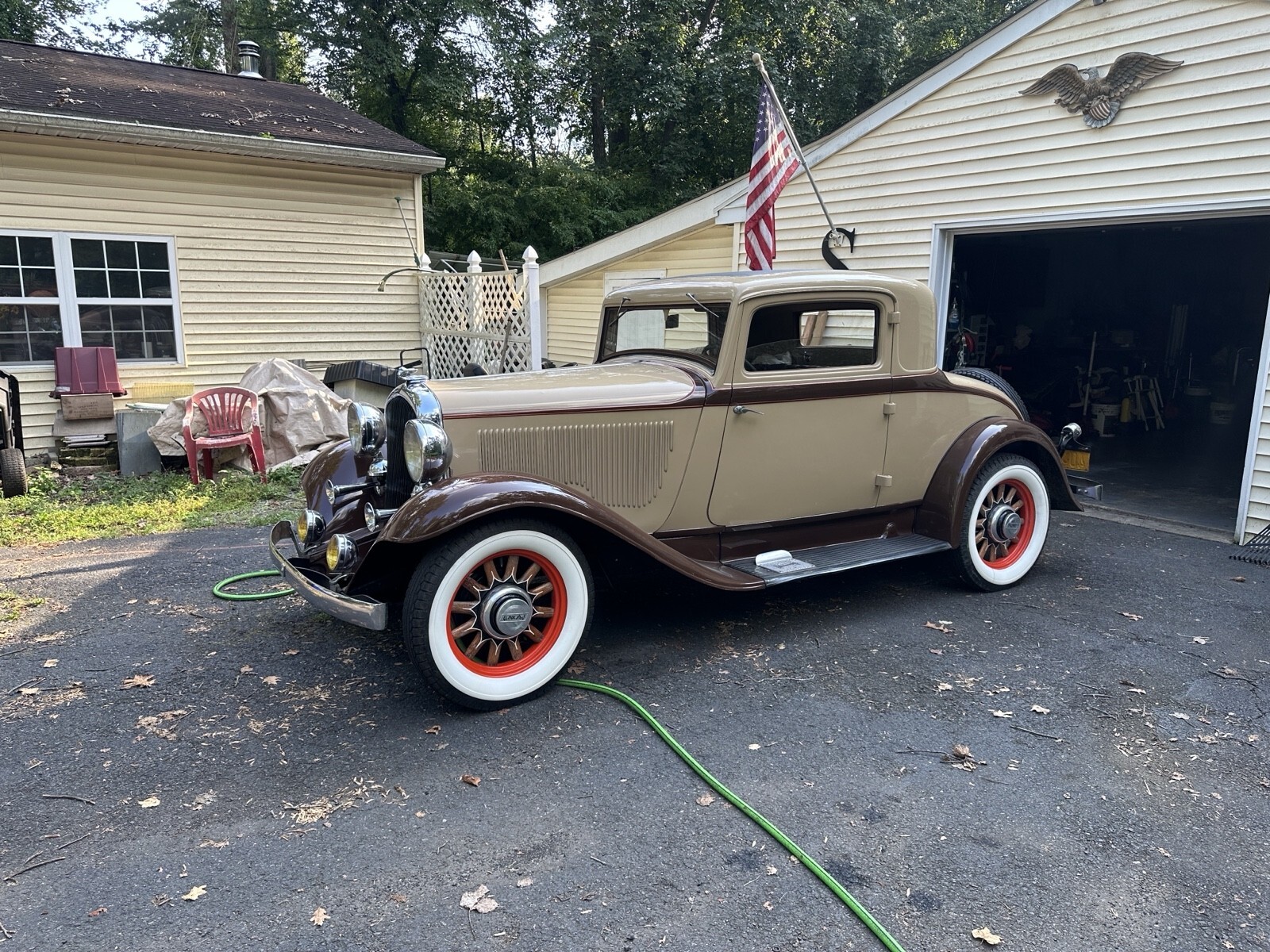 This 1932 Plymouth Model PB Rumble seat coupe is a classic car that has been restored to its original state. The owner has had it for over 60 years and has done a great job in maintaining it. The vehicle is drivable and is perfect for car shows. The color of the car is tan with chocolate fenders and orange pin striping and the title is clean. Make a response short and to the point.