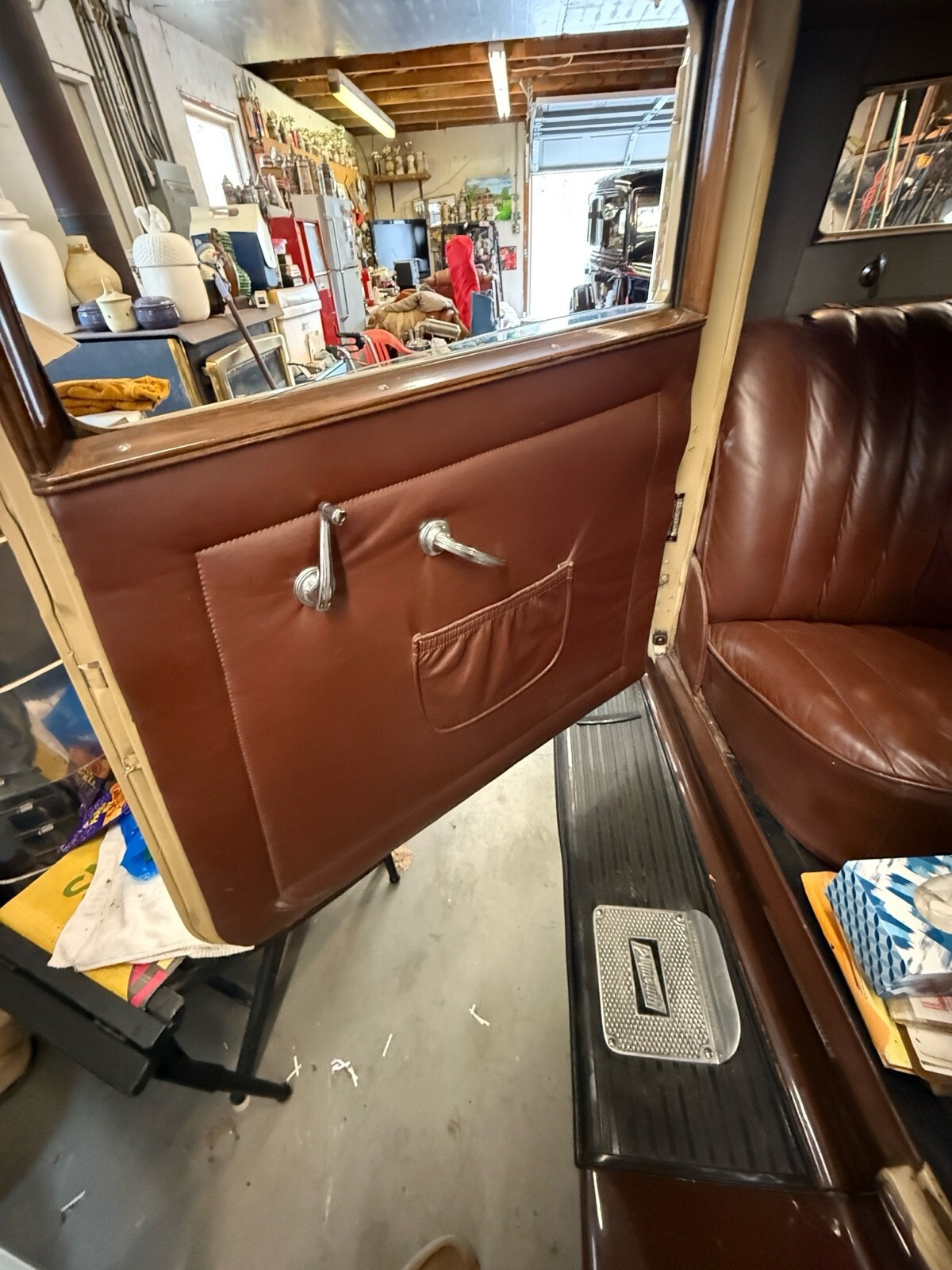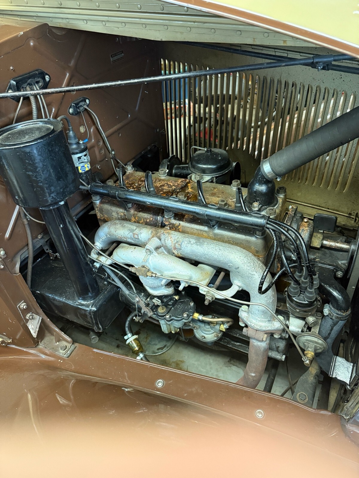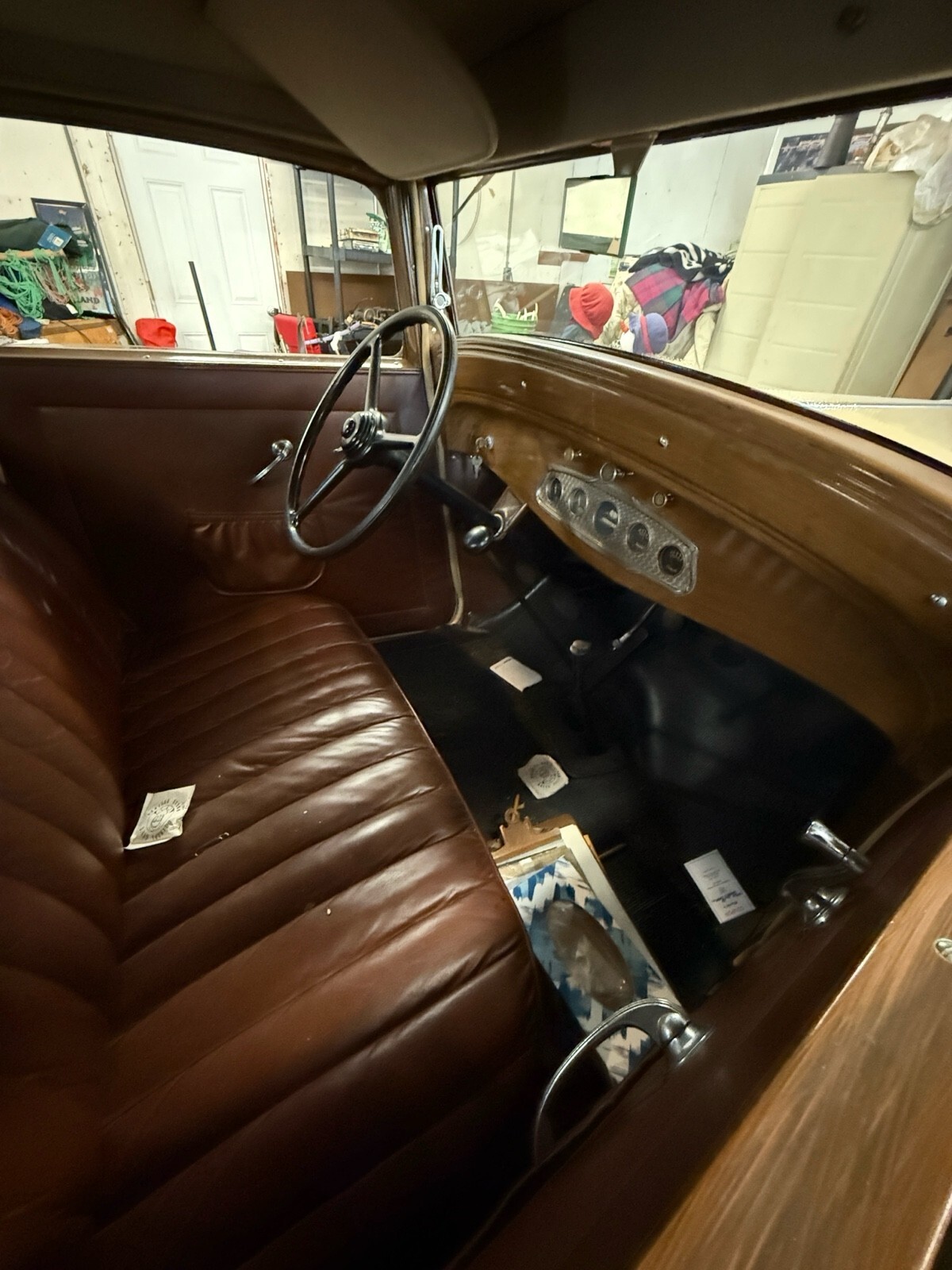 This 1932 Plymouth Model PB Rumble seat coupe is a classic car that has been restored to its original state. The owner has had it for over 60 years and has done a great job in maintaining it. The vehicle is drivable and is perfect for car shows. The color of the car is tan with chocolate fenders and orange pin striping and the title is clean. Make a response short and to the point.