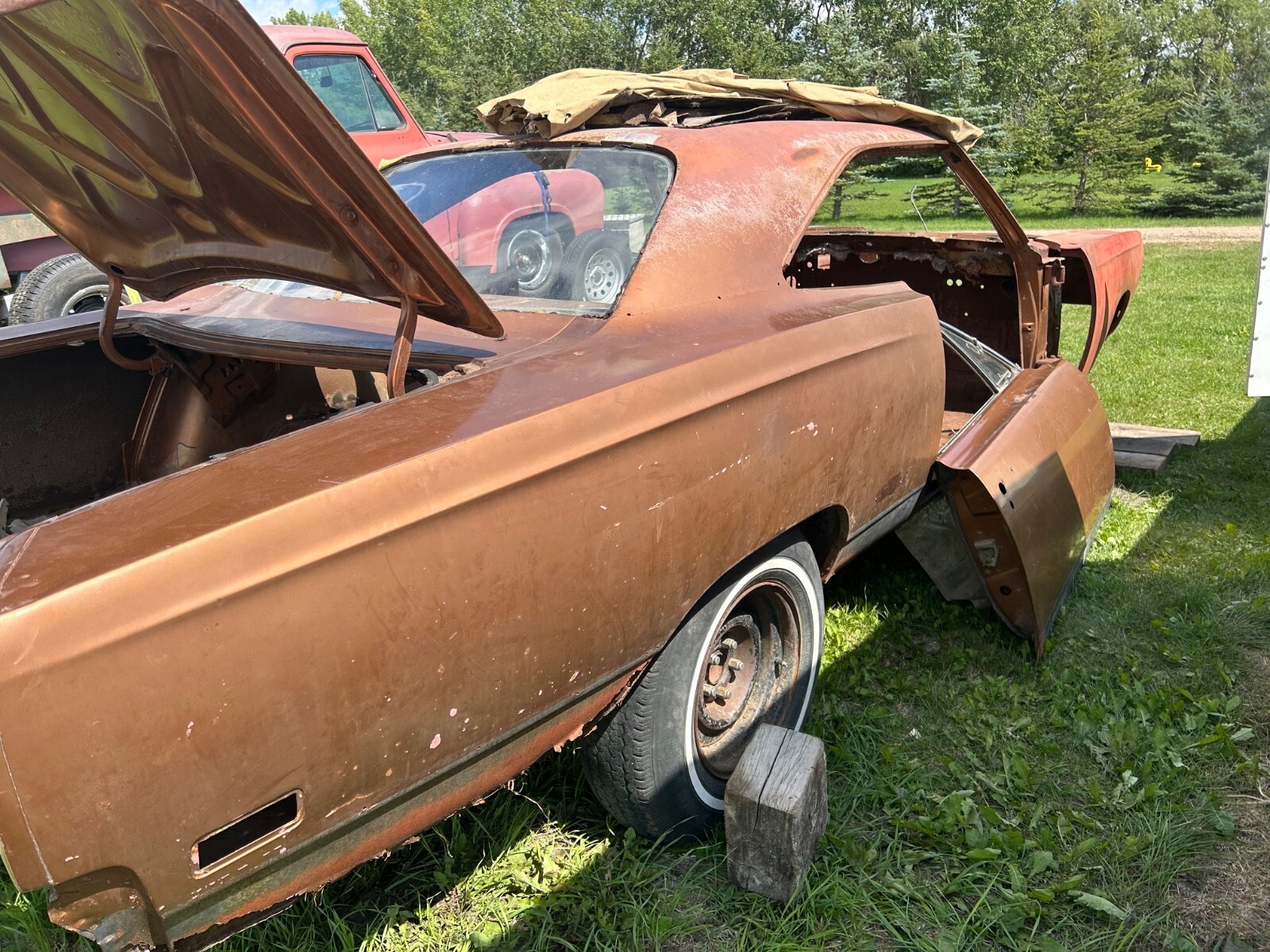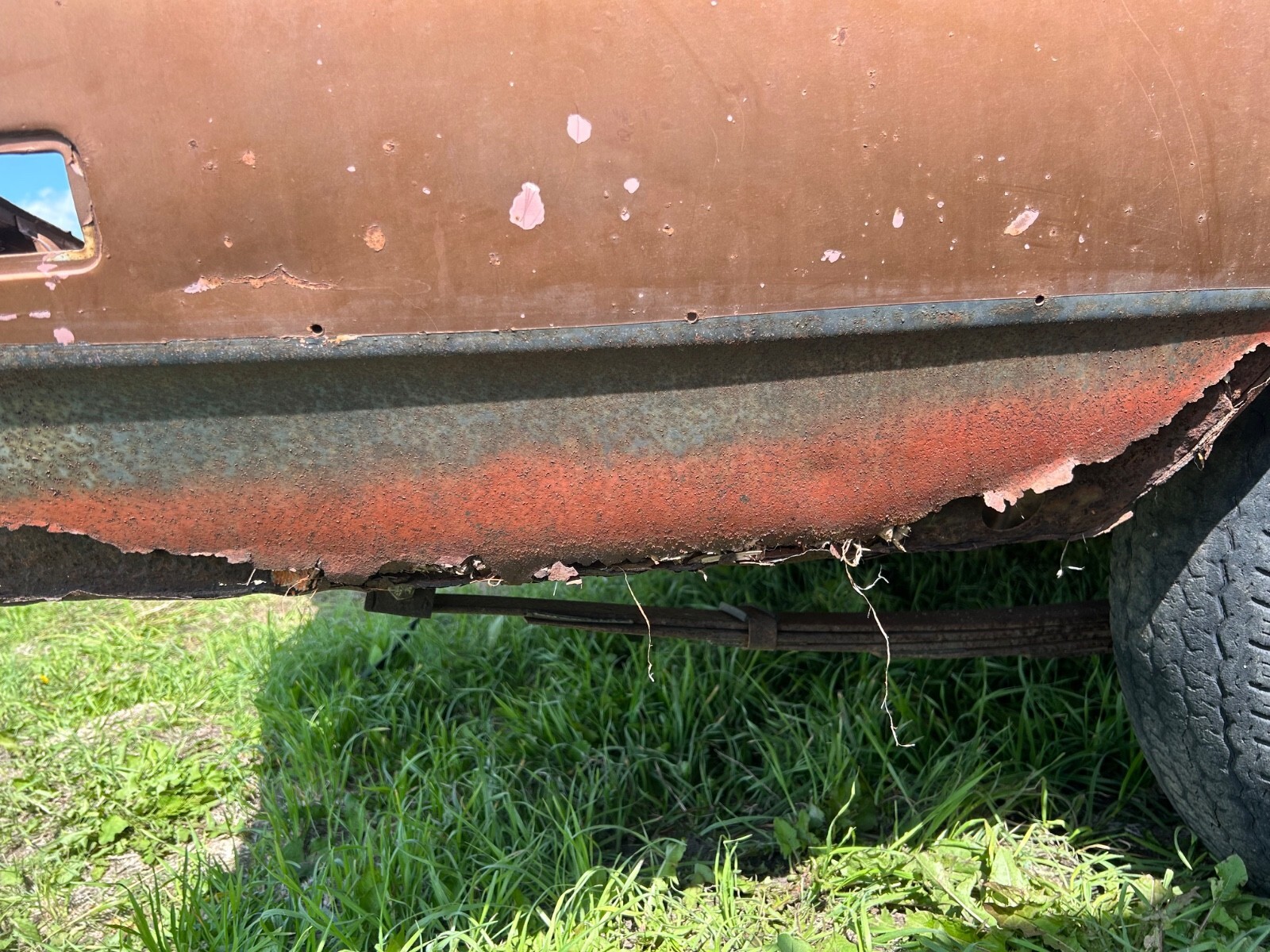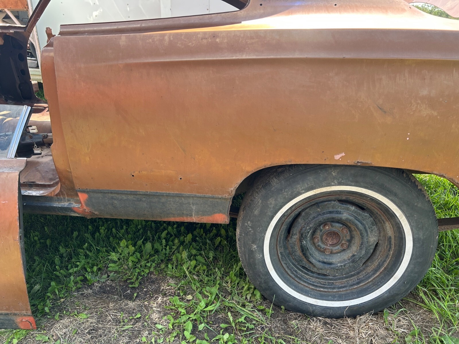 The body is in very nice shape each 1/4 has some rust but could be fixed with small repair panels if desired .Floor, rockers, trunk, front fenders and doors very nice shape.Couple smaller rust spots on door, door seams are very nice shape.Car was saddle bronze metallic, with a lighter coloured vinyl top and tan coloured interior.
