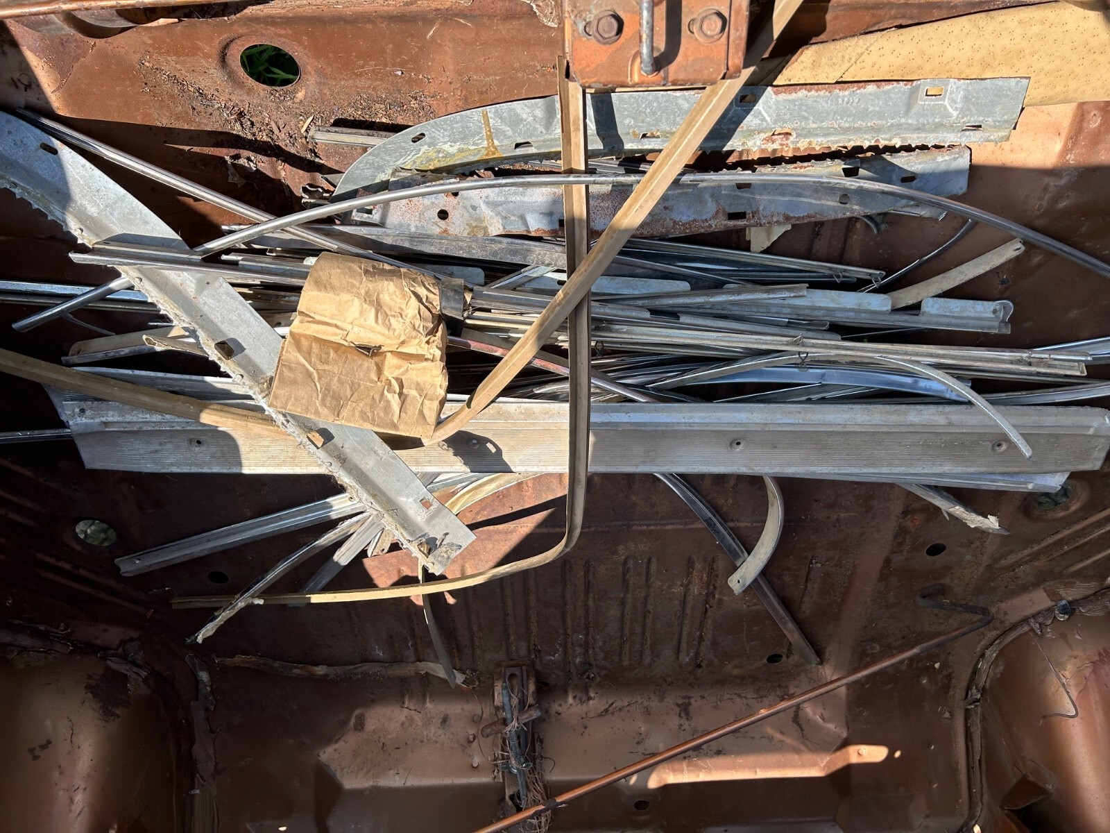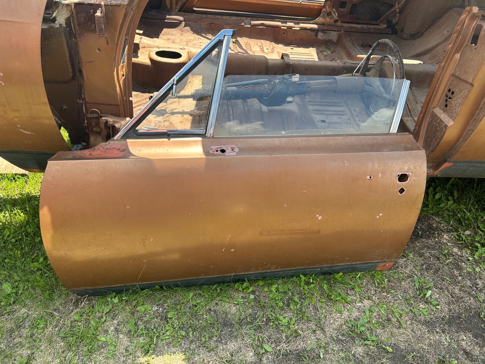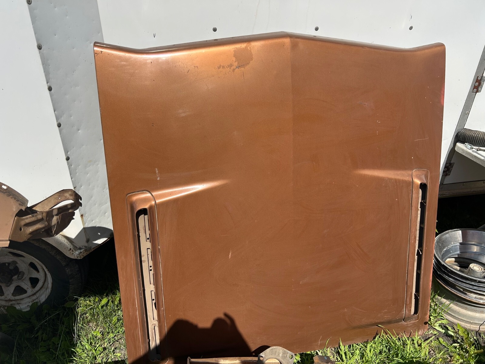 The body is in very nice shape each 1/4 has some rust but could be fixed with small repair panels if desired .Floor, rockers, trunk, front fenders and doors very nice shape.Couple smaller rust spots on door, door seams are very nice shape.Car was saddle bronze metallic, with a lighter coloured vinyl top and tan coloured interior.