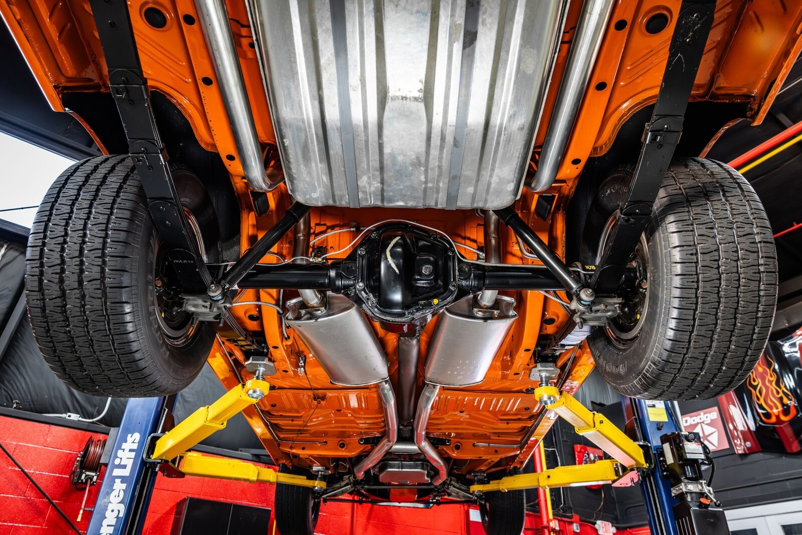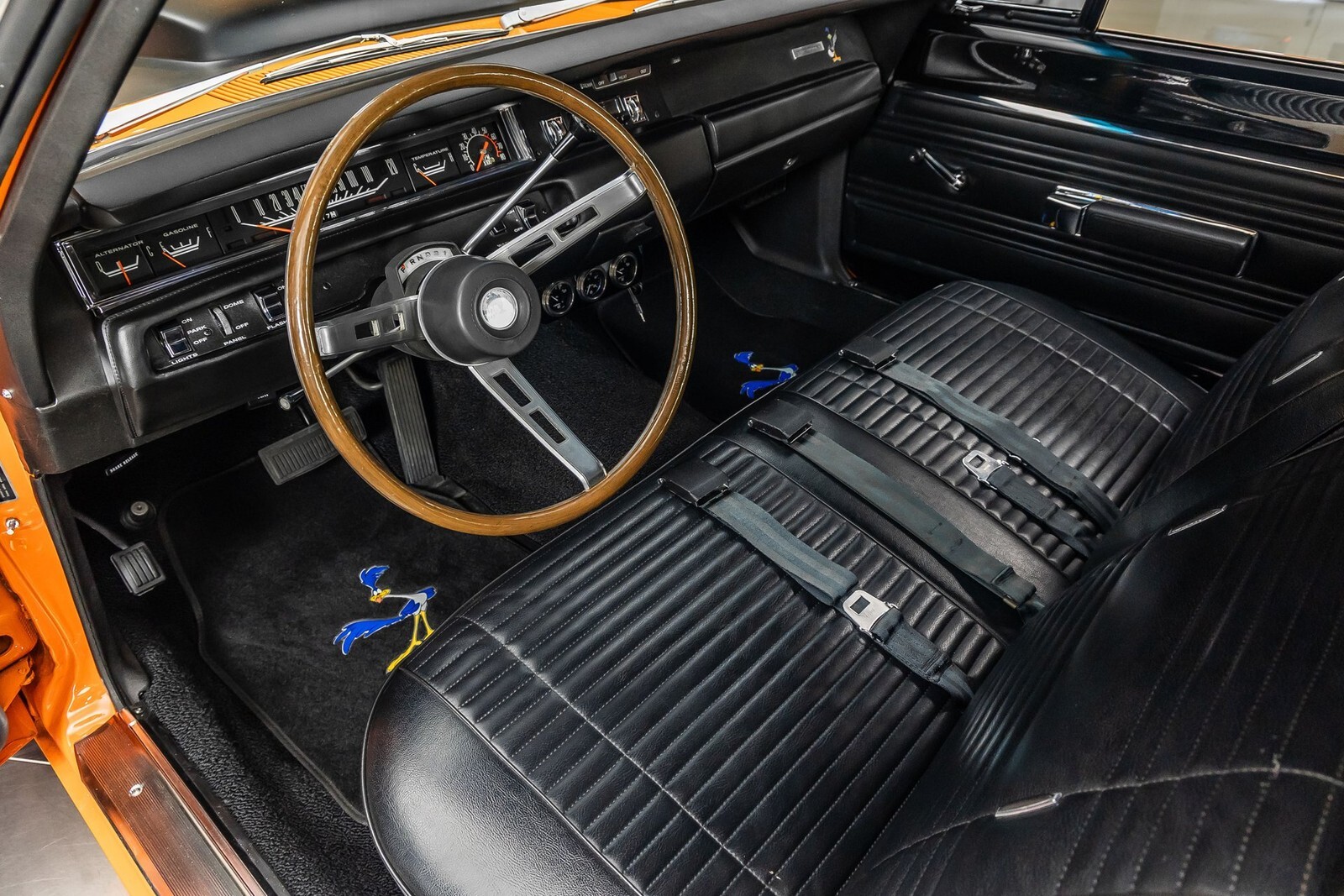 Inside, this Roadrunner features a fully restored cabin finished in all Black Vinyl along with the Black dashboard. The cabin features Front and Rear Bench seating, Seat Belts and Road Runner Floor Mats. On the dash is Factory Gauges with a factory Style radio and RoadRunner Emblem steering wheel! Additional Features include, Black Door Panels and Carpeting! Underneath is Body Color Matched Painted floors along with Coated Fender Wheel Wells!
