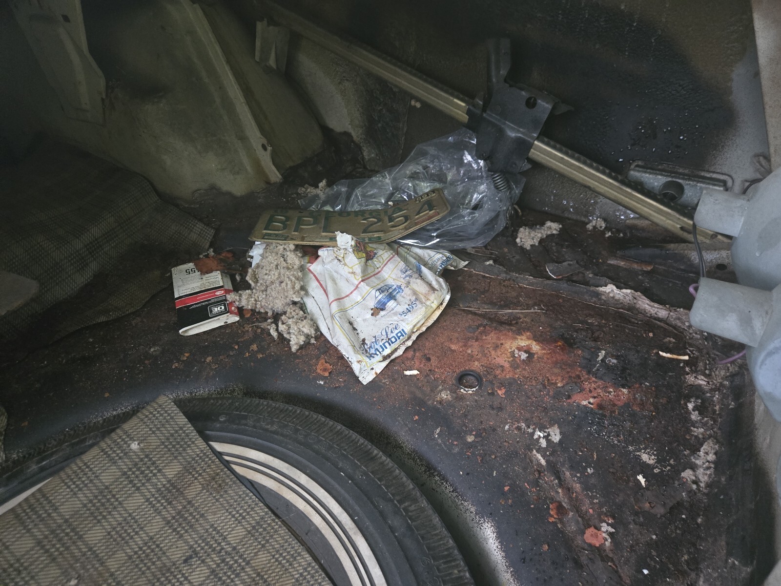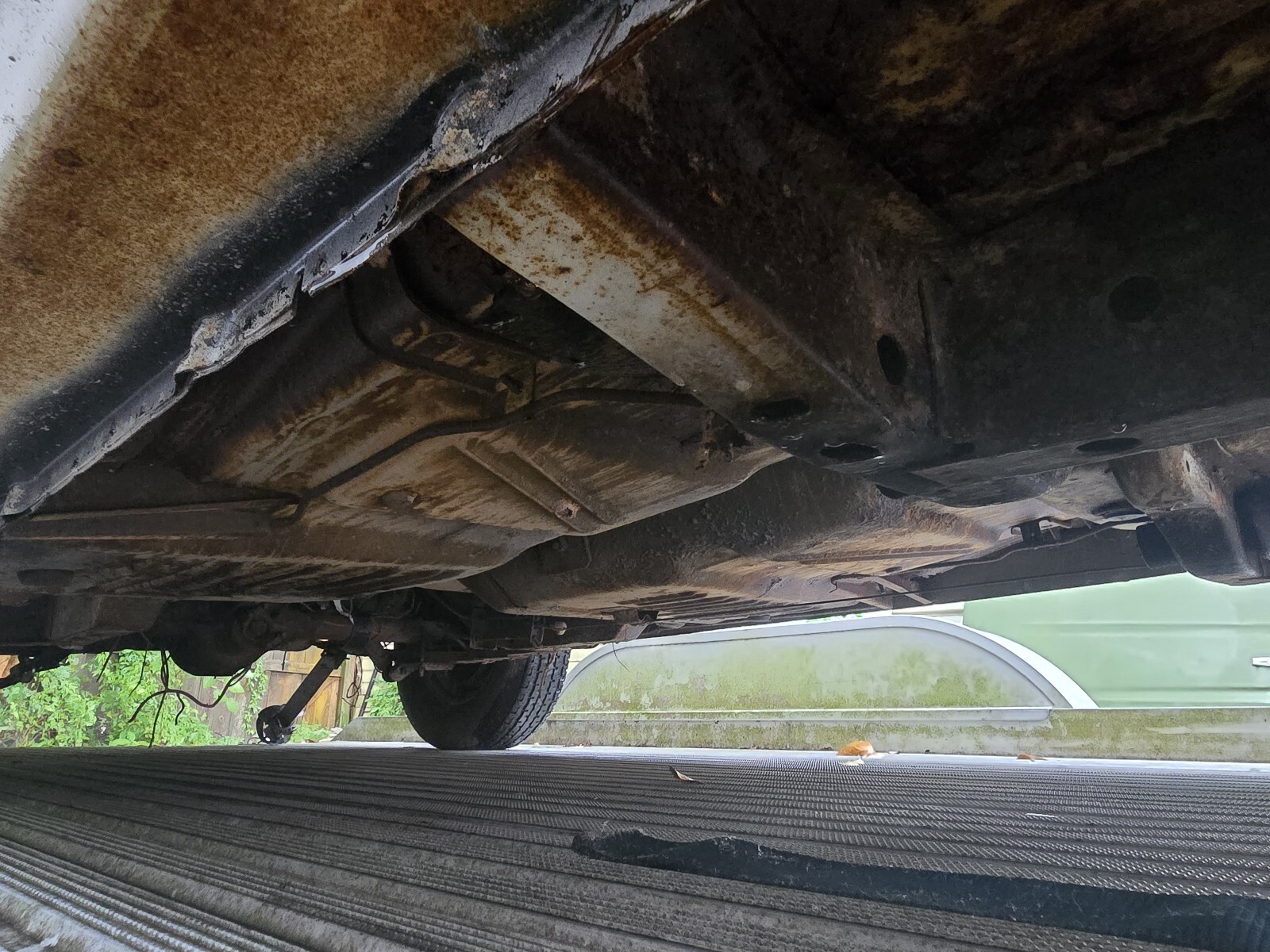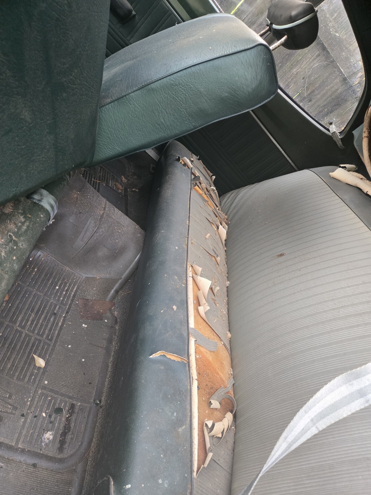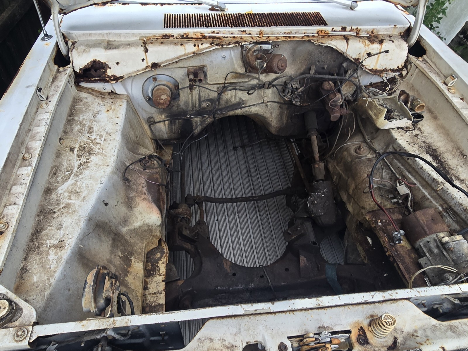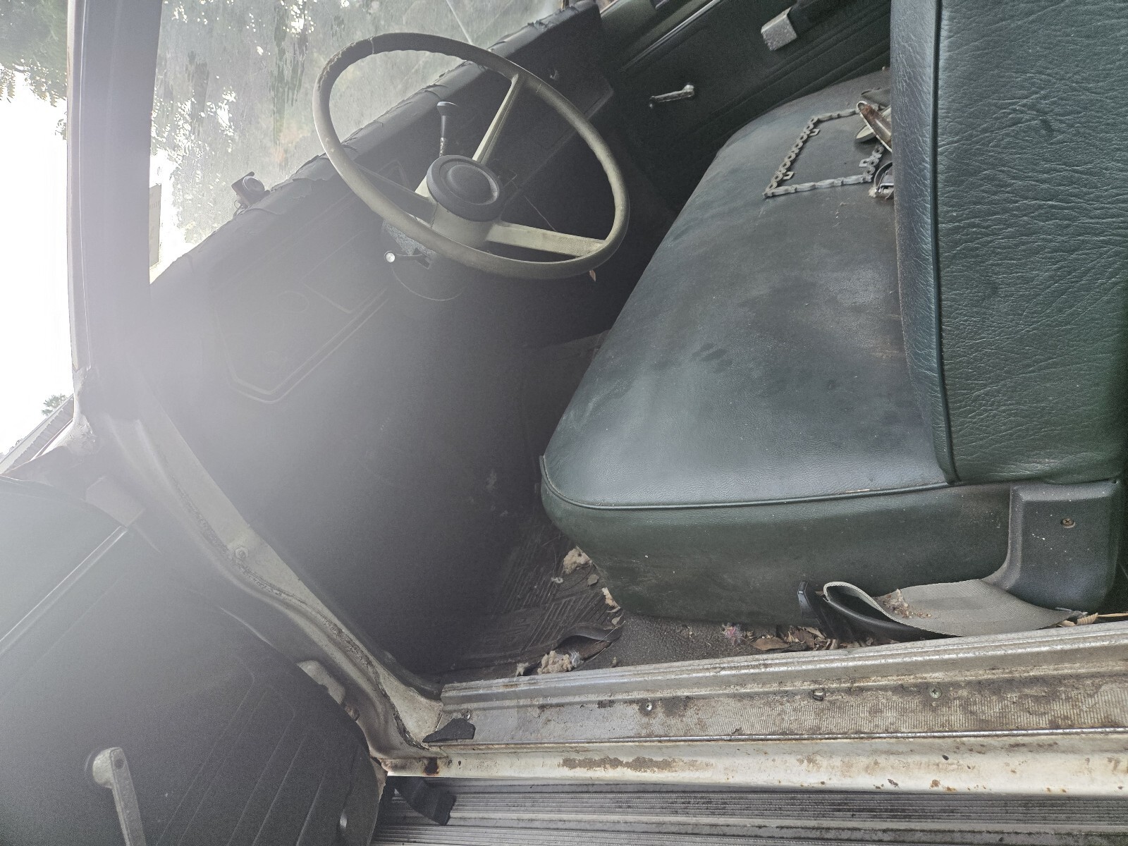 There are rust-thru spots on the cowl near the hood hinge, under the battery tray, the passenger floorboard and a couple of other small spots here and there but this is Georgia rust, not New York rust. The body panels and frame rails are all in good shape. The glass is all nice. The grille and taillights are nice. The doors, hood and trunk close nicely. The interior needs to be restored but the front seat and door panels are in good shape as is the rubber floor mat.