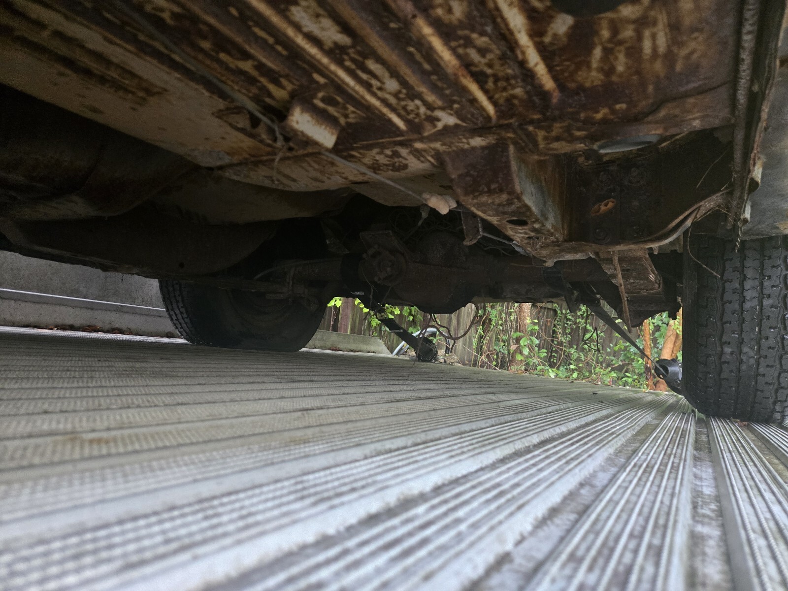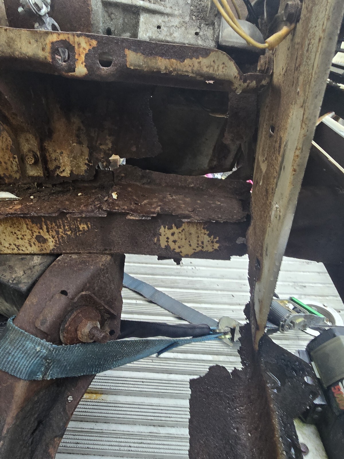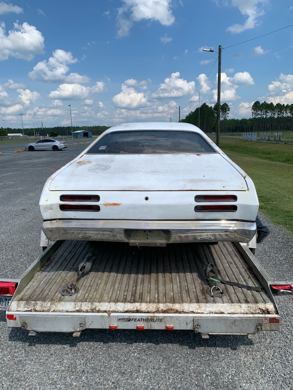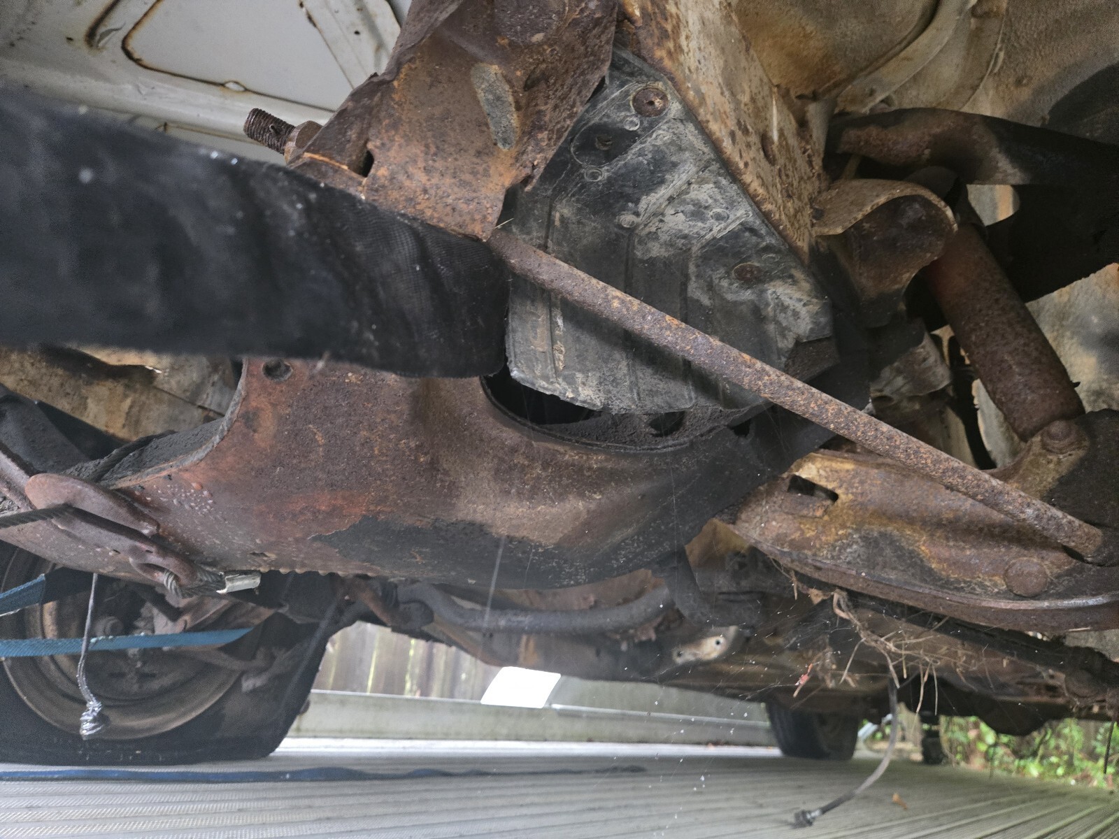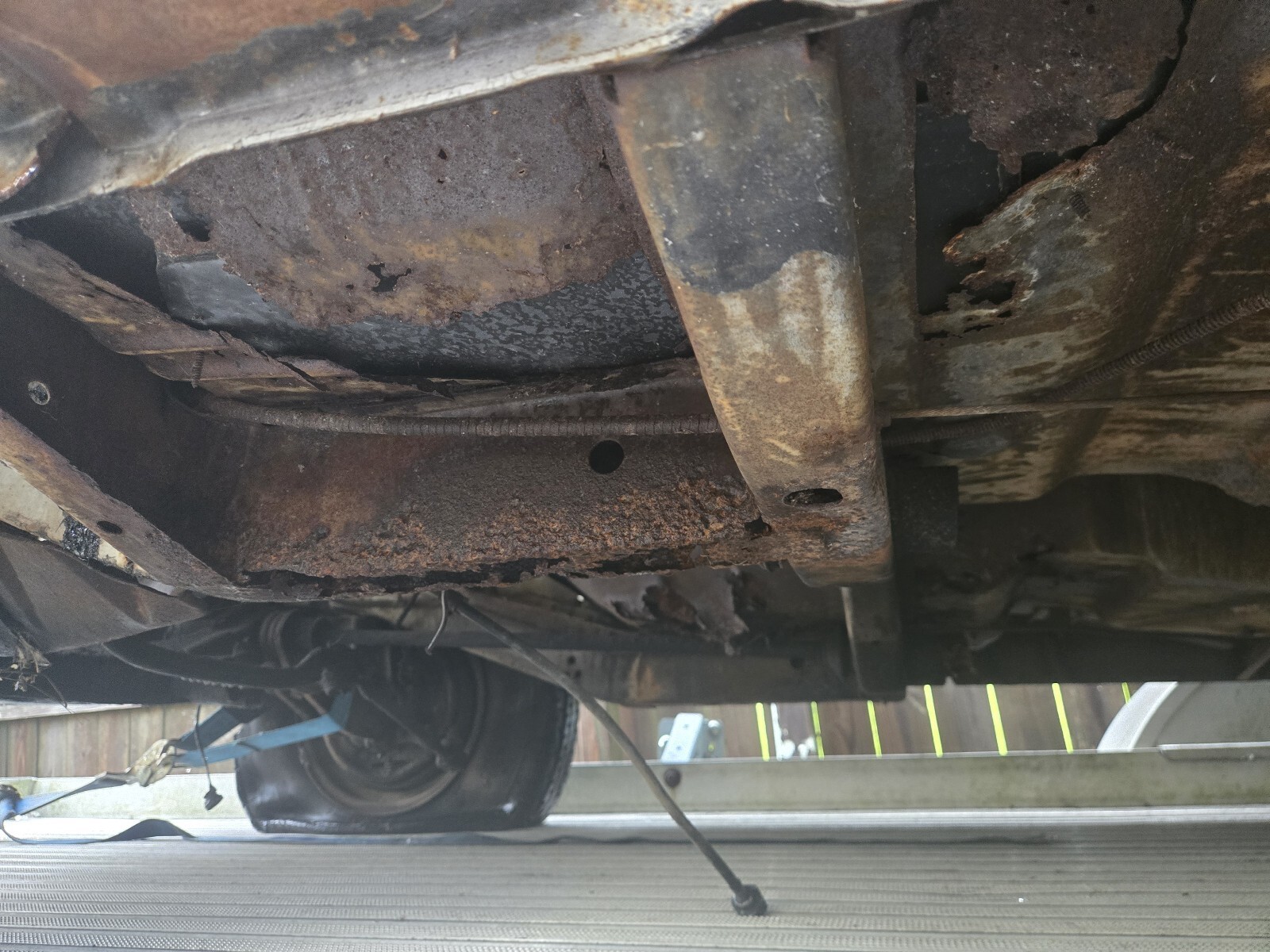 There are rust-thru spots on the cowl near the hood hinge, under the battery tray, the passenger floorboard and a couple of other small spots here and there but this is Georgia rust, not New York rust. The body panels and frame rails are all in good shape. The glass is all nice. The grille and taillights are nice. The doors, hood and trunk close nicely. The interior needs to be restored but the front seat and door panels are in good shape as is the rubber floor mat.
