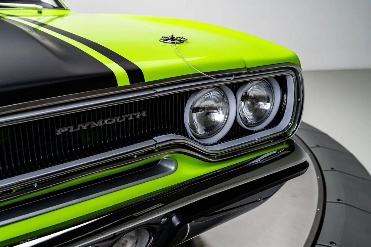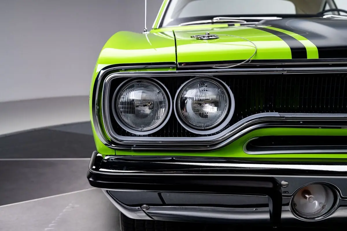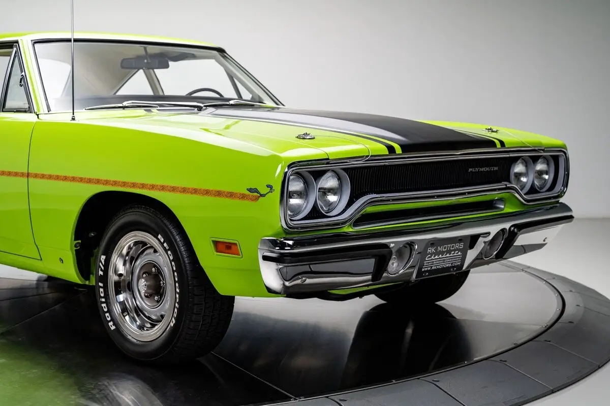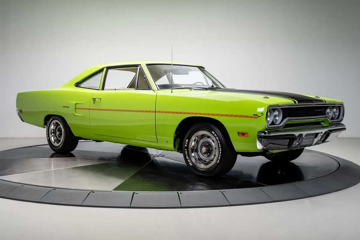 The 1970 Plymouth Road Runner was one of the defining muscle cars of its era, built to deliver maximum horsepower with a brash personality that matched its cartoon mascot. This example takes that reputation further, the product of a no-expense-spared, five-year rotisserie restoration completed by StripMasters, Inc. of Miami, Florida in 2023. The work elevated every detail while upgrading the drivetrain to serious street-and-strip specification. Finished in Code J5 Limelight Poly with black hood stripes, dust-trail graphics, hood pins, and Rallye wheels, it wears one of Plymouth's most iconic high-impact looks backed by a fully refinished undercarriage and fresh trim throughout. Power comes from a 440 Magnum block stroked to 499 cubic inches, fitted with Indy EZ aluminum heads, an Indy intake, and dual 650cfm Edelbrock carburetors. TTI headers exhale through a new 2.5-inch aluminized exhaust, while a Ram clutch connects the power through an A833 4-speed manual to a reinforced 8.75-inch Sure Grip rear with 3.23 gears. Supporting hardware includes a 4-core radiator and power front disc brakes, giving this car the confidence to match its muscle. Inside, the restored white bench-seat interior contrasts sharply against a black dash and trim, anchored by the long-handled Pistol Grip shifter. The Rallye gauge cluster, restored by Redline Garage Works, includes the famed Tick-Tock Tach, while a solid-state factory radio, reverse indicator, and fresh trunk mat complete the cabin. With its bold color, over 100 extra cubic inches, and carefully chosen upgrades, this Road Runner sharpens one of Plymouth's most celebrated formulas into a car that delivers both show and go.