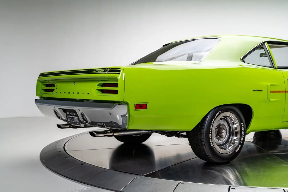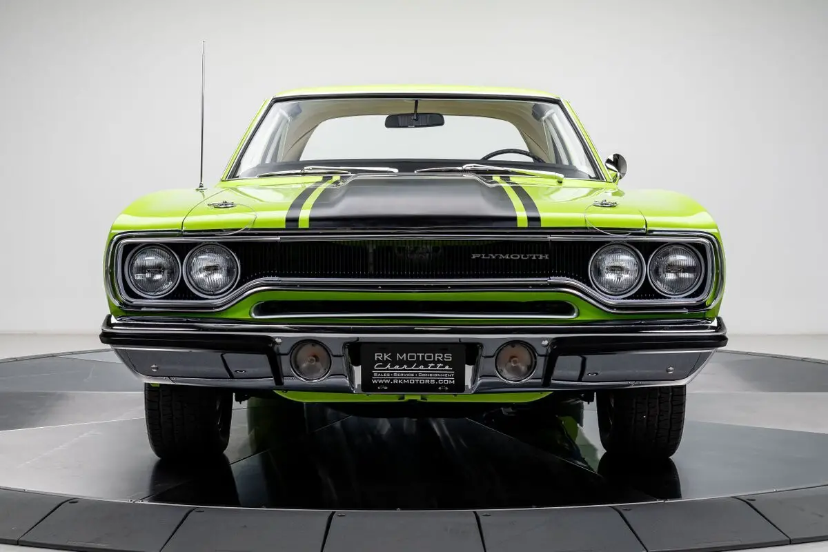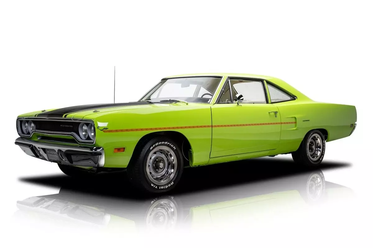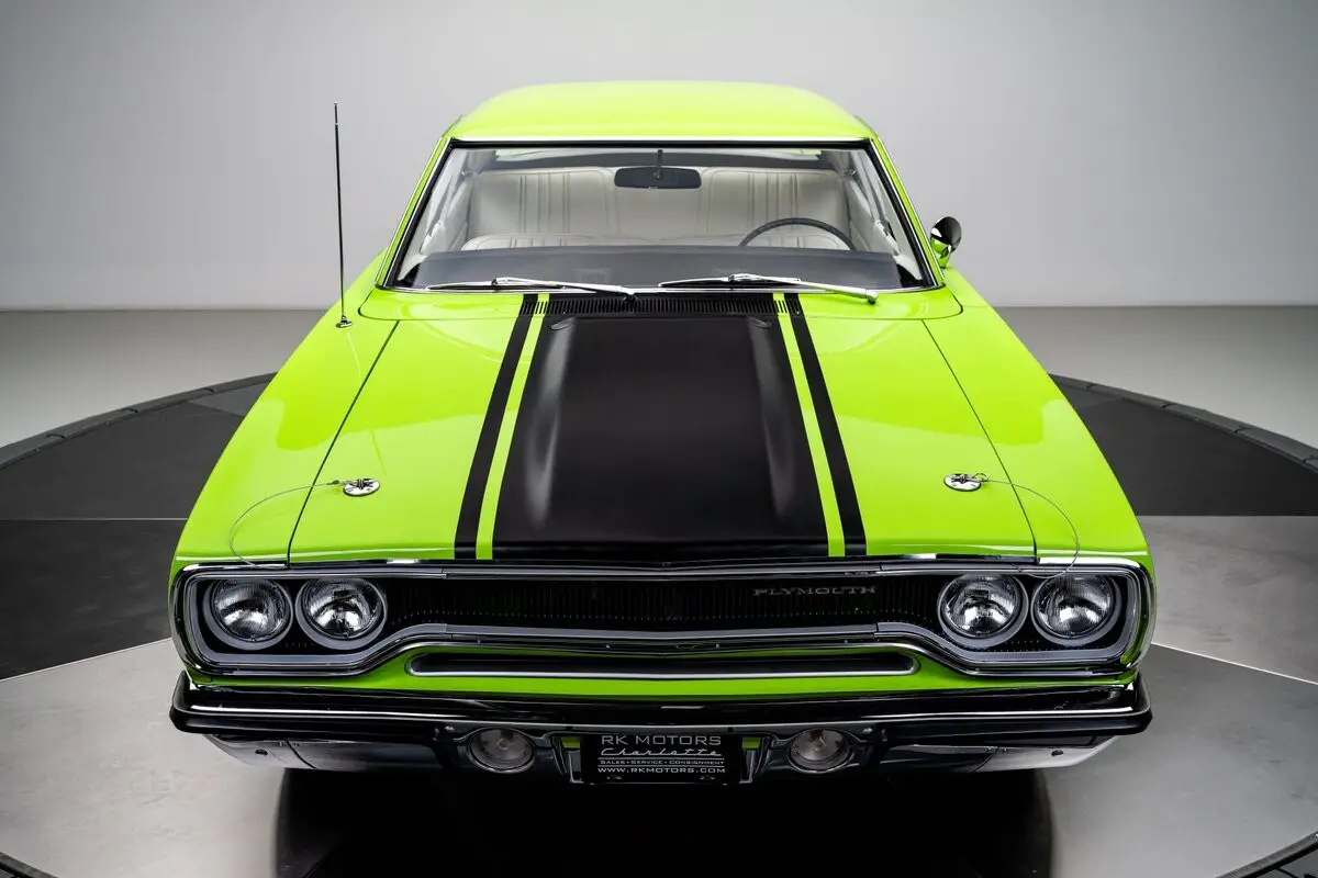 The 1970 Plymouth Road Runner was one of the defining muscle cars of its era, built to deliver maximum horsepower with a brash personality that matched its cartoon mascot. This example takes that reputation further, the product of a no-expense-spared, five-year rotisserie restoration completed by StripMasters, Inc. of Miami, Florida in 2023. The work elevated every detail while upgrading the drivetrain to serious street-and-strip specification. Finished in Code J5 Limelight Poly with black hood stripes, dust-trail graphics, hood pins, and Rallye wheels, it wears one of Plymouth's most iconic high-impact looks backed by a fully refinished undercarriage and fresh trim throughout. Power comes from a 440 Magnum block stroked to 499 cubic inches, fitted with Indy EZ aluminum heads, an Indy intake, and dual 650cfm Edelbrock carburetors. TTI headers exhale through a new 2.5-inch aluminized exhaust, while a Ram clutch connects the power through an A833 4-speed manual to a reinforced 8.75-inch Sure Grip rear with 3.23 gears. Supporting hardware includes a 4-core radiator and power front disc brakes, giving this car the confidence to match its muscle. Inside, the restored white bench-seat interior contrasts sharply against a black dash and trim, anchored by the long-handled Pistol Grip shifter. The Rallye gauge cluster, restored by Redline Garage Works, includes the famed Tick-Tock Tach, while a solid-state factory radio, reverse indicator, and fresh trunk mat complete the cabin. With its bold color, over 100 extra cubic inches, and carefully chosen upgrades, this Road Runner sharpens one of Plymouth's most celebrated formulas into a car that delivers both show and go.