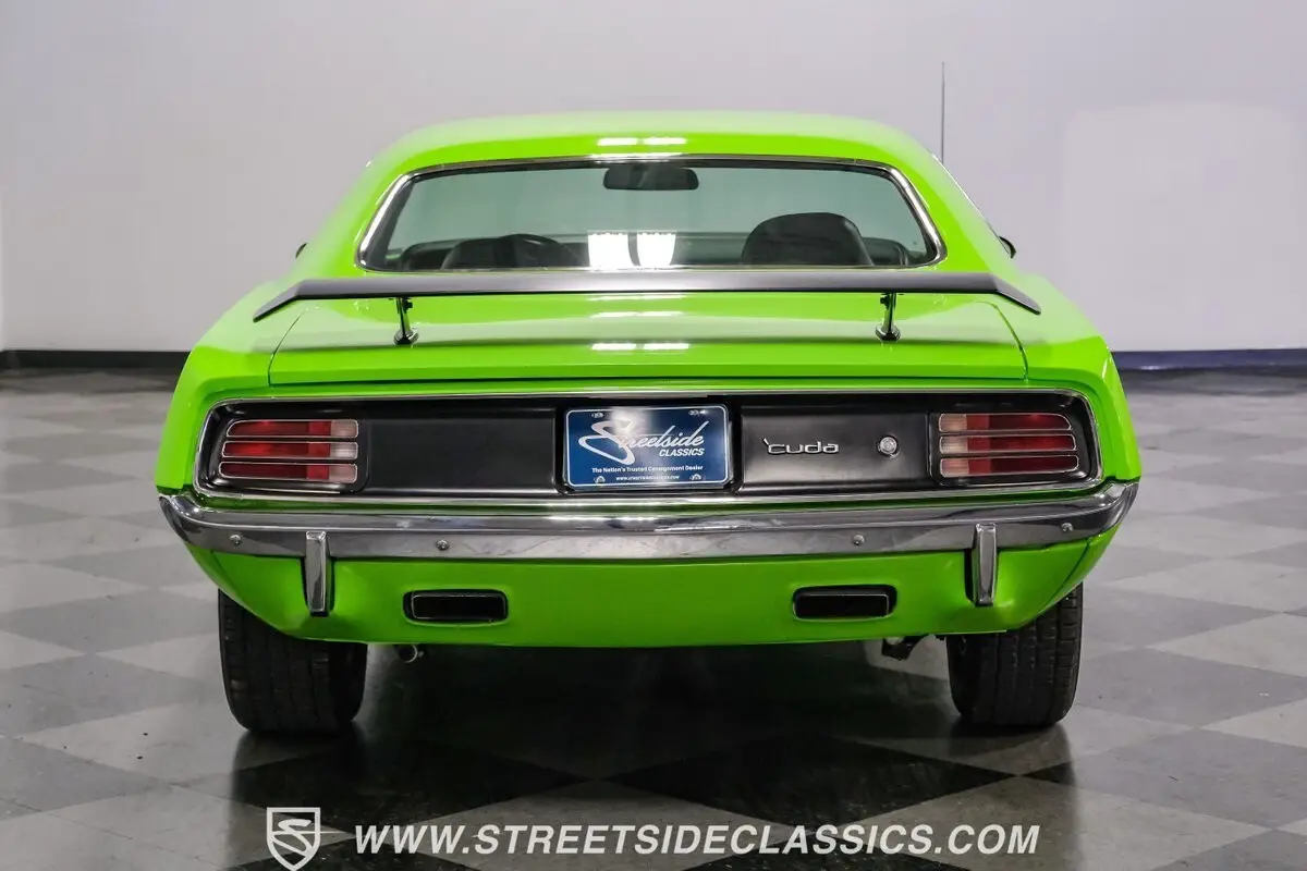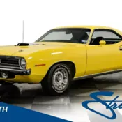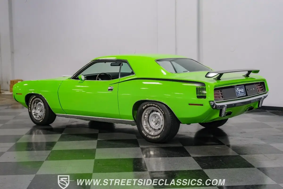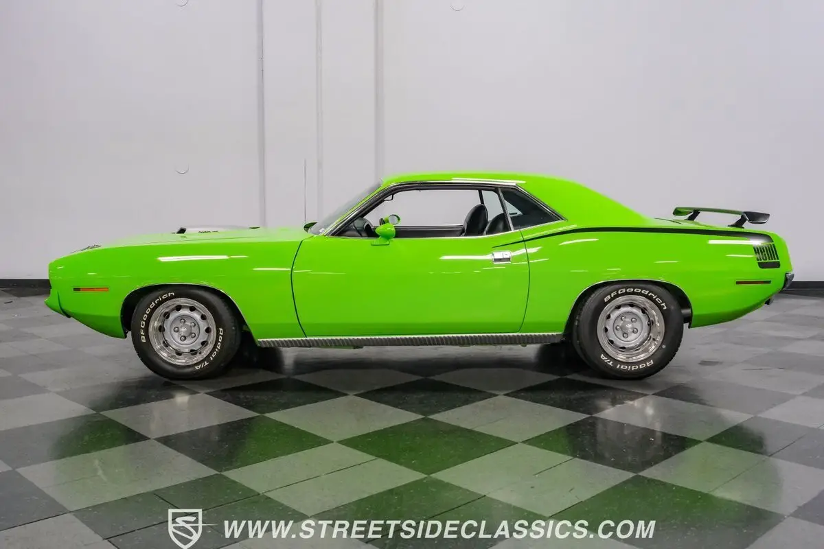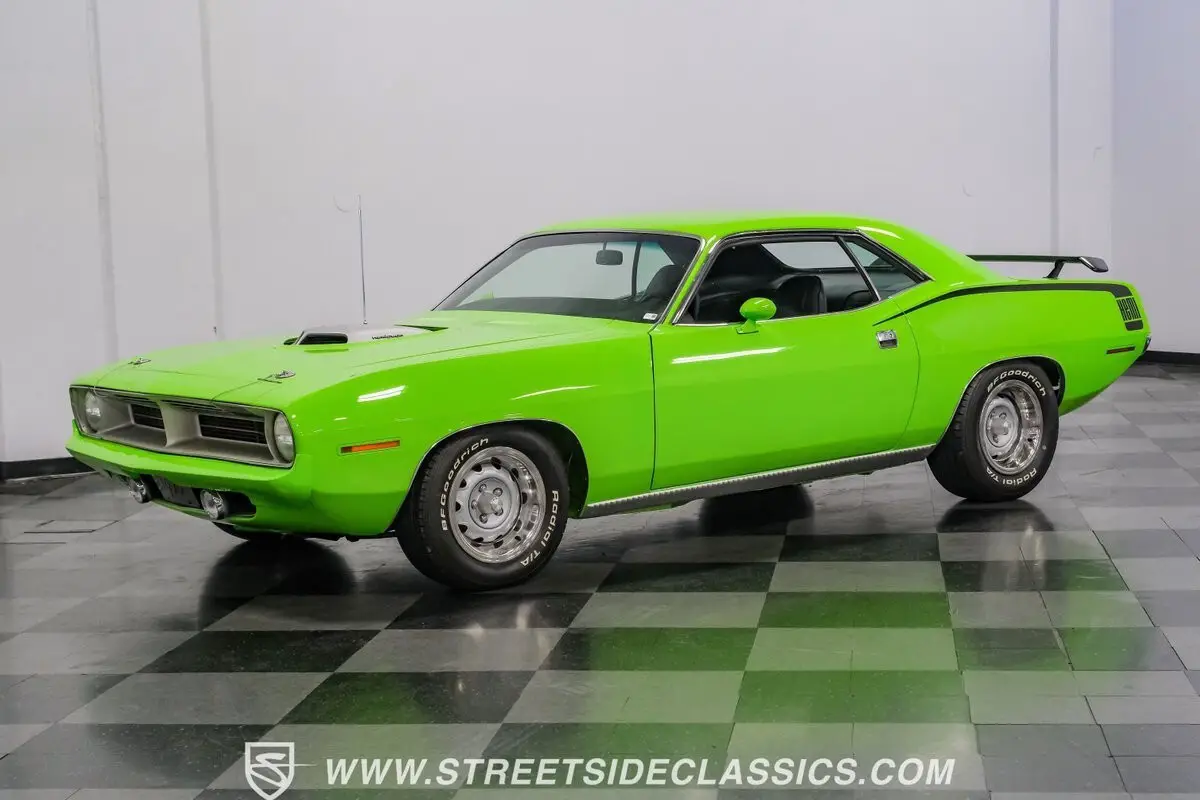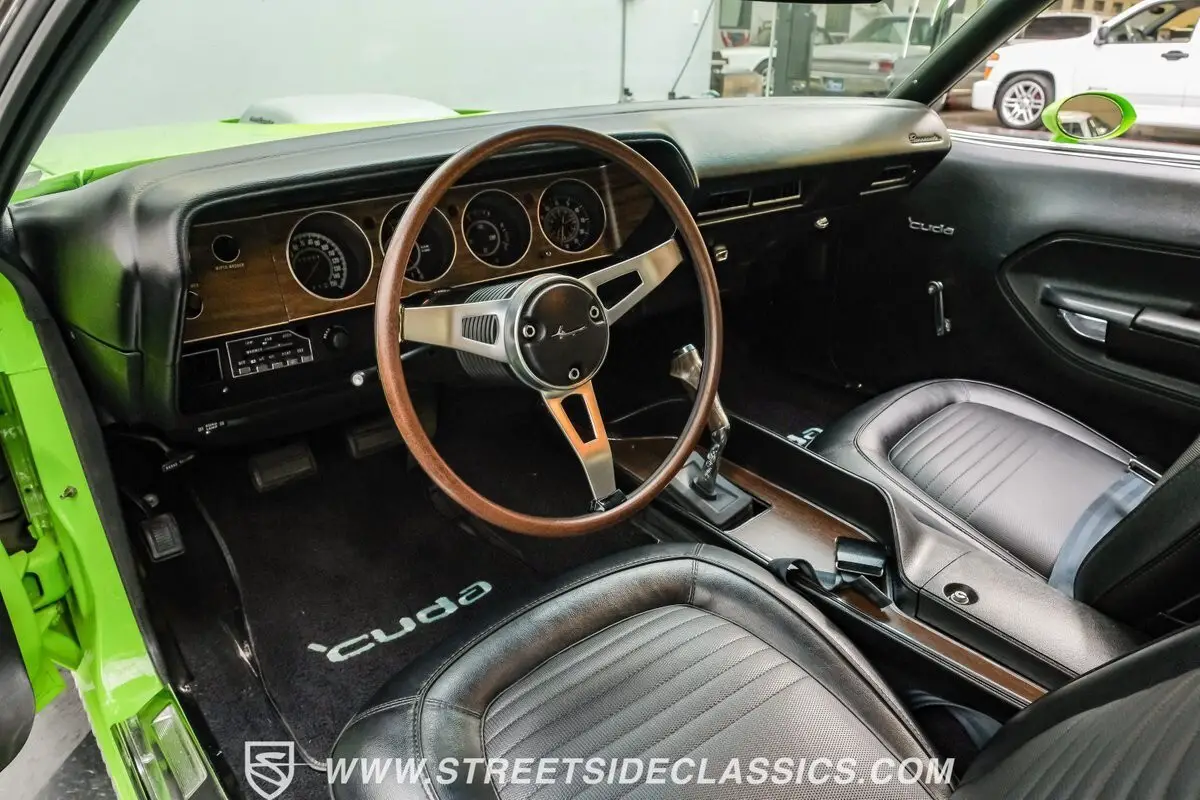 • High quality, frame-off style restoration; paint and body restored to a very high standard in factory correct Lime Light green • Odometer reads 11,251; odometer is from the same car as the Hemi and is believed to reflect the engine mileage • 426 Hemi V8, period correct • Shaker hood • 4-speed manual transmission with pistol grip shifter • Air conditioning converted to R134a • Power steering • Drum brakes front and rear as original to this configuration • Black vinyl buckets, wood grain wheel, center console • Full repaint approximately 18 years ago, excellent finish with straight body panels and clean chrome and glass along with vinyl Hemi quarter decals • 15 inch Rallye wheels with BF Goodrich tires 235/60R15 front and 255/60R15 rear This 1970 Plymouth Cuda Hemi Tribute blends authentic presence and thoughtful restoration into a package that is ready to be enjoyed. It represents a strong choice for collectors who appreciate period correct presentation with some modernized creature comforts. Call today!