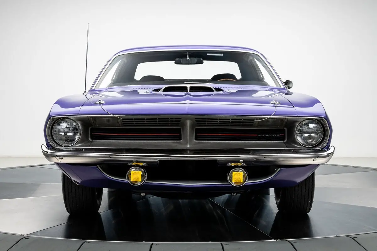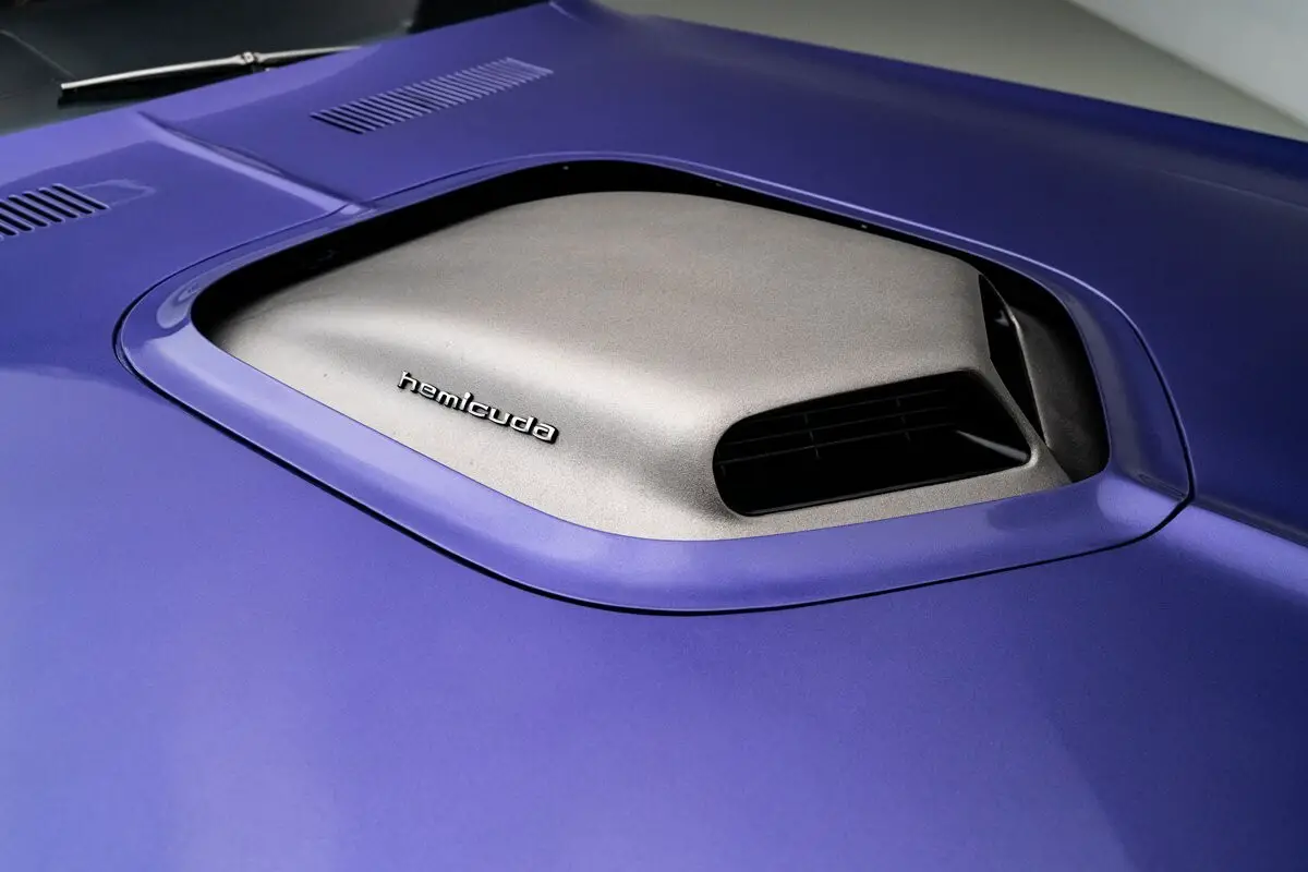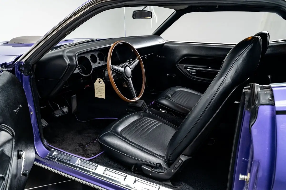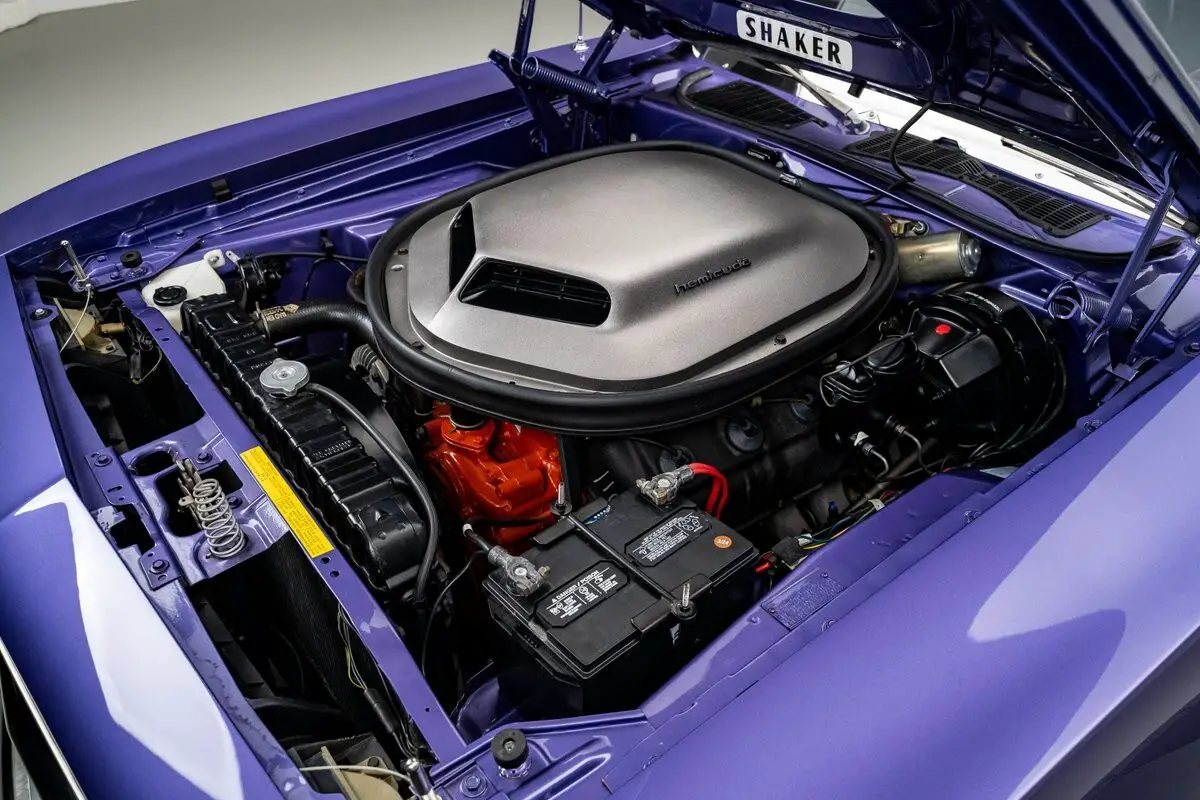At the very top of Mopar hierarchy sits the 1970 Plymouth HEMI 'Cuda, a car that has come to define peak muscle car mythology. It represents Chrysler's most audacious engineering and one of the rarest legends of Detroit's golden era. This example, finished in factory-correct FC7 In-Violet Metallic with a black HEMI hockey stripe and flat black tail panel, checks every box that matters to collectors. The restoration was carried out to a factory-correct standard, highlighted by an N96 Shaker hood, Rallye wheels, and Goodyear Polyglas GT tires. Under the hood sits a date-correct 426 cubic inch HEMI V8 with dual Carter carburetors, paired to a correct-spec A833 4-speed manual transmission and Dana 60 Super Track Pak rear with 4.10 gears and Sure Grip. Though not numbers-matching, the drivetrain carries proper castings and dates, while partial VIN stampings on the cowl and radiator support confirm the originality of the body shell. Inside, the black vinyl bucket seat interior is restored to its proper configuration, with a woodgrain Rallye dash, Hurst Pistol Grip shifter, and road lamp switch. Documentation is equally strong, with the original broadcast sheet, Chrysler Registry report, and detailed inspections by both Dave Wise and Galen Govier included in the sale. One of just 44 HEMI 'Cudas produced for the Canadian market and one of only 284 built with a 4-speed in 1970, this In-Violet Shaker car firmly belongs in blue-chip territory as a well-documented piece of Mopar history.