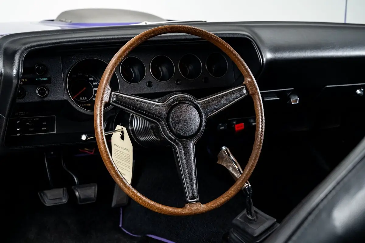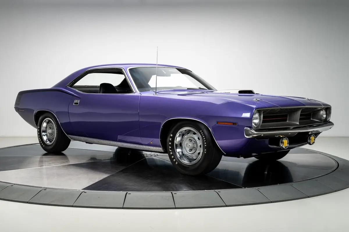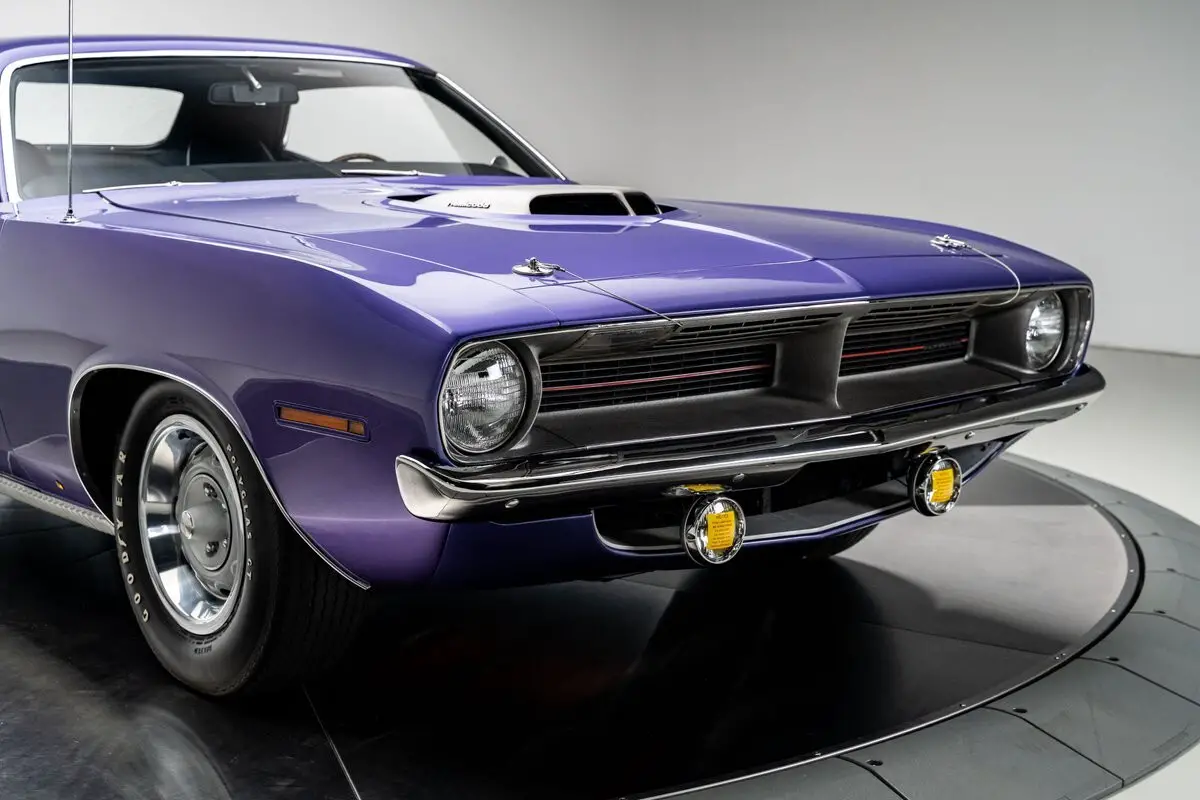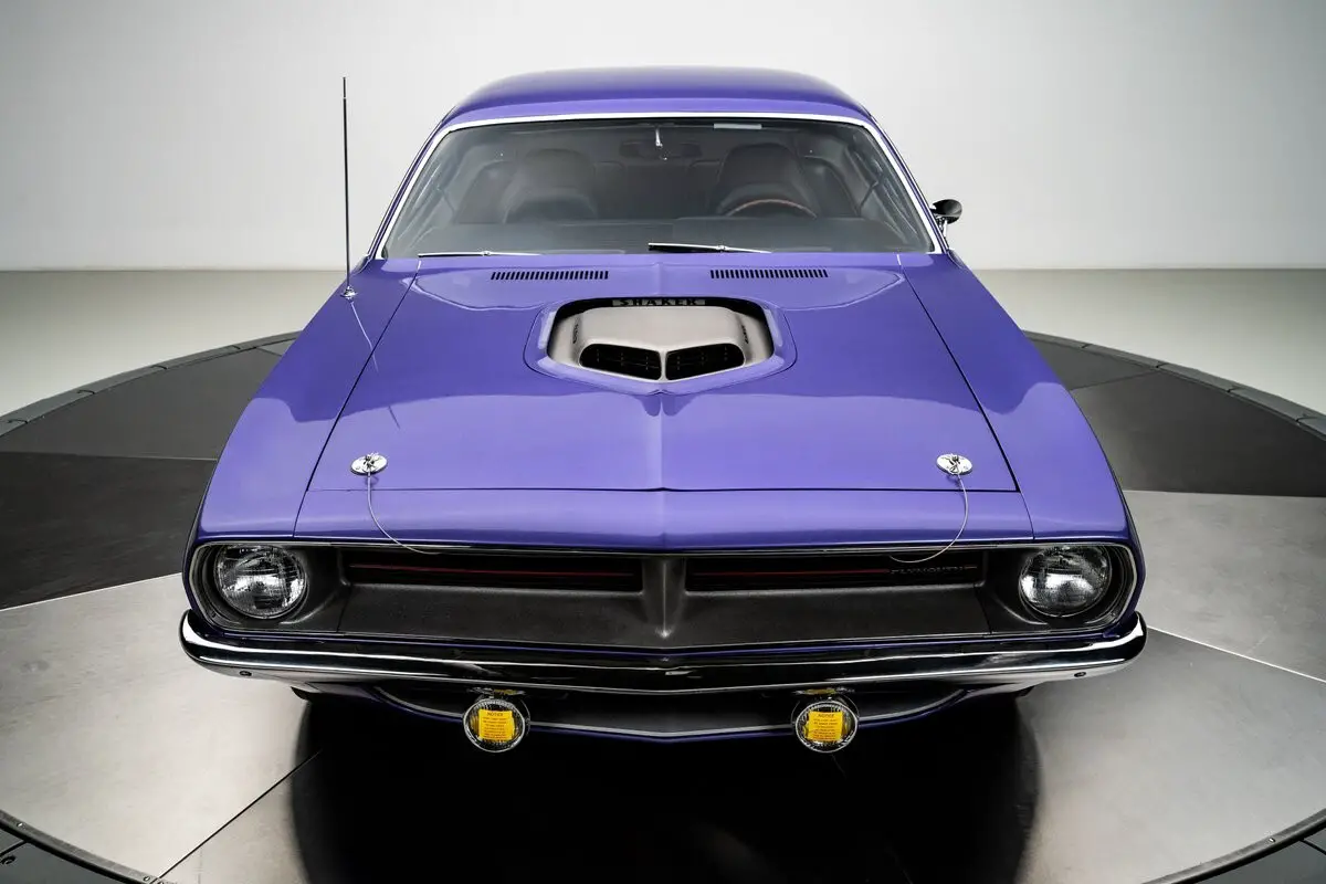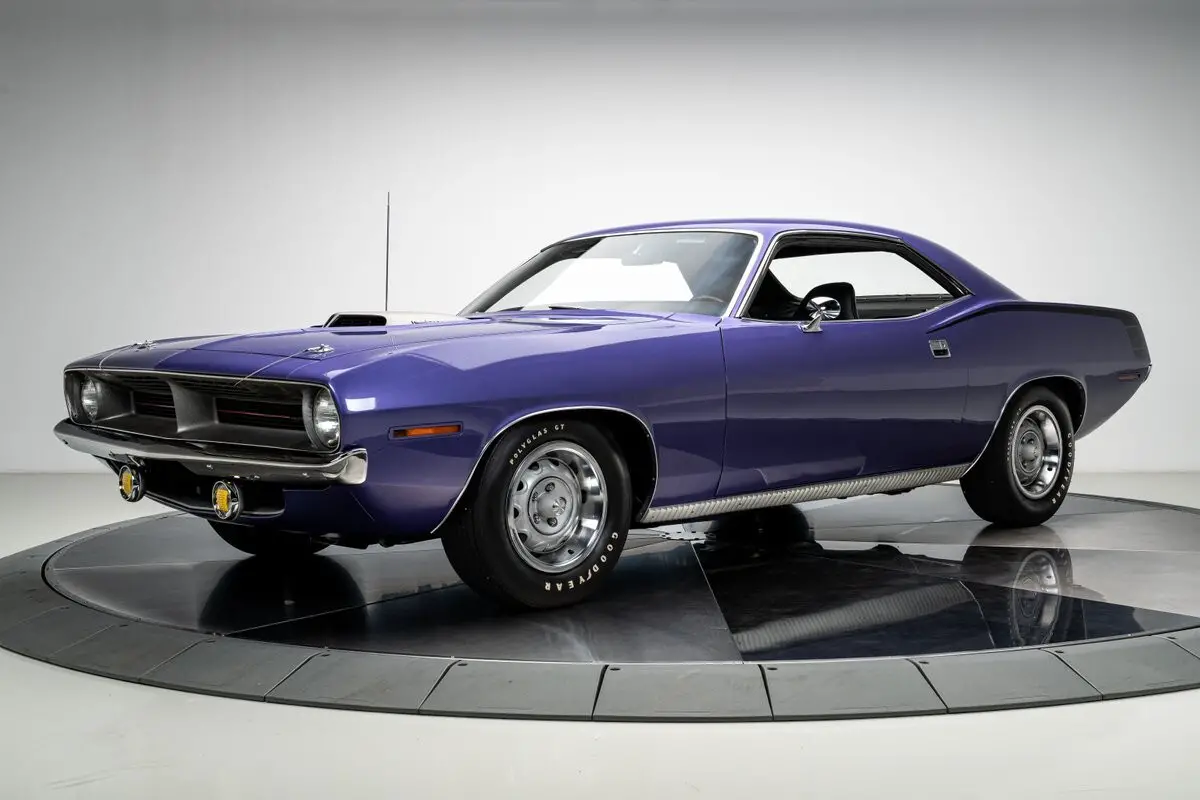 At the very top of Mopar hierarchy sits the 1970 Plymouth HEMI 'Cuda, a car that has come to define peak muscle car mythology. It represents Chrysler's most audacious engineering and one of the rarest legends of Detroit's golden era. This example, finished in factory-correct FC7 In-Violet Metallic with a black HEMI hockey stripe and flat black tail panel, checks every box that matters to collectors. The restoration was carried out to a factory-correct standard, highlighted by an N96 Shaker hood, Rallye wheels, and Goodyear Polyglas GT tires. Under the hood sits a date-correct 426 cubic inch HEMI V8 with dual Carter carburetors, paired to a correct-spec A833 4-speed manual transmission and Dana 60 Super Track Pak rear with 4.10 gears and Sure Grip. Though not numbers-matching, the drivetrain carries proper castings and dates, while partial VIN stampings on the cowl and radiator support confirm the originality of the body shell. Inside, the black vinyl bucket seat interior is restored to its proper configuration, with a woodgrain Rallye dash, Hurst Pistol Grip shifter, and road lamp switch. Documentation is equally strong, with the original broadcast sheet, Chrysler Registry report, and detailed inspections by both Dave Wise and Galen Govier included in the sale. One of just 44 HEMI 'Cudas produced for the Canadian market and one of only 284 built with a 4-speed in 1970, this In-Violet Shaker car firmly belongs in blue-chip territory as a well-documented piece of Mopar history.