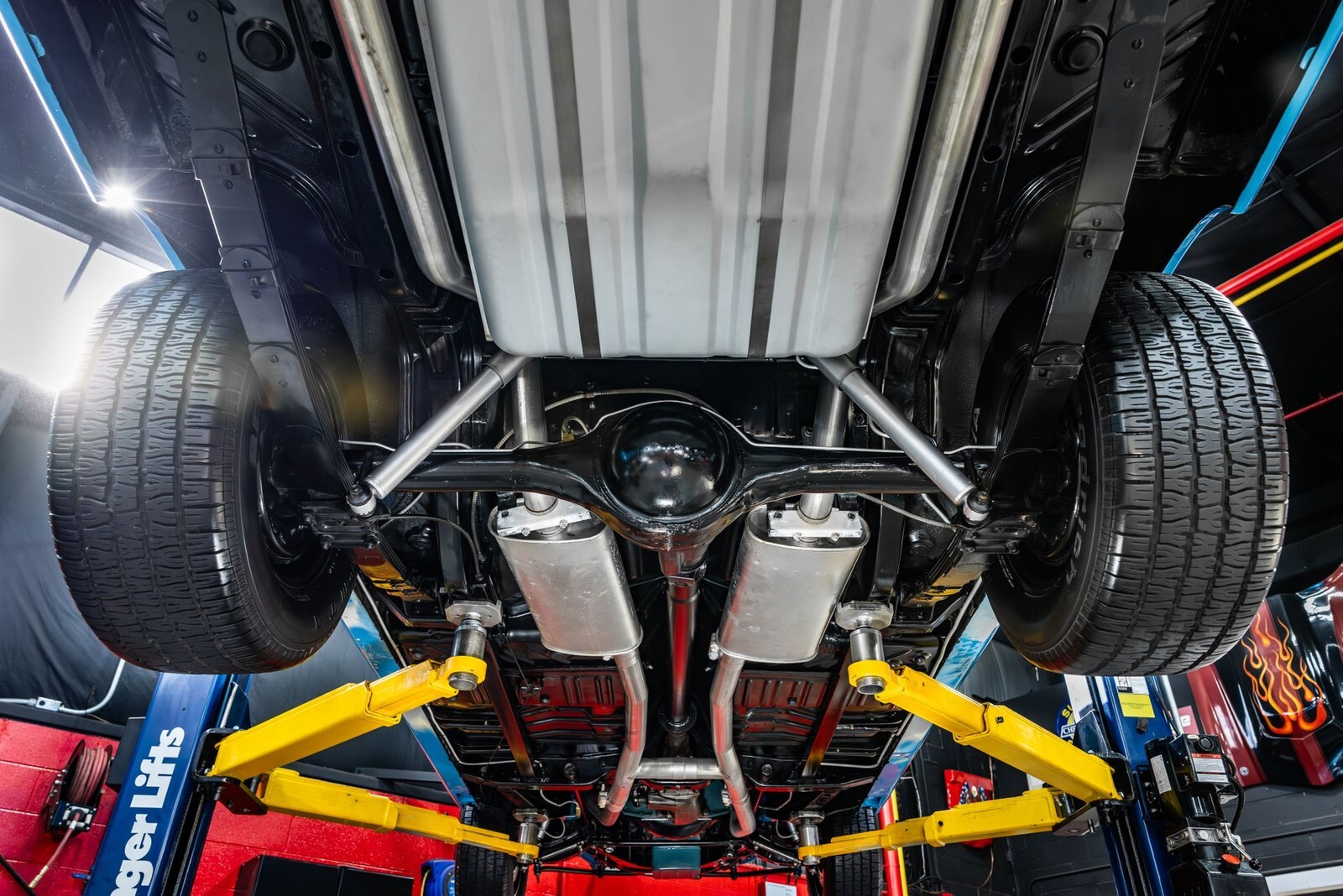 Inside, this Roadrunner is a fully restored cabin finished in Blue along with the Black dashboard & Wood Grained Accents. The cabin features a Front Split Bench Seat, Rear Bench Seating, Lap Belts & the Manual Floor Shifter! On the dash is Factory Gauges with additional aftermarket gauges and the Wooden steering wheel! Additional Features include, Door Panels and Blue Carpeting! The underside has been finished in Semi Gloss Black and features a Band Clamped Exhaust System!