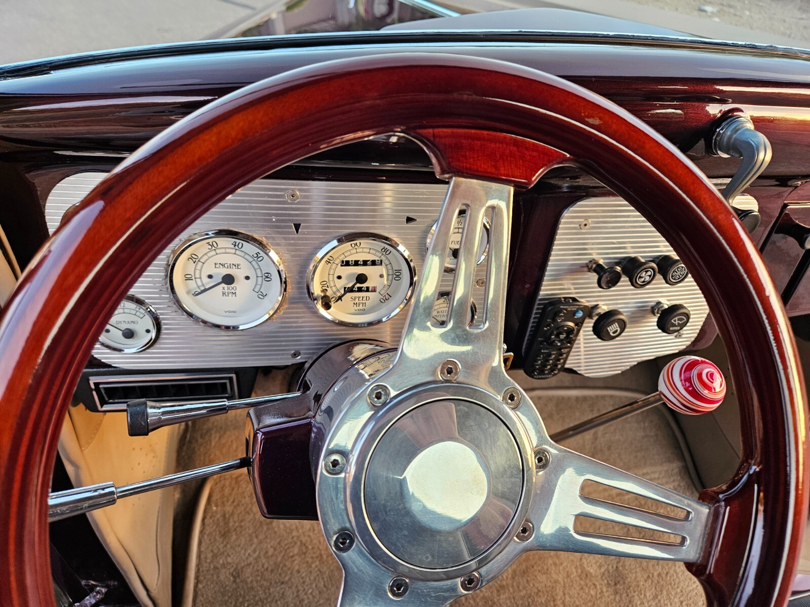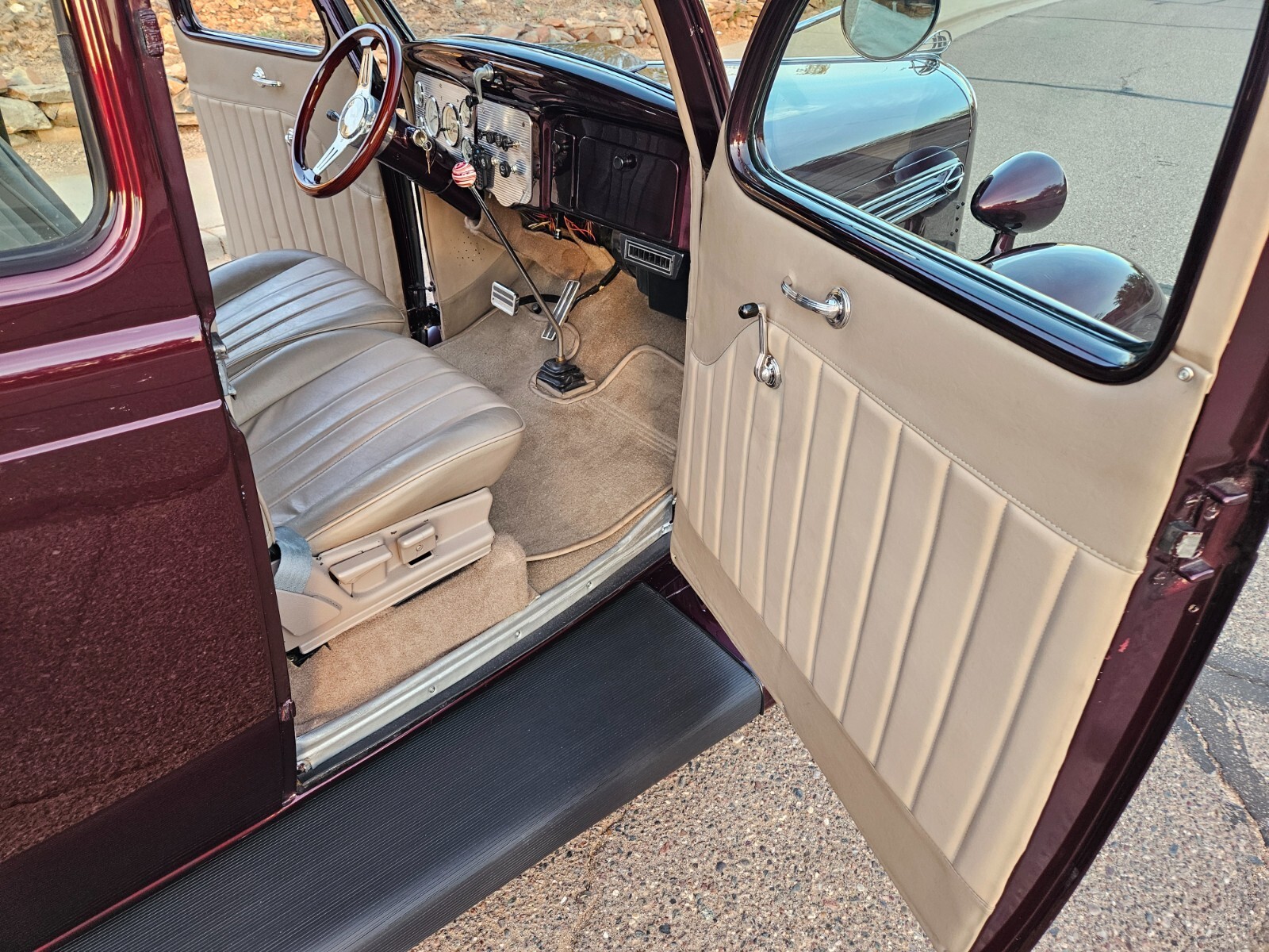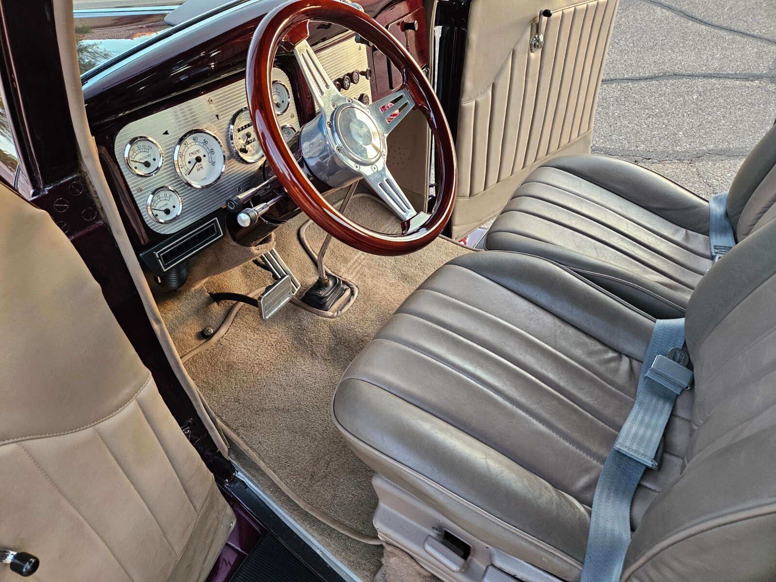 The dash is painted to match the exterior color with modern instruments and custom wood wheel.