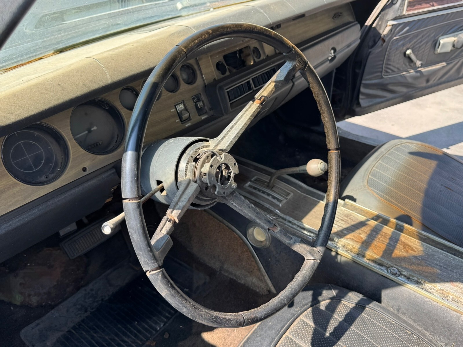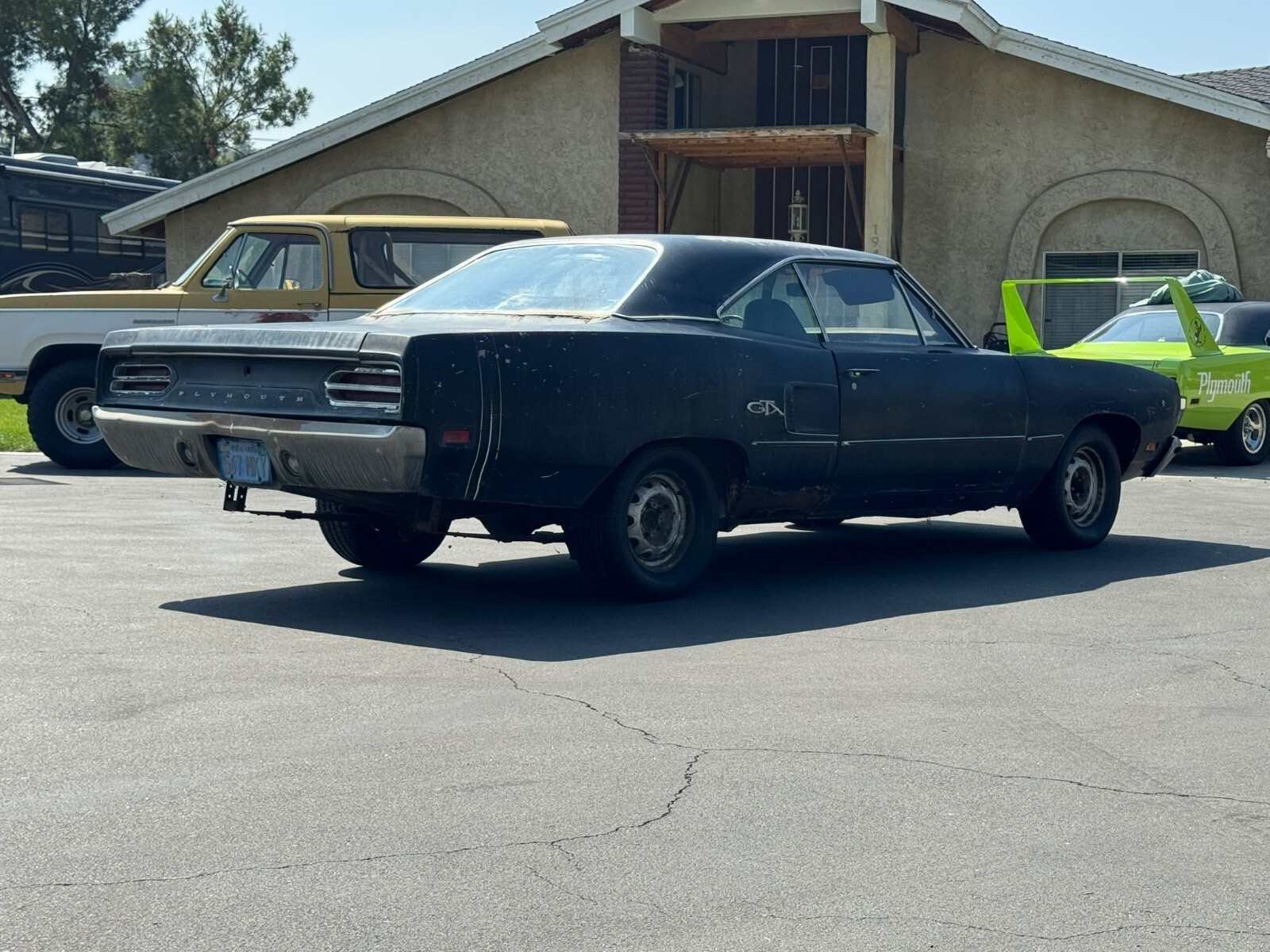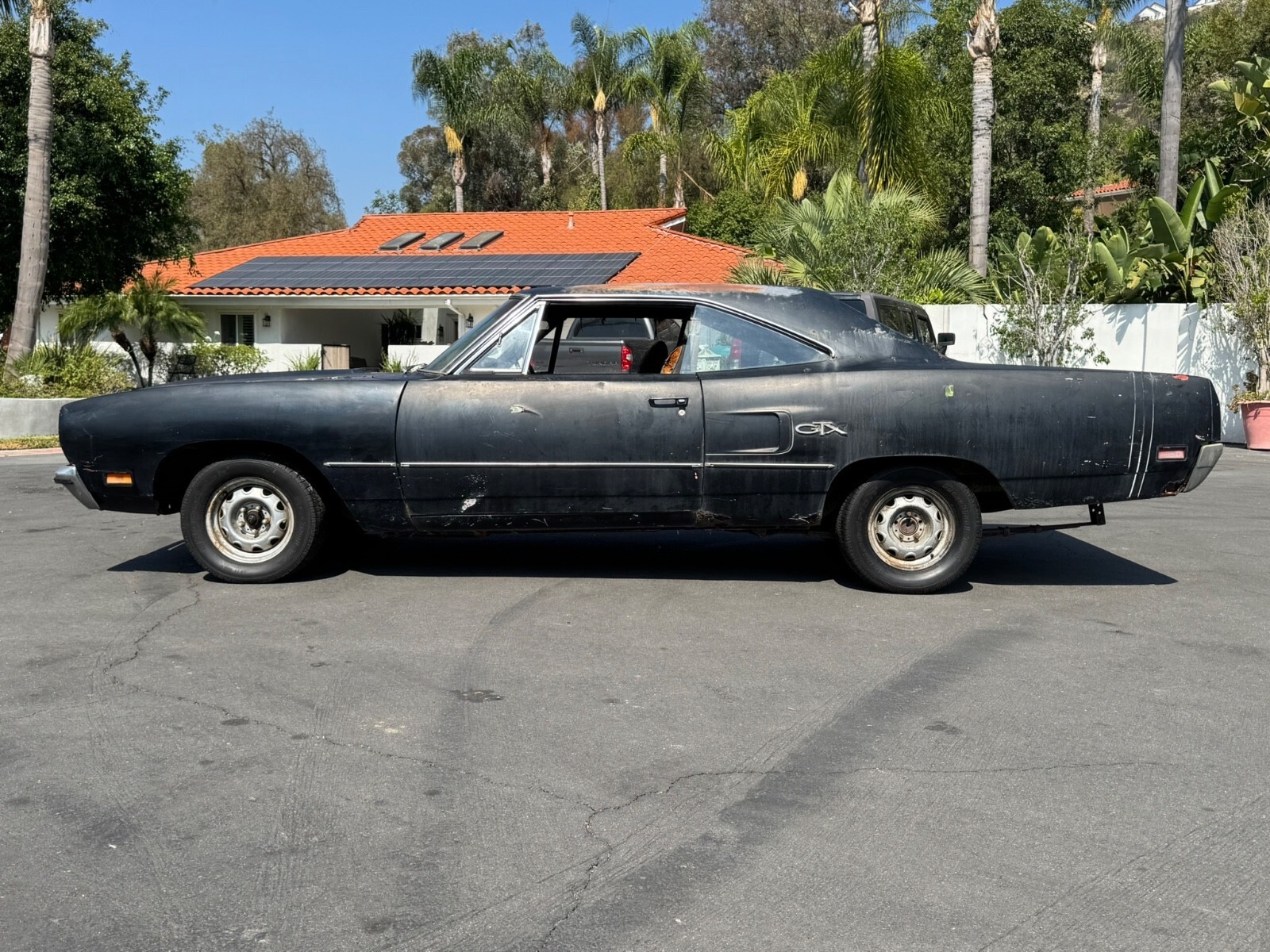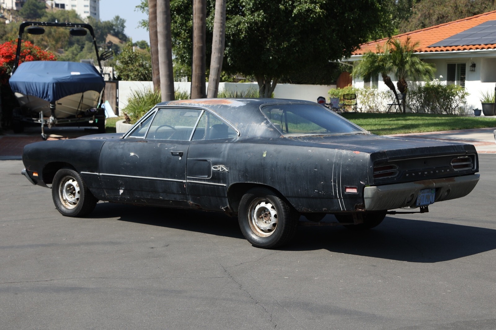 This GTX was built at the Los Angeles Plant and remained in LA for the remainder of the time till I got it where it traveled south 40 miles to Orange County. The history that I know of, A man named Gilbert Herrera brought this car locally out of a trade paper called the recycler in about 1990. It was a running car at the time. He put it in a storage lot with several other Mopar muscle cars that he bought around that same time. Initially he would start them and drive them around but eventually it developed a carb issue and it sat ever since. He passed away unfortunately about 3 years ago. Earlier this year I bought the entire lot to get one of the cars. The family wanted to sell the whole lot. So I had to buy them all to get the one car. This GTX has some rust as you can see in the pictures. In California the car rust from the top down. The drains in the quarters and doors get clogged with debris and water collects and stays wet in the dirt and debris. This causes the rust you see here. The floors and frames are perfect. The trunk floor is amazingly solid with just a few pin holes, usually this means a total replacement anyways. The car has been painted twice over the original FJ5 Limelight paint. First Red then Black. You can see a lot of the original color in the pictures. The motor turns over but it sounds like it has no compression. It is missing the carb but I have the original air cleaner, which is hard to find and expensive. Otherwise this car is complete. It would make an awesome summer cruiser with the factory A/C. This GTX is very solid and could be mechanically restored and driven as a ratty muscle car or you can go crazy and do a restoration that it deserves. I have tried to describe it accurately and completely, if there is anything I have left out feel free to message me. I will help with loading it on the transporter for shipment.