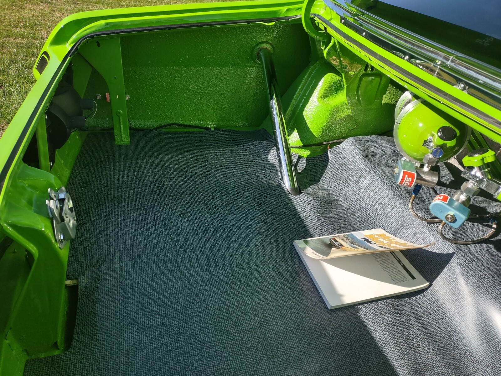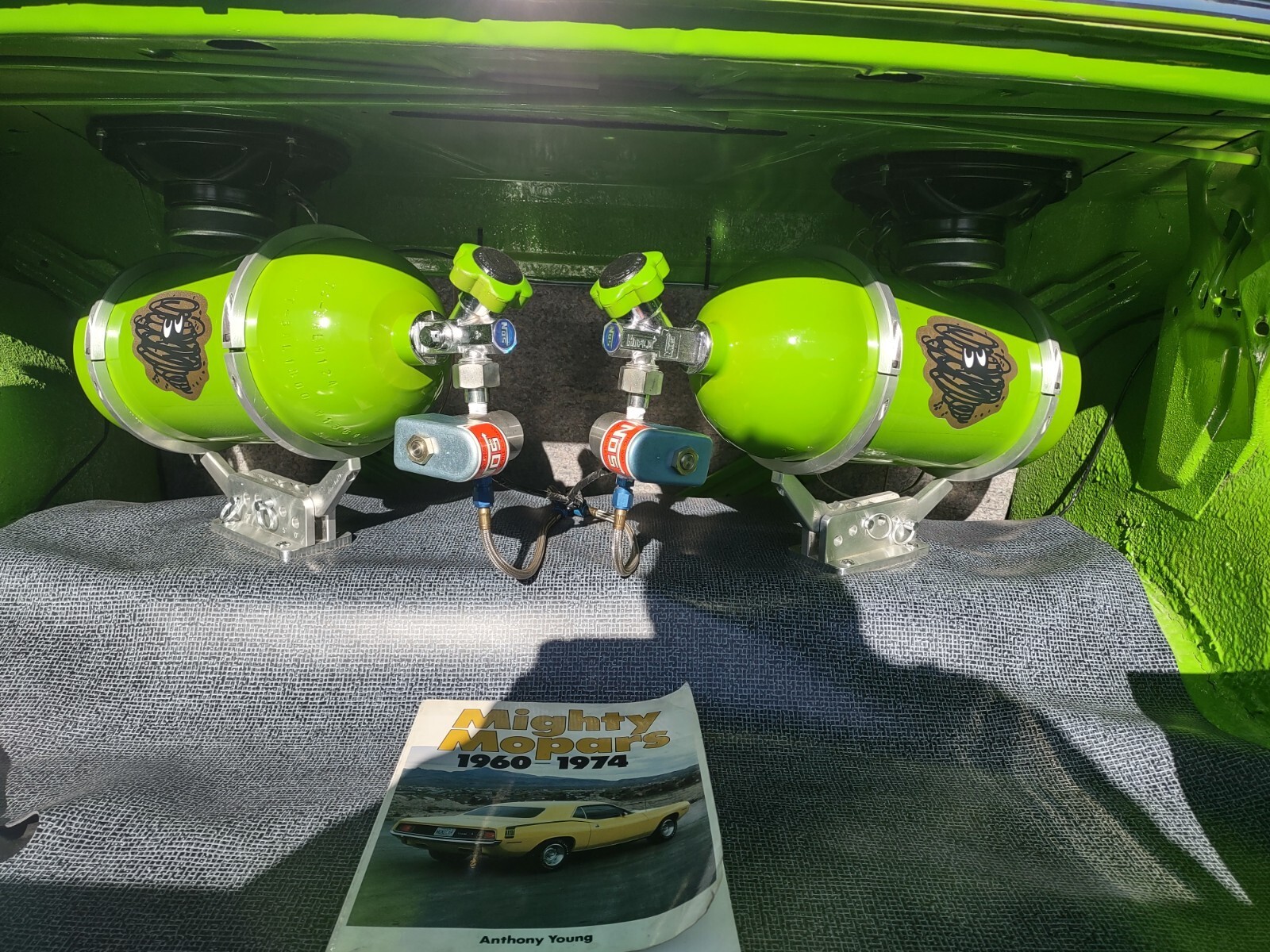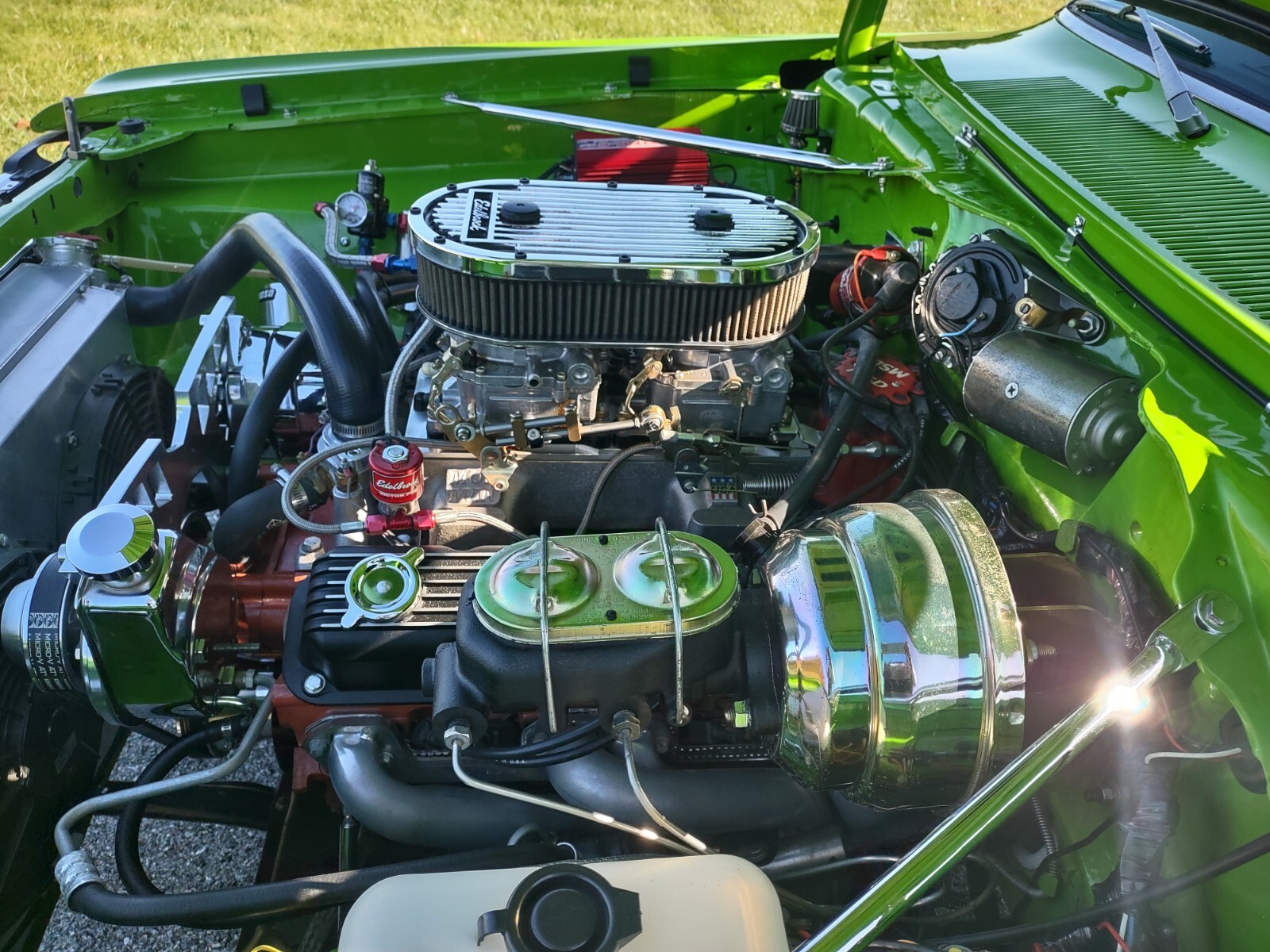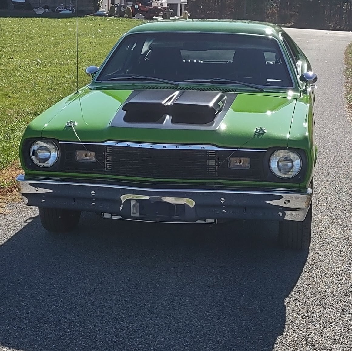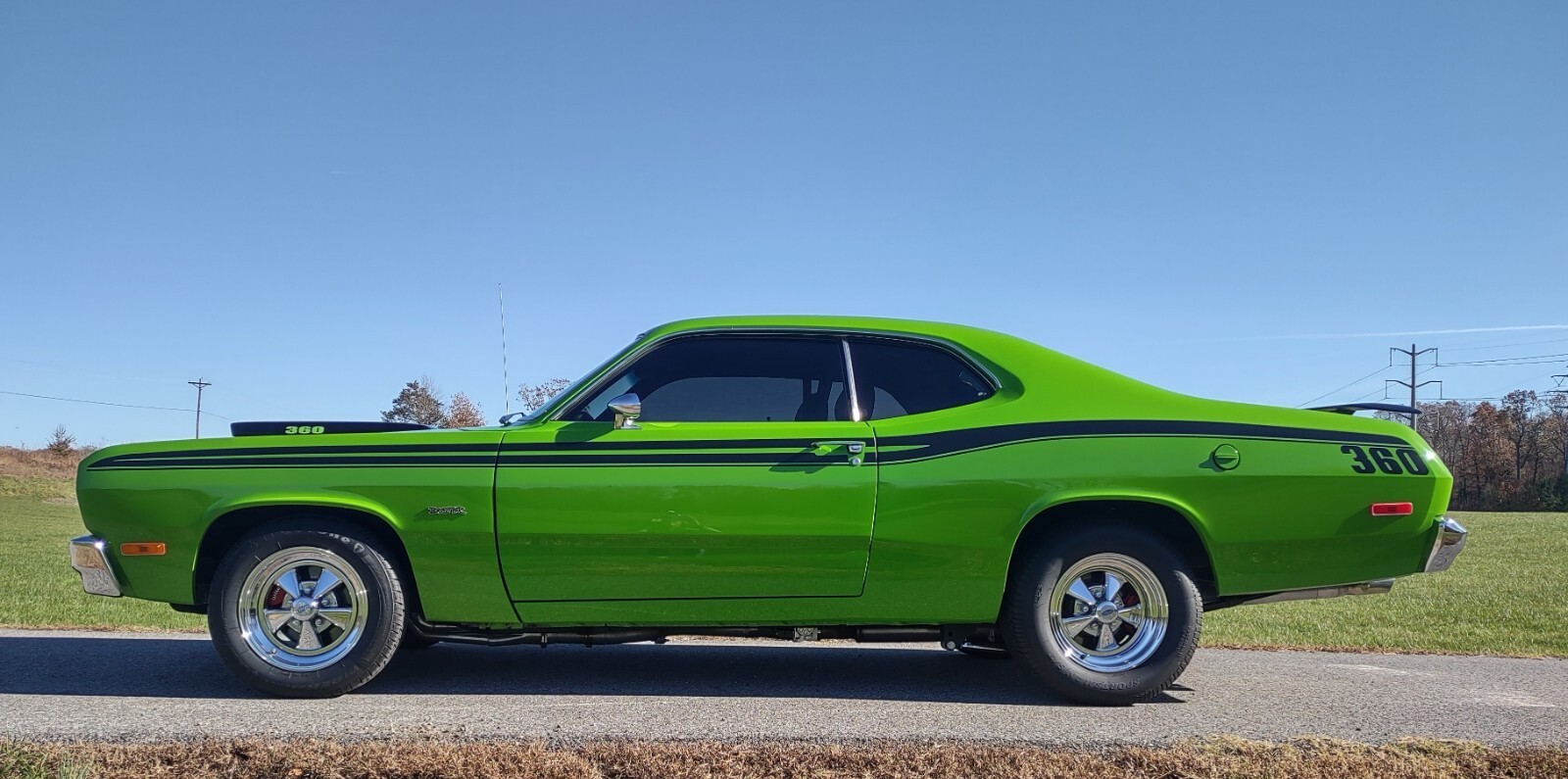 1974 Plymouth Duster 360 Sassy Grass Green. Engine is a 360 Magnum Block, Bored 4.06 with a 4.0 Stroke, internally balanced with Diamond Forged Pistons, I-Beam Rods, Comp Hydraulic Roller Cam and Roller Rockers 10.00 to 1 Compression 415 Cubic Inch, 520 Horsepower, 525 Foot Pounds Torque 500 CFM Dual Edelbrock Carbs. Stainless Steel Fuel and Brake Lines. Moser Axles Installed. MSD Electronic Ignition System. March Performance Billet Aluminum Serpentine System. Griffin Aluminum Radiator with Duel Electric Fans. A833 4-Speed HEMI Transmission by Brewer's Performance. 3" TTI Exhaust System. Wilwood Disk Brakes. CalTracs Traction Bars. 8 3/4" Positraction Rear End Equipped with 3:55 Gears. Mopar Super Stock Leaf Springs. Factory Dual Snorkel Hood Scoop. Restoration Journal with Pics included. Nitrous in trunk has never been used. Bottles are empty and could be used, if buyer chooses. This car has won multiple "Best of Show" awards One cool ride.