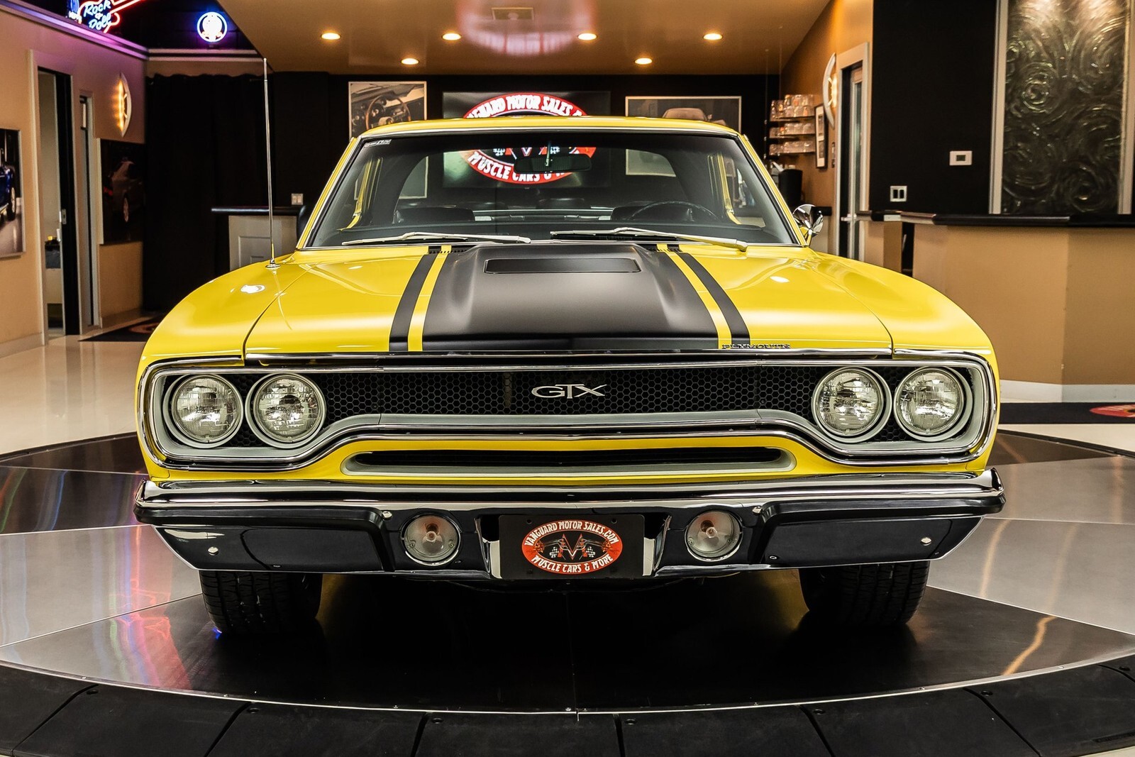 Check out this beautiful 1970 Plymouth GTX! This GTX has undergone a complete rotisserie restoration with high attention to detail! This Plymouth has been finished in the Rare Lemon Twist Mopar Yellow Exterior Paint with a Air Grabber Hood, Black Stripes and Magnum 500 Wheels Wrapped in BFGoodrich Radial T/A Tires! Under the hood sits a 440ci V8 with a Factory Style Carburetor Sitting on top! Power is sent to the road through a Mopar 4 Speed Manual Transmission and Factory Style Suregrip Rear End with 3.55:1 gear ratio. This GTX also has Power Brakes with Front Disc and Power Steering. The Bed Liner Painted Underside features a Factory Style exhaust and Fuel Tank with a factory Style Suspension Setup!