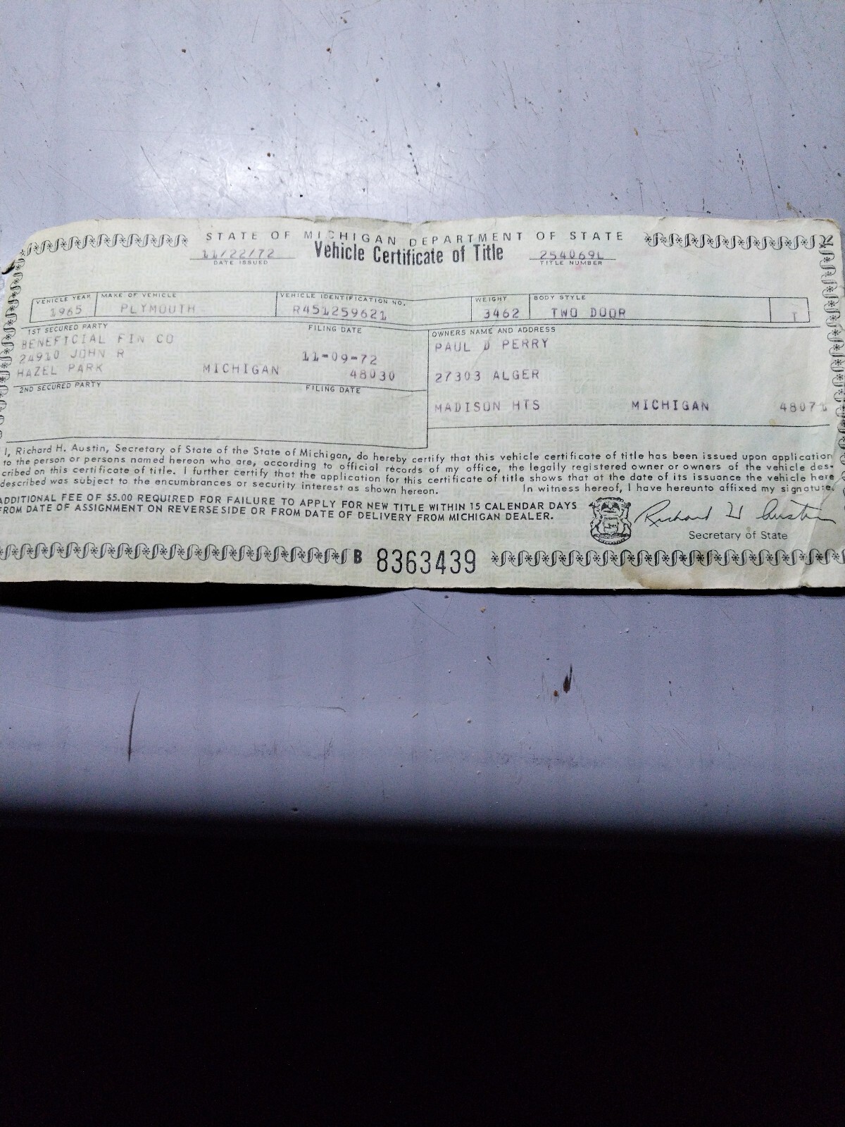 Rare 65 Satellite. Same 2nd owner since 1972. A 383 console 4 speed car. First owner was a Chrysler Engineer. Car has Roadrunner suspension. Swaybars front & rear. Factory traction bars. Original engine. Car stored since 1979. Transmission is 68 Roadrunner. 430-1 Posi rear-end. Too many upgrades to list here. If interested, send a email, and I will give a complete list of improvements and detailed description and pictures. Title had a lean from 1972 till 1973 see photos of title showing lein was discharged. Has original 65 plate as legal plate see pic