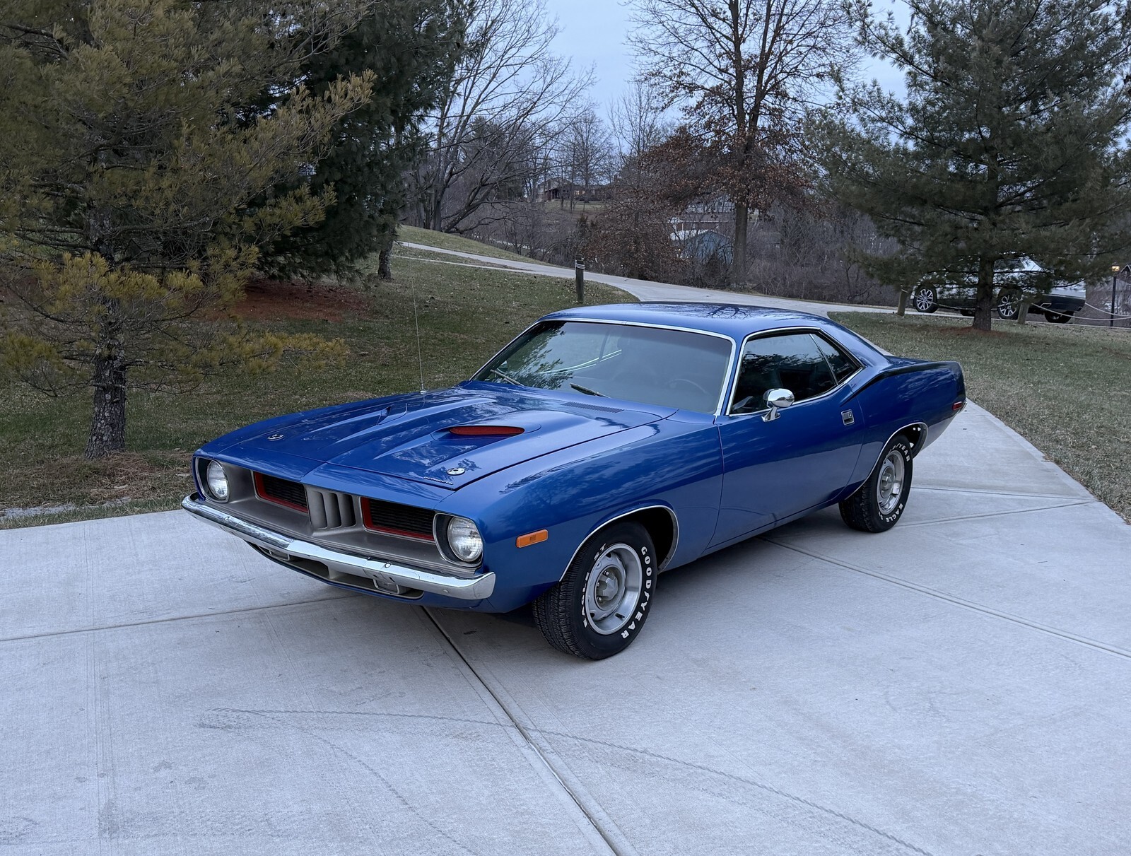 SHARP DESIRABLE 1974 CUDA REAL BS23 FACTORY CUDA HAS (NOM) STRONG 340 ENGINE AUTO PS PDB SUPER SOLID AND STRAIGHT LOOKS TO BE ORIGINAL METAL BEAUTIFUL B5 BRIGHT BLUE METALLIC PAINT AND LIKE NEW BLACK BUCKETS CONSOLE INTERIOR