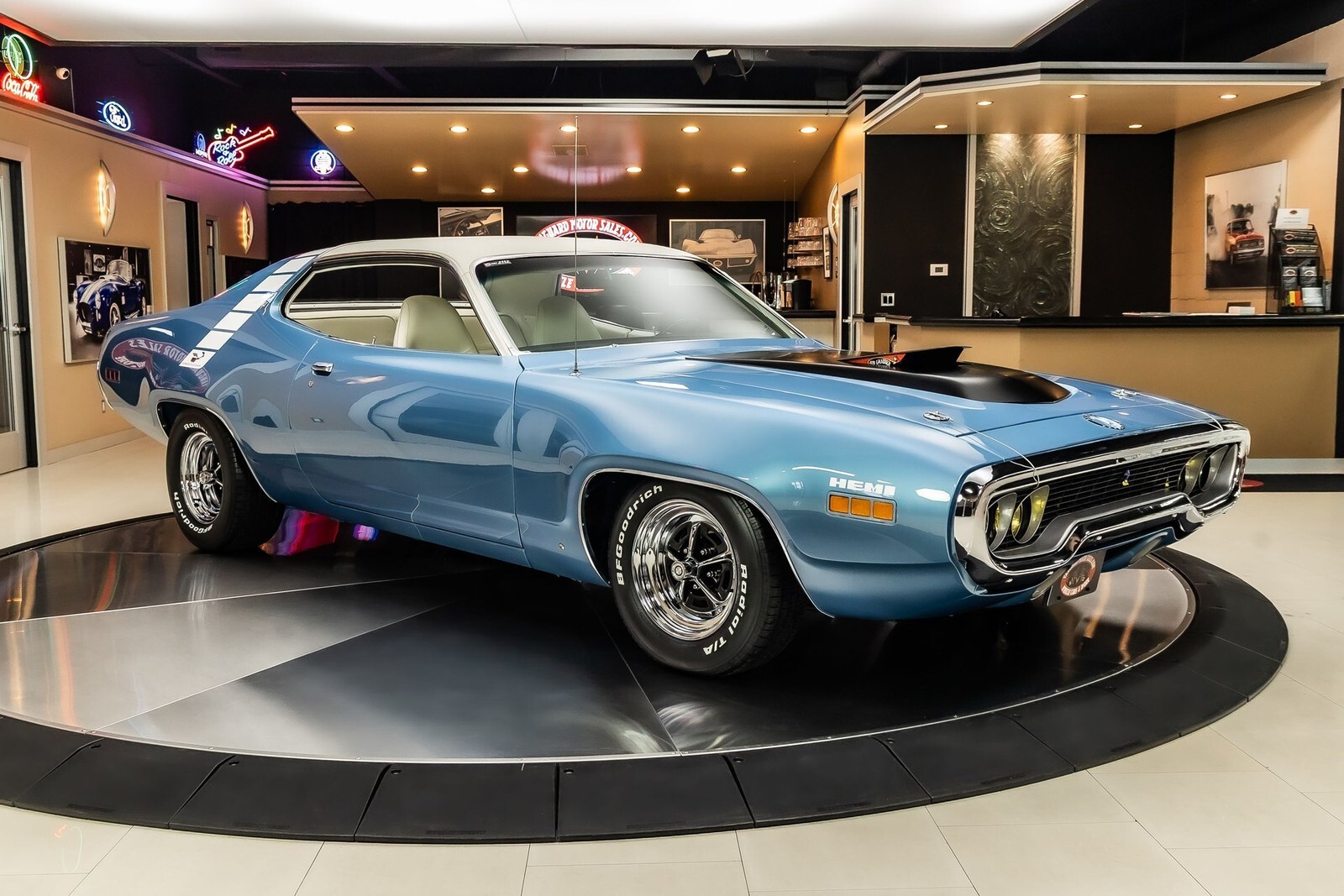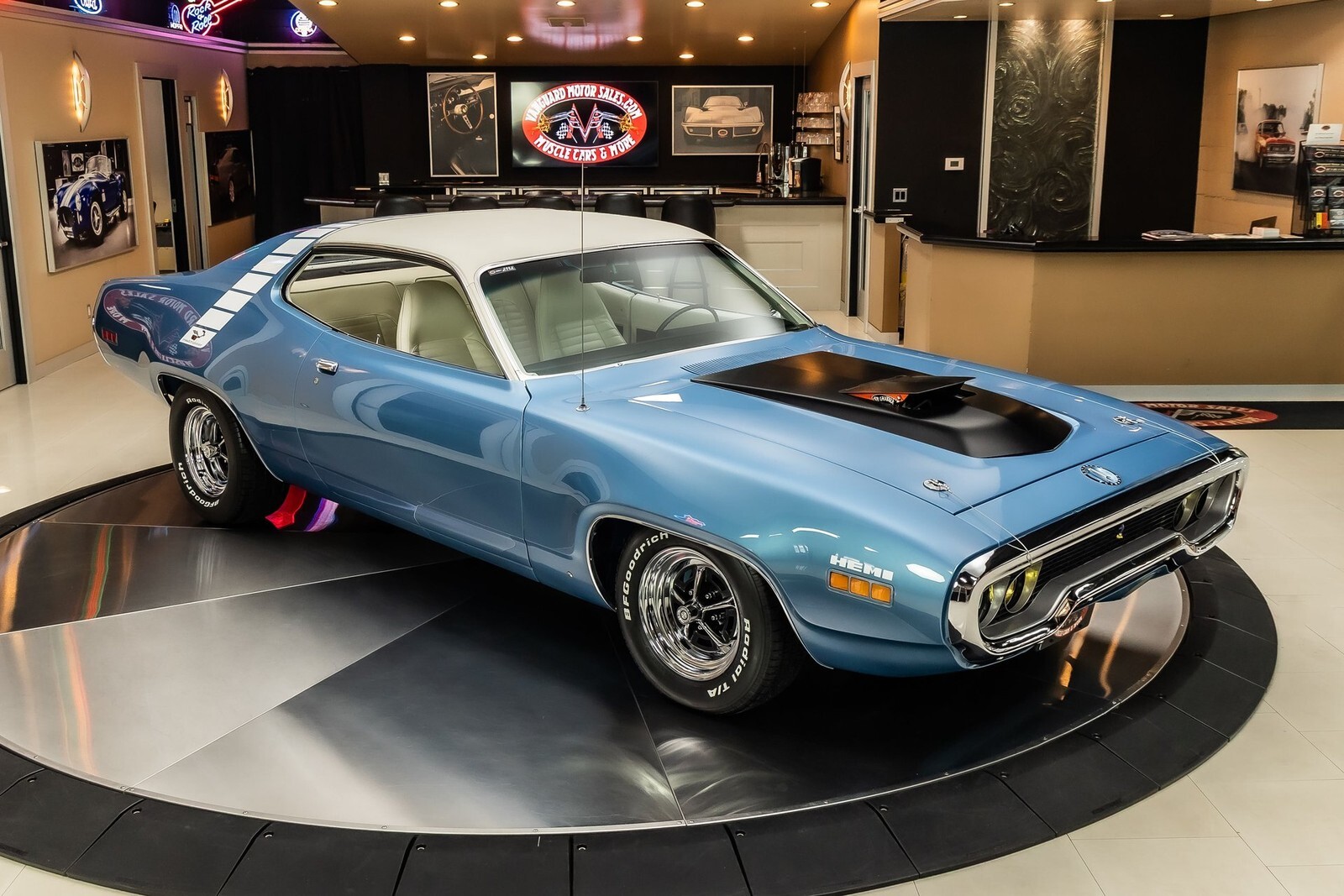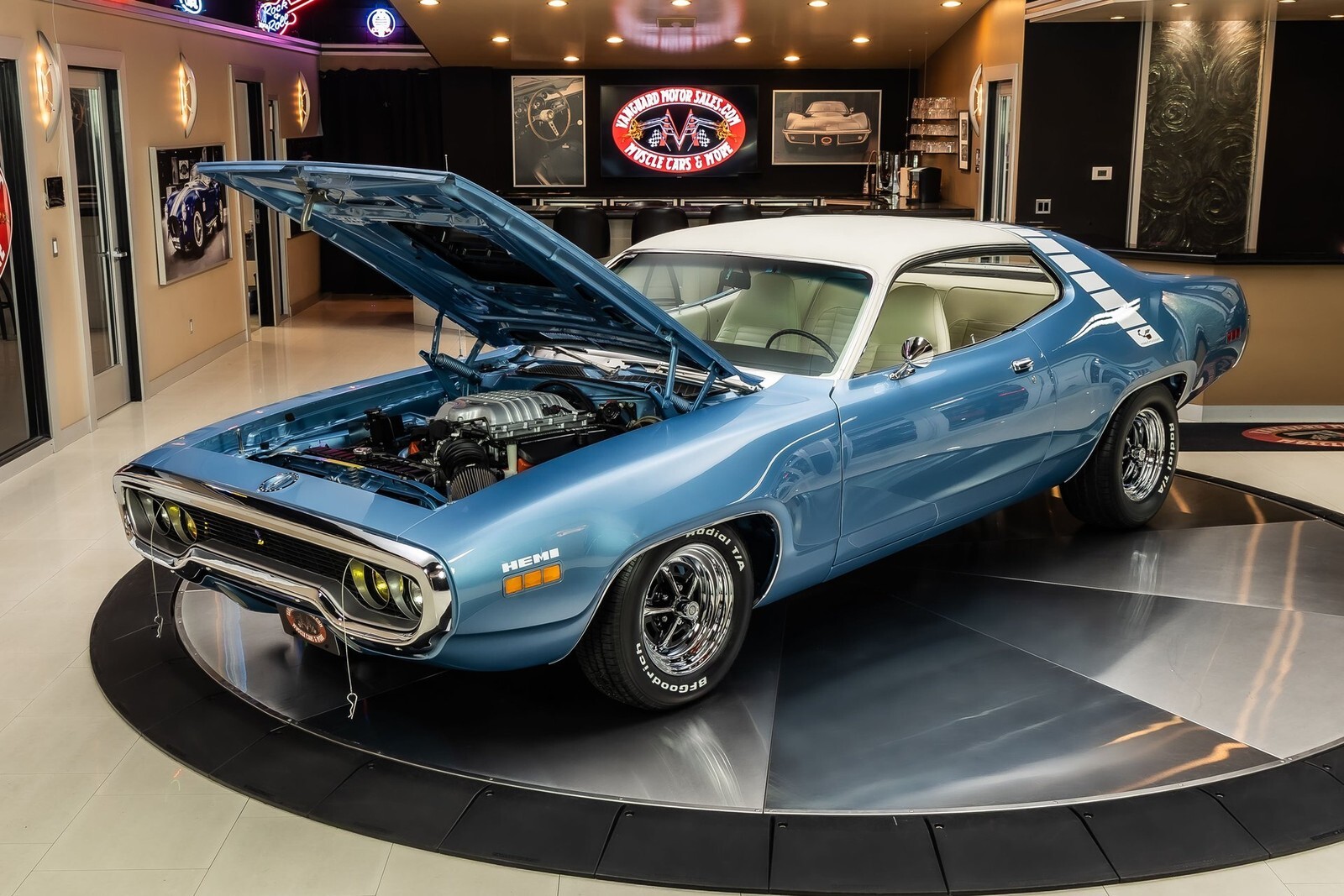 Check out this beautiful 1971 Plymouth Roadrunner! This Roadrunner has undergone a complete & meticulous frame-off restoration and received many tasteful upgrades along the way! This Roadrunner has been finished in Light Blue Exterior Paint with a White Vinyl Top and features Magnum 500 Wheels Wrapped in BFGoodrich Radial T/A Tires to complete the Look! Under the hood sits a Supercharged Hellcat 6.2l V8 Engine making over 700hp! Power is sent to the Rear Wheels through a 4 Speed Manual Transmission, & Sure Grip Rear End with a 3.23:1 Gear Ratio. Additional Features Include, Power Brakes w/ Front Disc, Factory Style New Front Suspension, Power Steering, New Hardware, New Brake Lines, New Fuel Lines and a New Gas Tank!