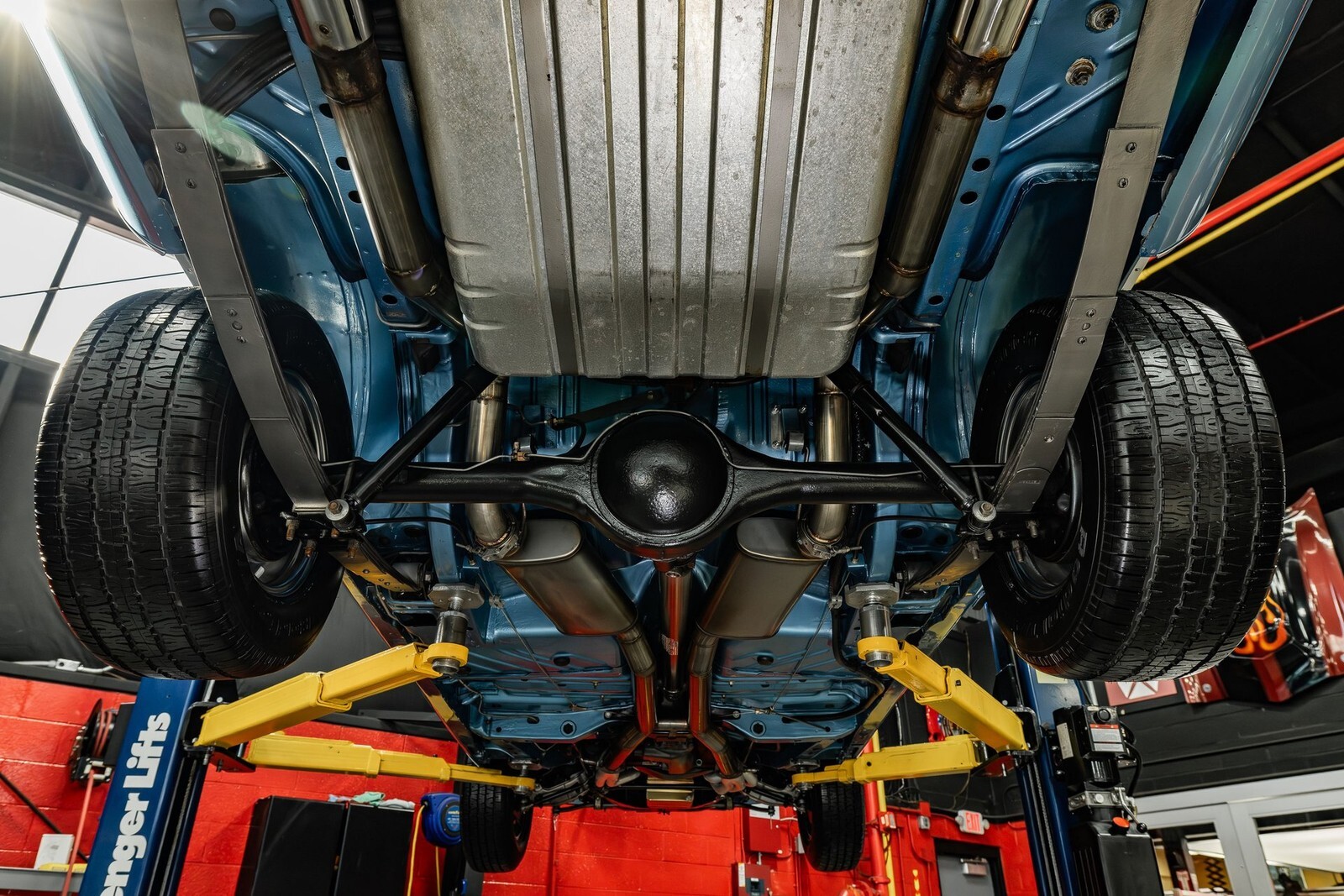 Inside, this Roadrunner is a fully restored cabin finished in Black Carpeting along with the Black dashboard & White Vinyl Seating. The cabin features a Front split Bench Seat, Rear Bench Seating, White Headliner, Lap Belts & the Pistol Grip 4 Speed Manual Floor Shifter! On the dash is Factory Style Gauges with a Cassette Player System and the Factory Style Steering Wheel! The underside has been finished in Body Color Matched Paint and features a New Driveshaft and Mandrel Bent Stainless Exhaust System!