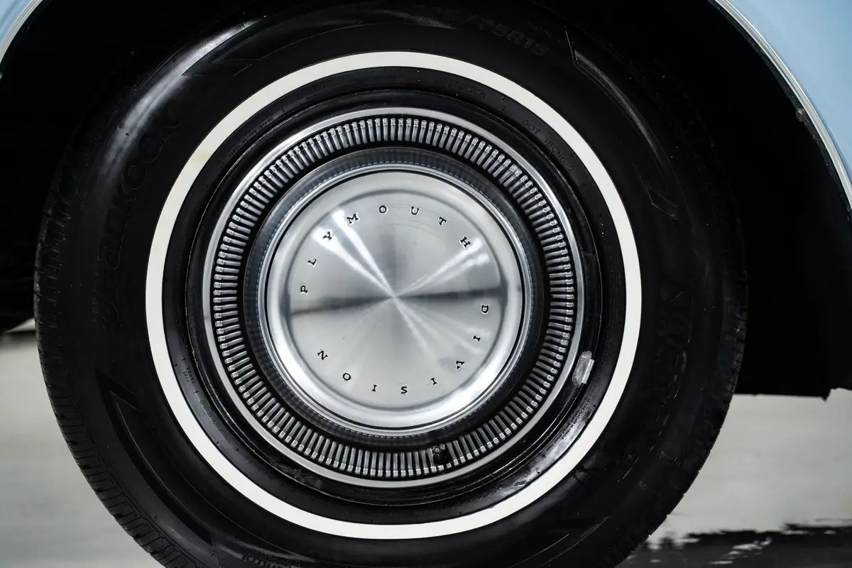 Finished in Blue Sky with a white vinyl top, the exterior still carries the elegant presence that defined the Fury lineup. The 15-inch wheels wear full hubcaps and whitewall tires, completing the classic look. Inside, the dark blue vinyl split bench seat with a folding armrest sets a relaxed tone, perfectly matched to the car's original character.
