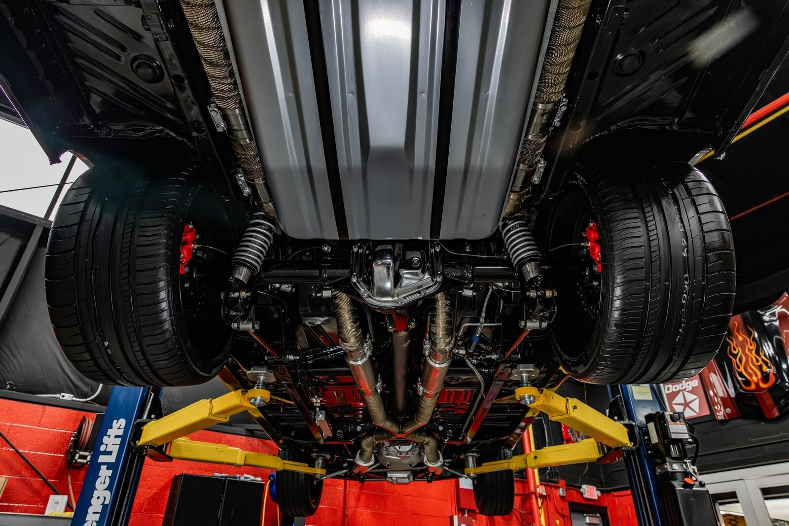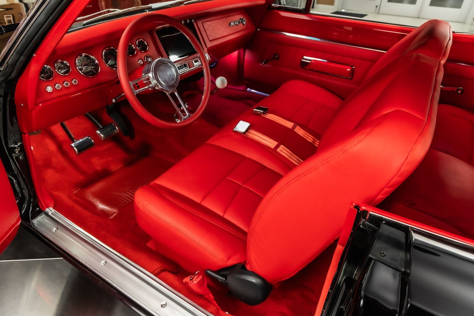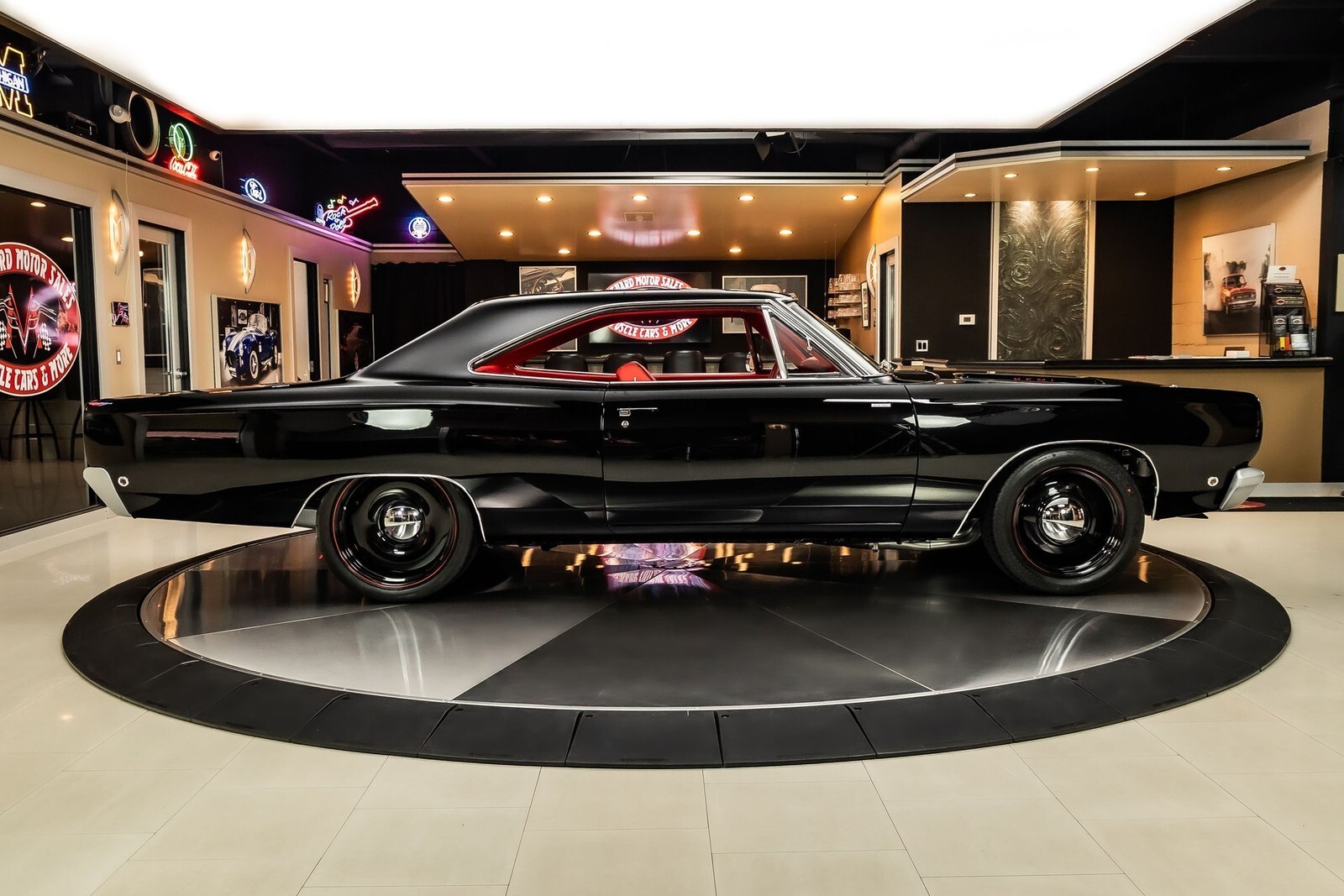 Inside, this Roadrunner is a fully restored cabin finished in Red Carpeting along with the Red dashboard & Red Vinyl Seating. The cabin features a Front Bench Seat, Rear Bench Seating, Red Headliner, Lap Belts & the 5 Speed Manual Floor Shifter! On the dash is Aftermarket Gauges on a Fully Customized Dash Board with a Custom Aftermarket Stereo System and the Custom Leather Wrapped Steering Wheel! The underside has been finished in Semi Gloss Black and features a Band clamped Exhaust System wrapped in heat tape!
