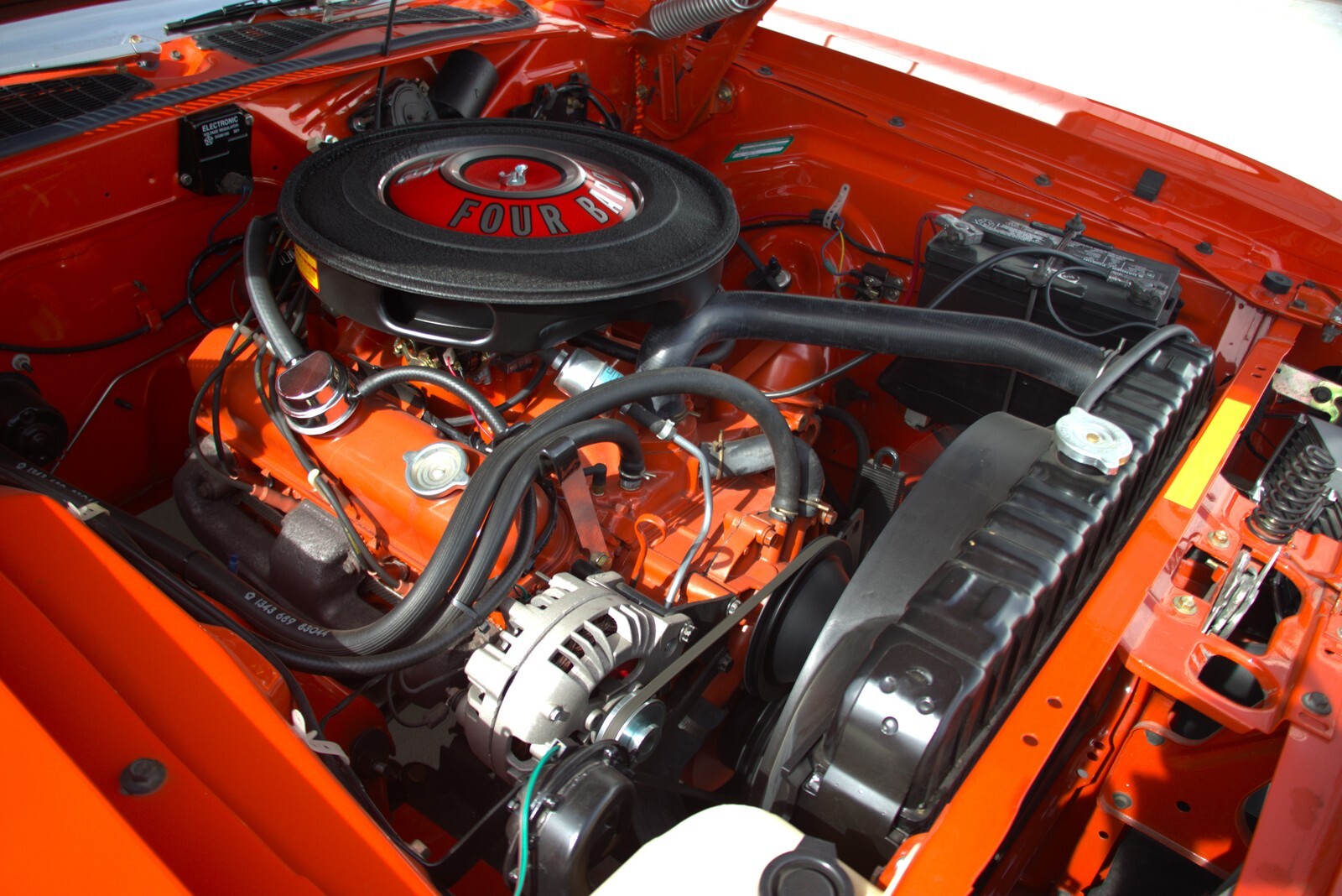 The SPECS:340 CIHemi Orange with Black Vinyl TopBillboard StripesElectric ChokeEdelbrock CarburetorOE-Style Radiator and ShroudCorrect Air Cleaner AssemblyOE Hoses and ClampsA833 4-SpeedPistol-Grip Shifter8 3/4 Rear 3.91 SuregripPower SteeringManual Disc Brakes Hood InsulationRally WheelsBF Goodrich Radial TiresWood WheelRallye GaugesTrip OdometerAM Pushbutton RadioConsoleTrunk MatOE Dual ExhaustRemote Drivers Side Mirror