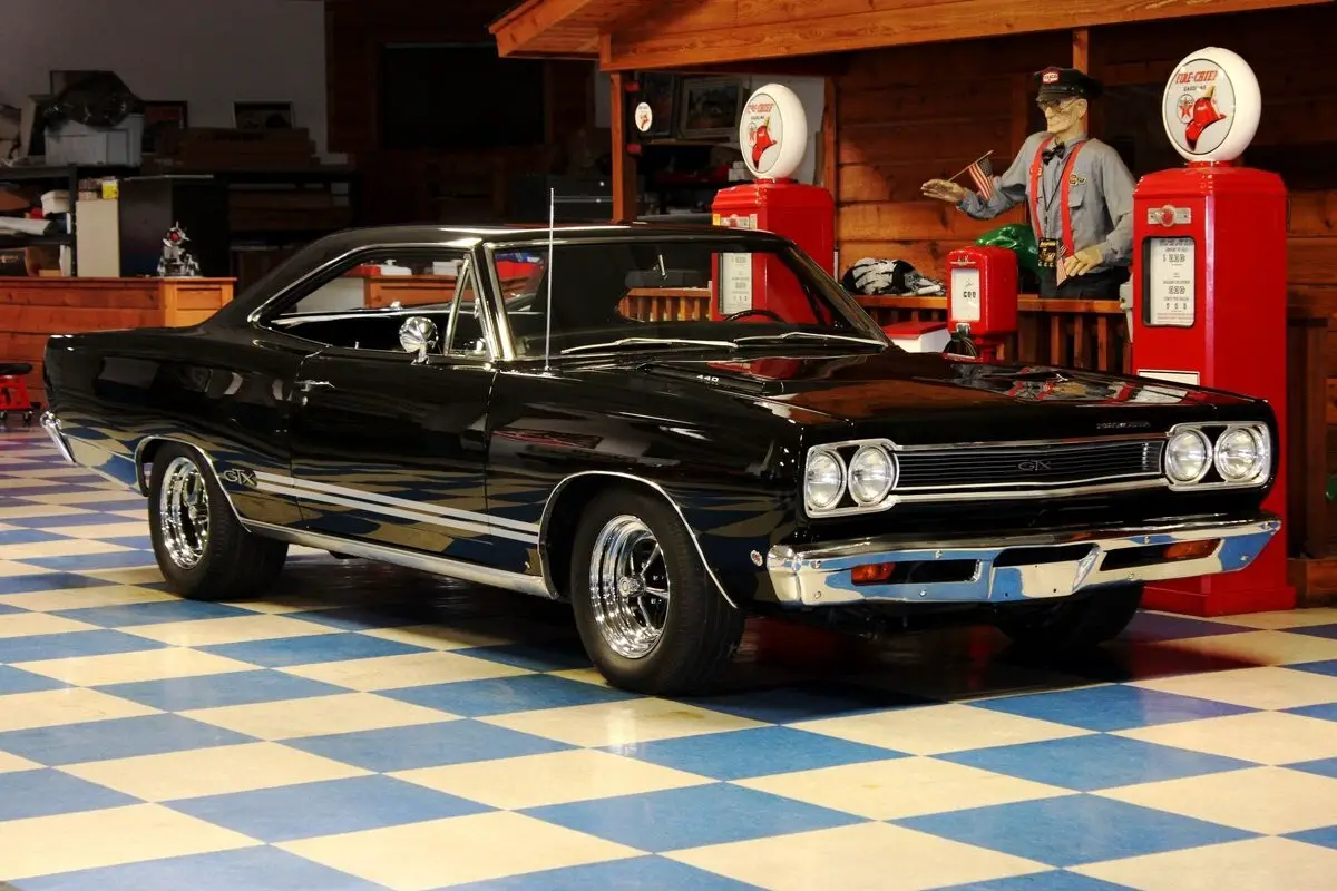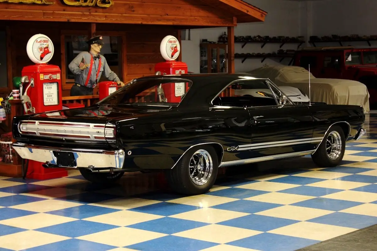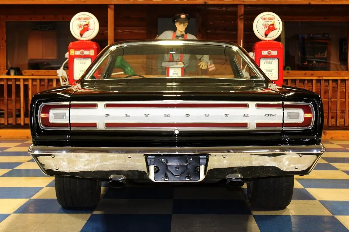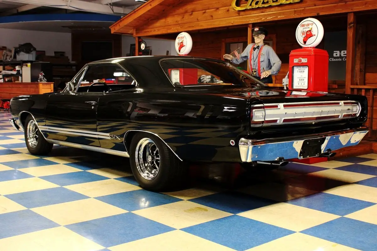 Period Correct 440 cui Mopar V8 engine (casting# 2536480-8). Automatic 727 transmission. 8 3/4 rear end. Painted Black with Silver rocker stripe. Black vinyl bucket seat interior. Power steering. Front disc brakes. Dual exhaust with manifolds. Front sway bar. Edelbrock 4 barrel carburetor. Factory style hose clamps. Factory style gauge cluster. Wood-grain interior accents. Front / Rear lap belts. Functional Chrysler Solid State AM radio. 15" Magnum wheels. True '68 Plymouth GTX 440 vehicle.