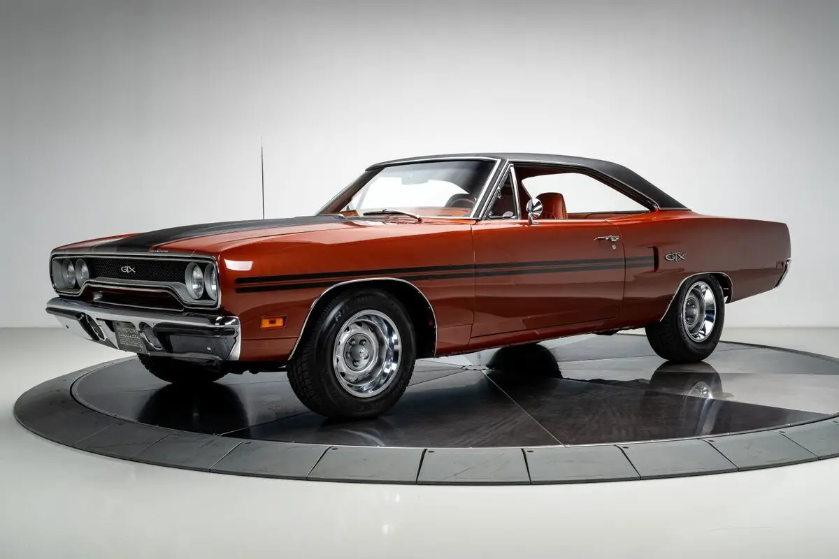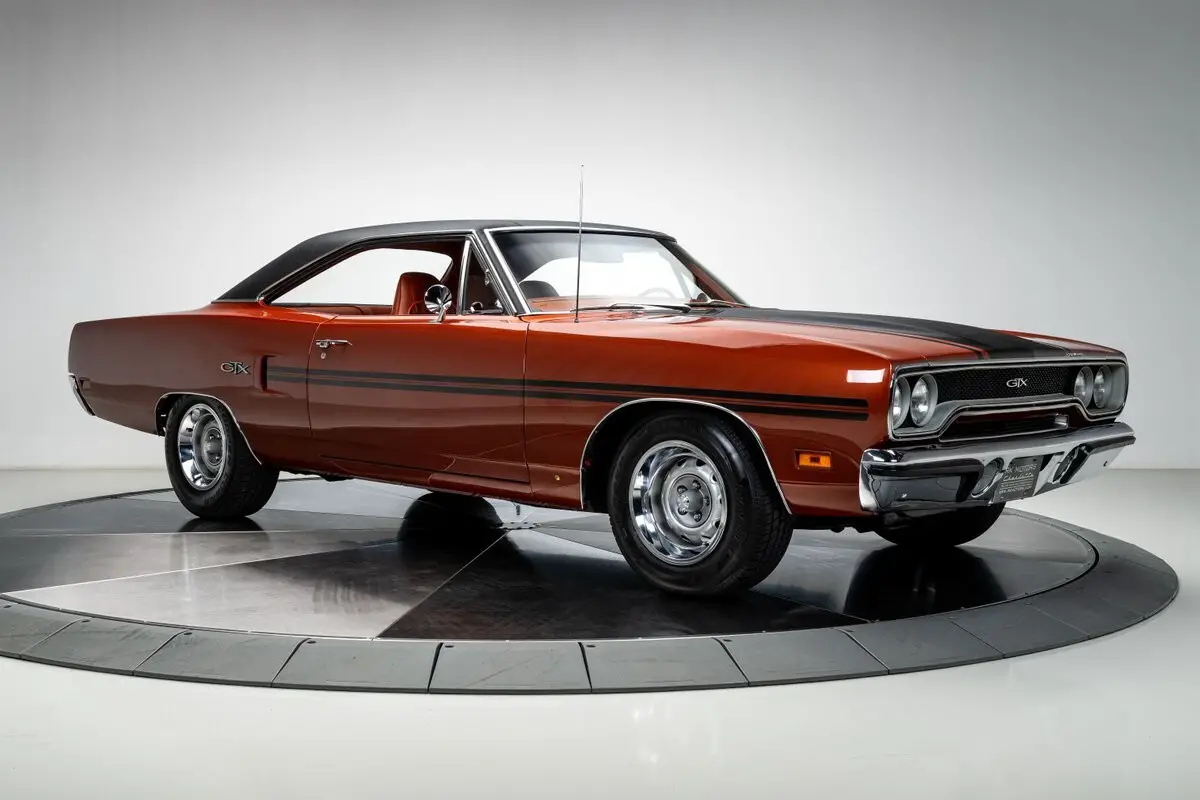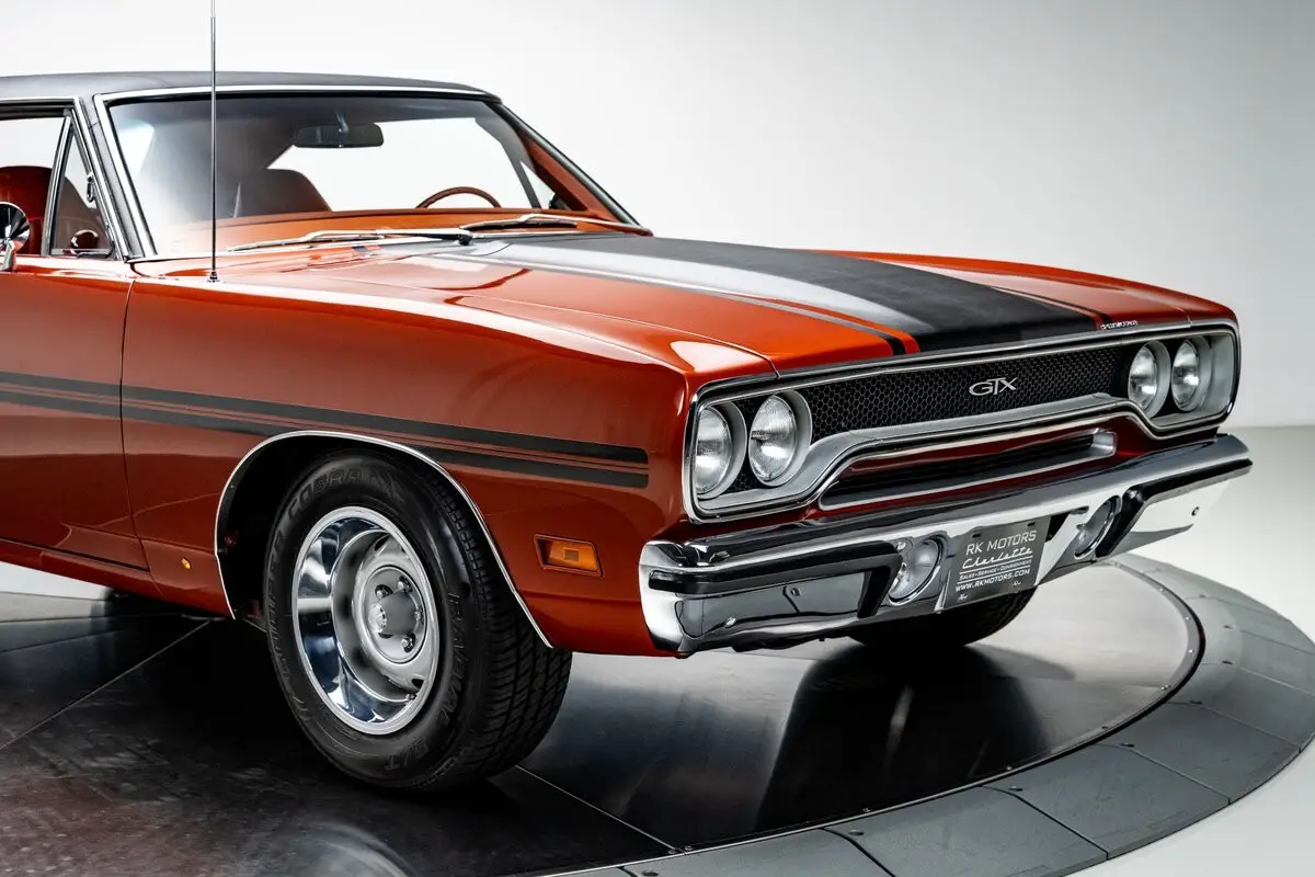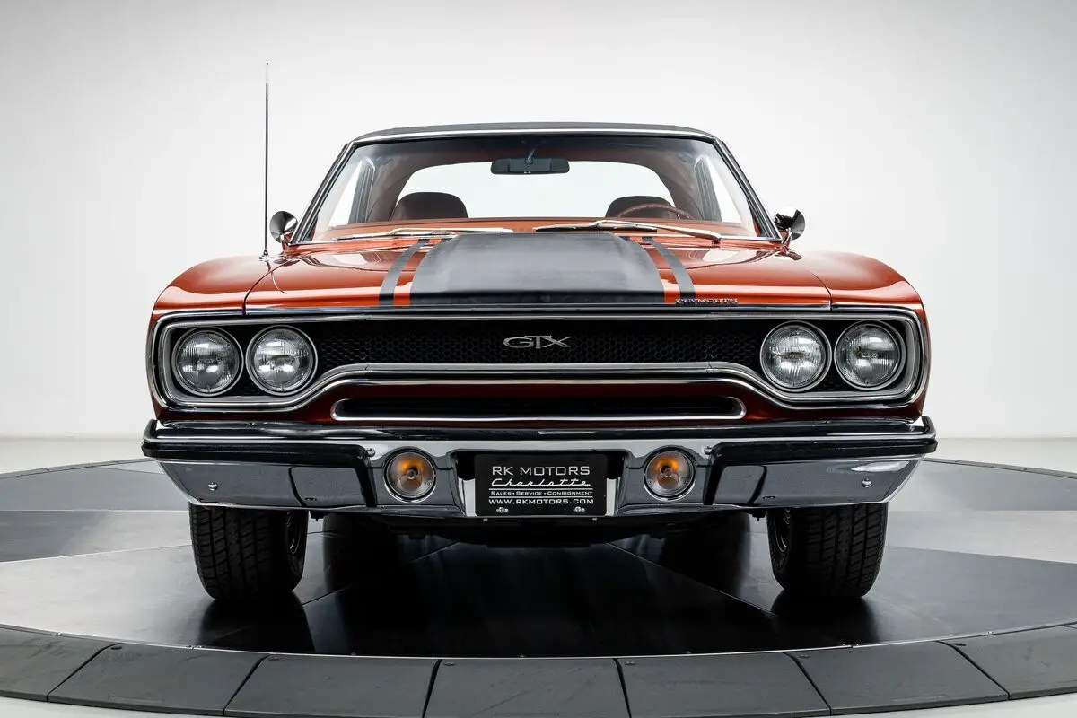 Burnt Orange is one of the high-impact colors that immediately defines a Mopar, and on this 1970 Plymouth GTX it reinforces the model's position as Plymouth's premium "gentleman's muscle car." This numbers-matching example pairs its 440ci Super Commando V8 and automatic drivetrain with a well-optioned factory specification supported by its original window sticker and extensive documentation. The car has benefited from a meticulous ground up restoration, presenting with clean panel alignment, consistent gaps, and a well-finished Burnt Orange exterior accented by a black vinyl top and factory Performance Hood Treatment. A matching VIN stamp remains visible on the radiator support, and the stance is properly set over 15" wheels with
