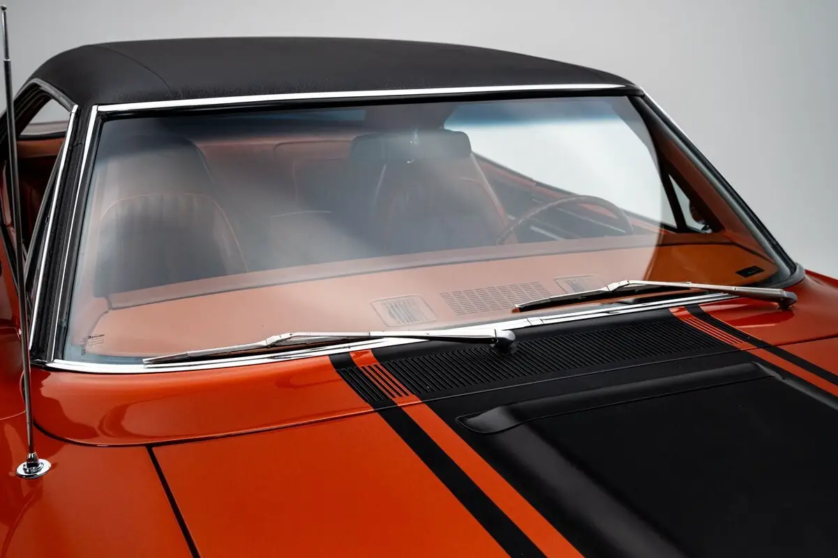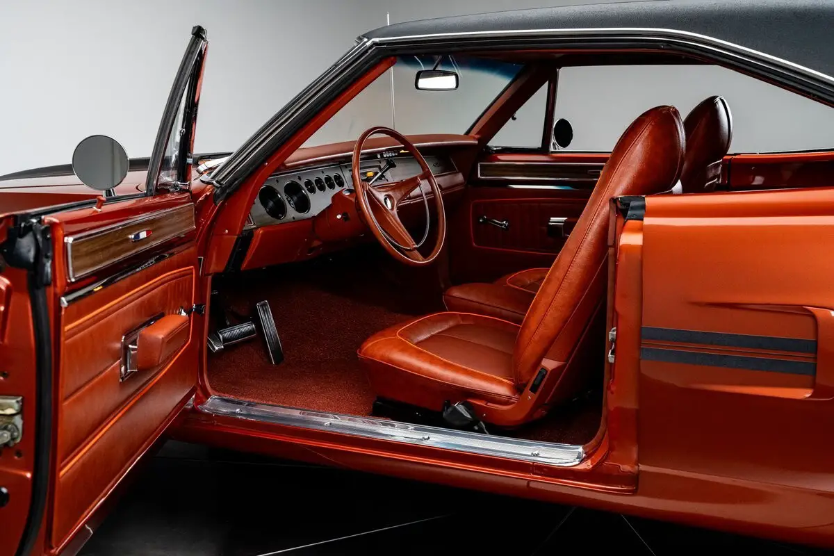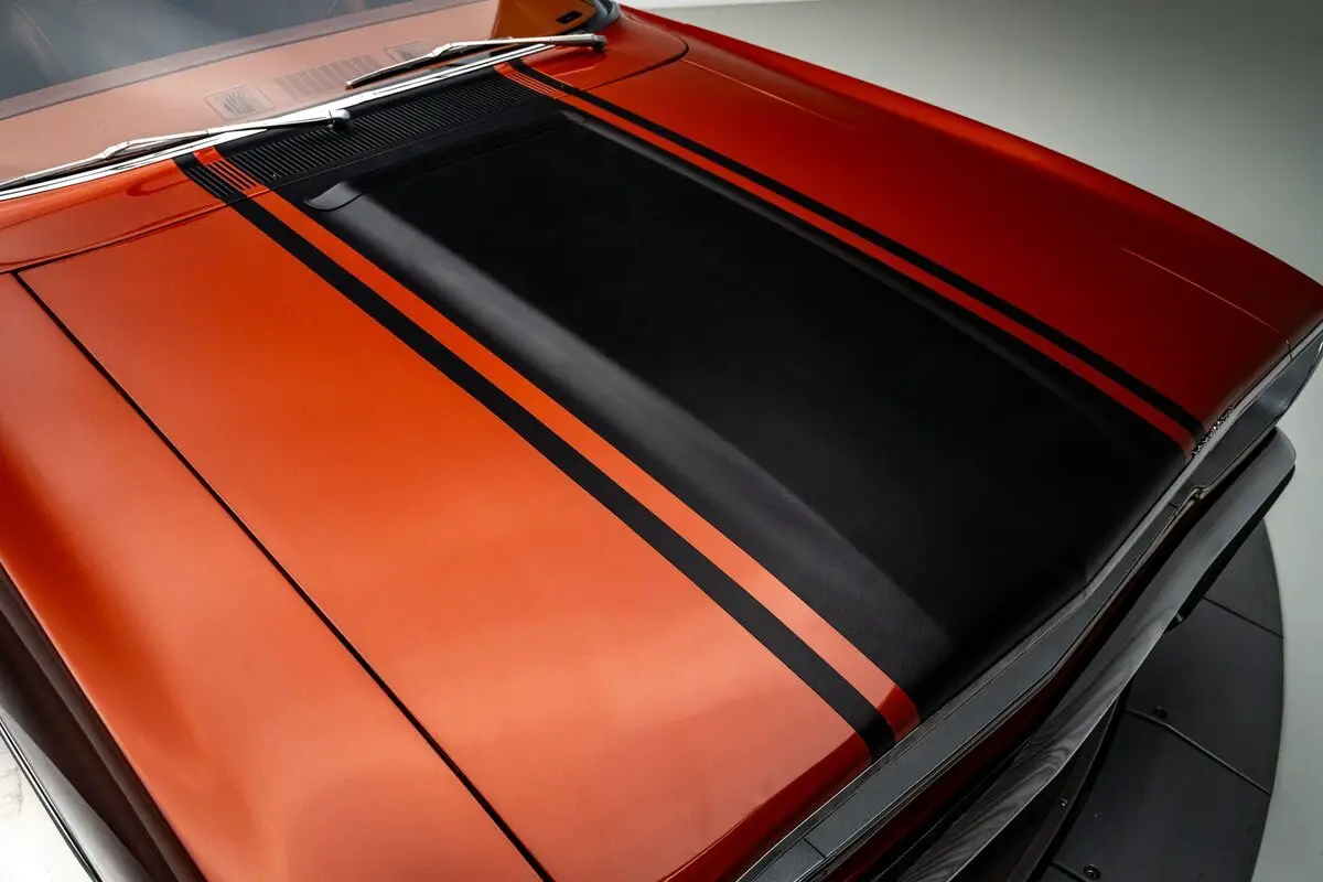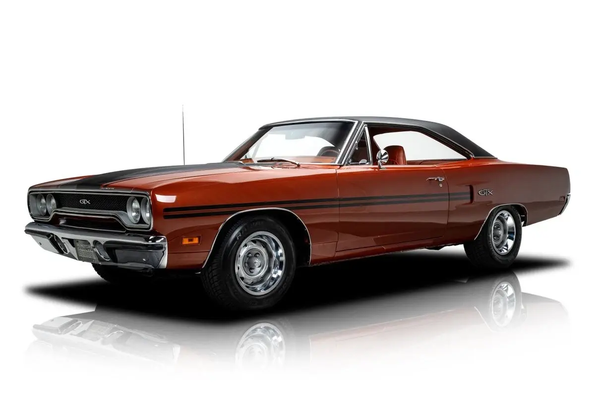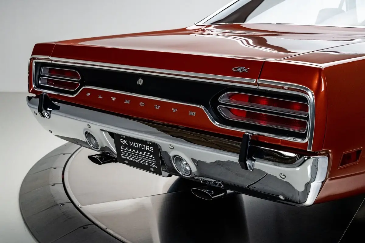 Burnt Orange is one of the high-impact colors that immediately defines a Mopar, and on this 1970 Plymouth GTX it reinforces the model's position as Plymouth's premium "gentleman's muscle car." This numbers-matching example pairs its 440ci Super Commando V8 and automatic drivetrain with a well-optioned factory specification supported by its original window sticker and extensive documentation. The car has benefited from a meticulous ground up restoration, presenting with clean panel alignment, consistent gaps, and a well-finished Burnt Orange exterior accented by a black vinyl top and factory Performance Hood Treatment. A matching VIN stamp remains visible on the radiator support, and the stance is properly set over 15" wheels with