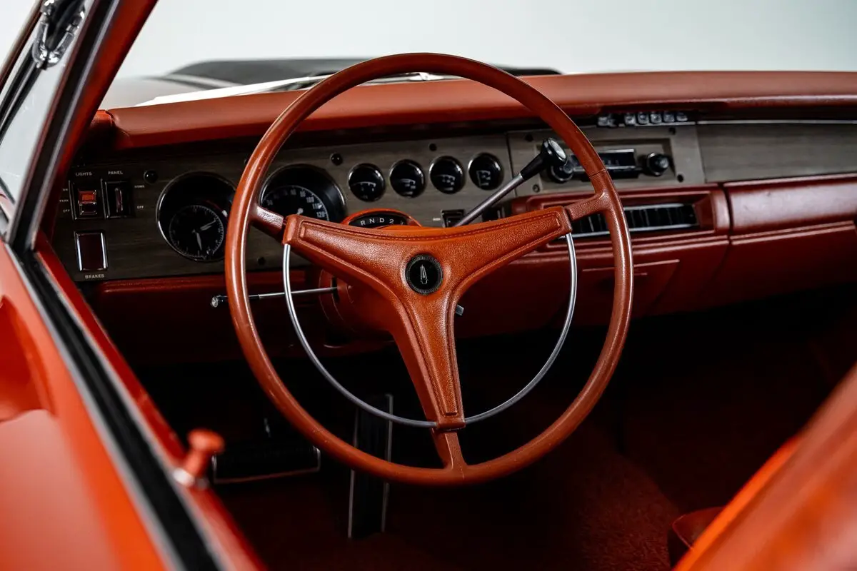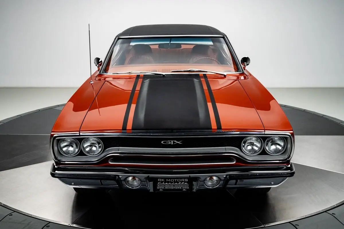 Burnt Orange is one of the high-impact colors that immediately defines a Mopar, and on this 1970 Plymouth GTX it reinforces the model's position as Plymouth's premium "gentleman's muscle car." This numbers-matching example pairs its 440ci Super Commando V8 and automatic drivetrain with a well-optioned factory specification supported by its original window sticker and extensive documentation. The car has benefited from a meticulous ground up restoration, presenting with clean panel alignment, consistent gaps, and a well-finished Burnt Orange exterior accented by a black vinyl top and factory Performance Hood Treatment. A matching VIN stamp remains visible on the radiator support, and the stance is properly set over 15" wheels with wider rear rubber. Under the hood, the numbers-matching 440 is backed by a numbers-matching A727 TorqueFlite automatic transmission sending power to an 8 3/4" rear axle with 3.23 gears, while electronic ignition, factory power front disc brakes, power steering, and an upgraded Sanden A/C compressor improve drivability without altering the car's character. Inside, Burnt Orange premium vinyl bucket seats complement the exterior, joined by rally instrumentation, the rare optional buddy seat, Light Package, factory AM radio, and factory air conditioning. With its documented provenance, desirable color combination, and authentic big-block specification, this GTX represents a well-preserved and thoroughly supported example of one of the era's cornerstone muscle cars.