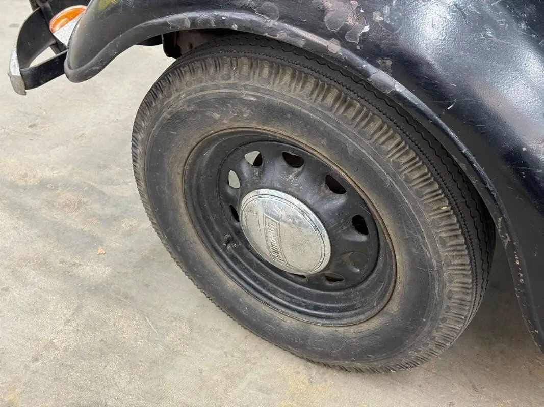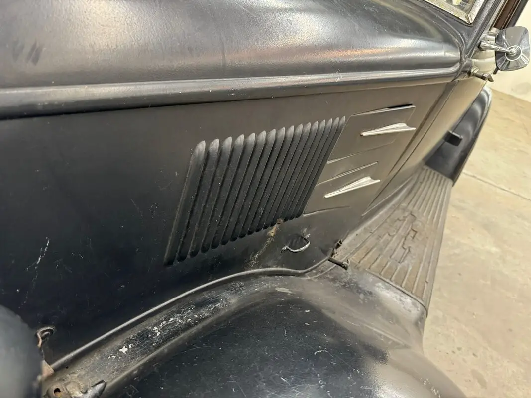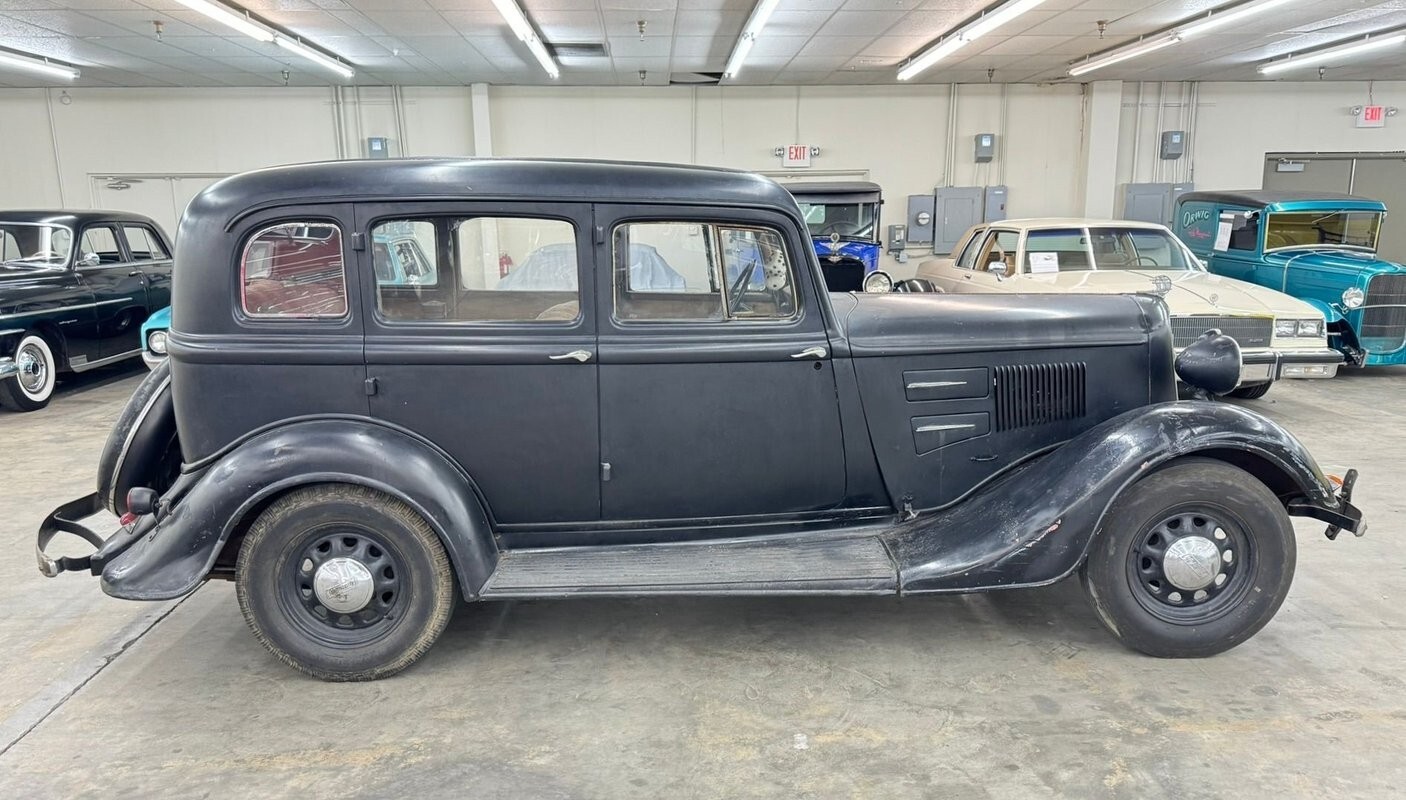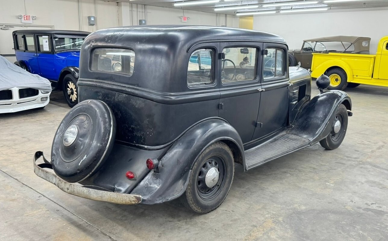 Black covers the car which would have been one of six color options in 1934. In a wonderful paint chip guide from 1934, it states a black car could have had Ivory, Vermillion Red, or like our car, black wheels. The rear wheels, we note, are locked up. The paint is faded of course and shows plenty of patina with bubbles, scratches and other imperfections. Stylistically, the tall grille is flanked by headlights mounted on the fenders and the engine covers on either side have both louver and vents. The sailing ship hood ornament leans forward, as if pushed by the wind behind it, and represents the Mayflower and its moorage at Plymouth Rock. When looked at from the side, the car has a tall profile, lots of windows, and reverse hinged doors in the front and the back, something that is rather uncommon. The side mirror is a modern add on and the car retains its spare tire case mounted on the rear. The body is mostly straight but the car would benefit from a restoration of the paint and metal work.