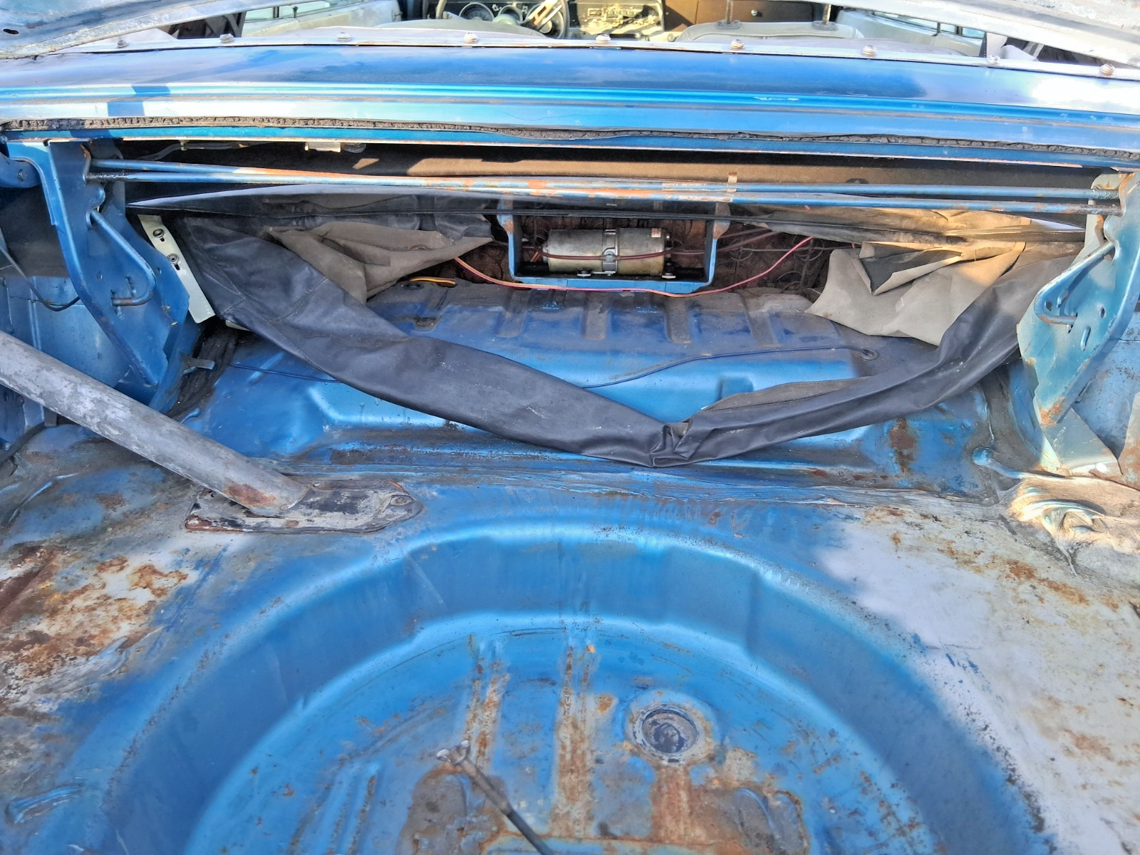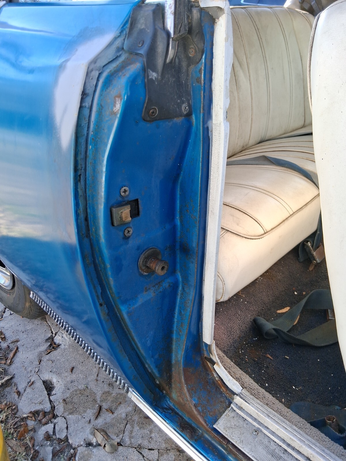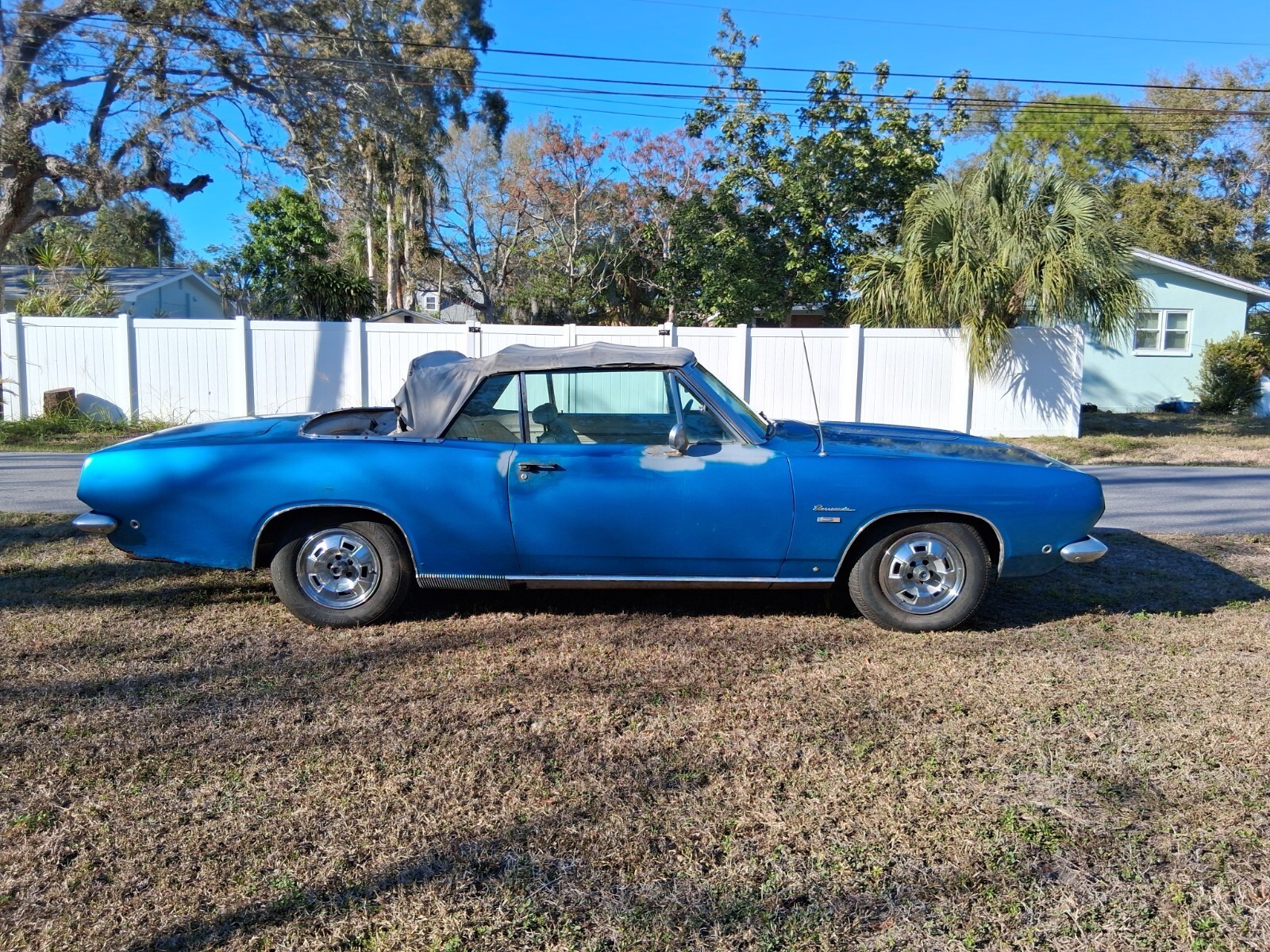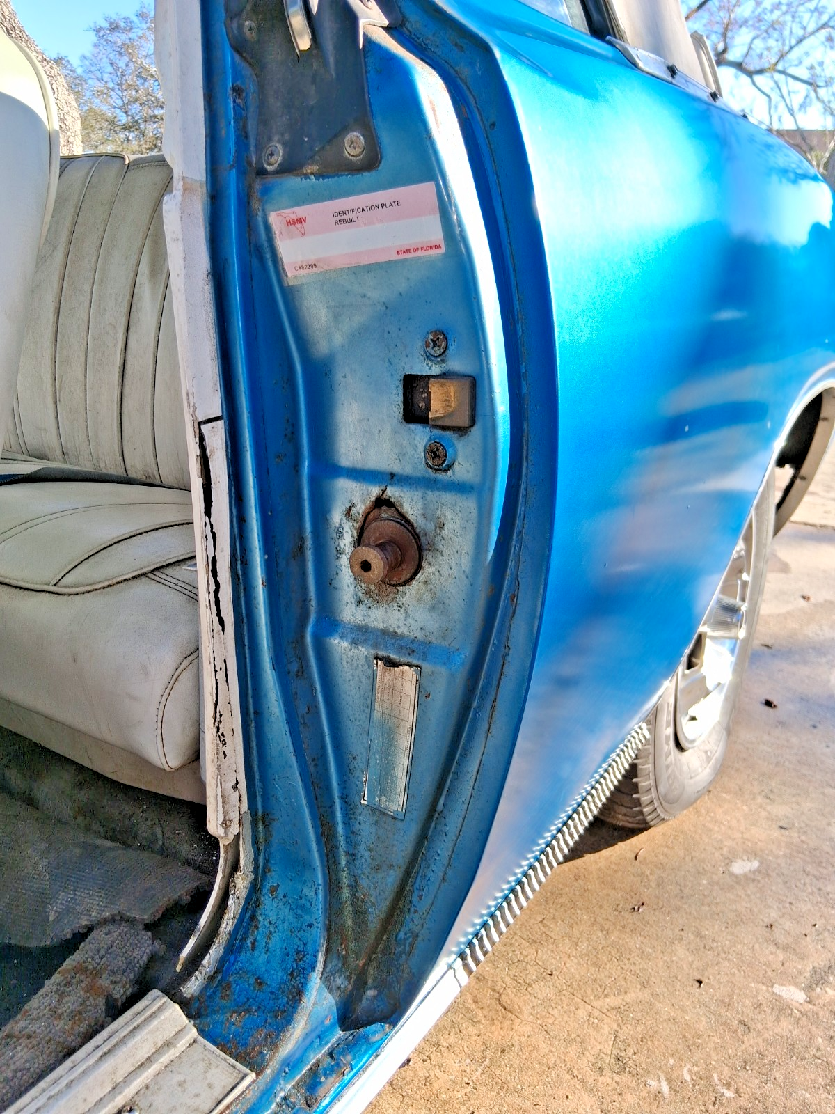 INTERIORWhite interior, white top, blue carpet. Beautiful color combo with the factory blue paint. It needs a full interior kit. It's all there but tired looking. Top is way shot but the power top does go up n down. Gauges work, interior dome lights, horn work. Lights work. Car had to pass Florida inspection for title issuance. Car comes with a very nice dash face with gauges. Chrome items are pitted. Simple interior to make awesome. Windows roll up and down.