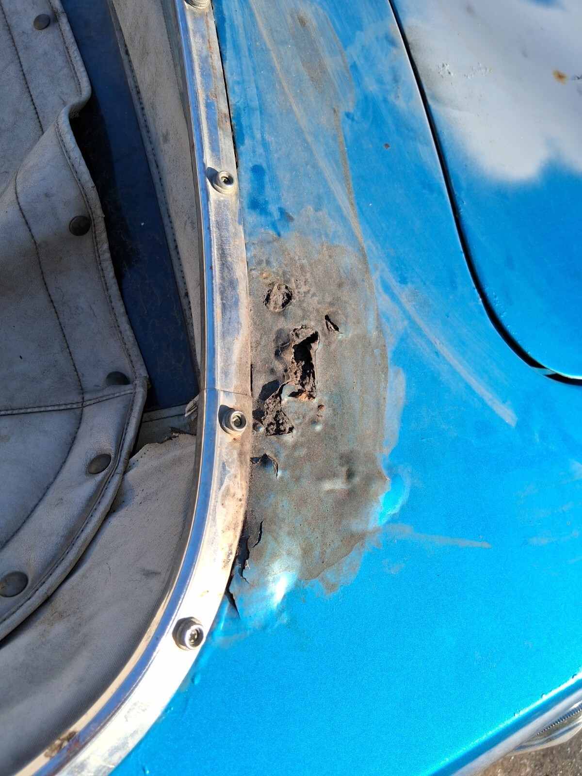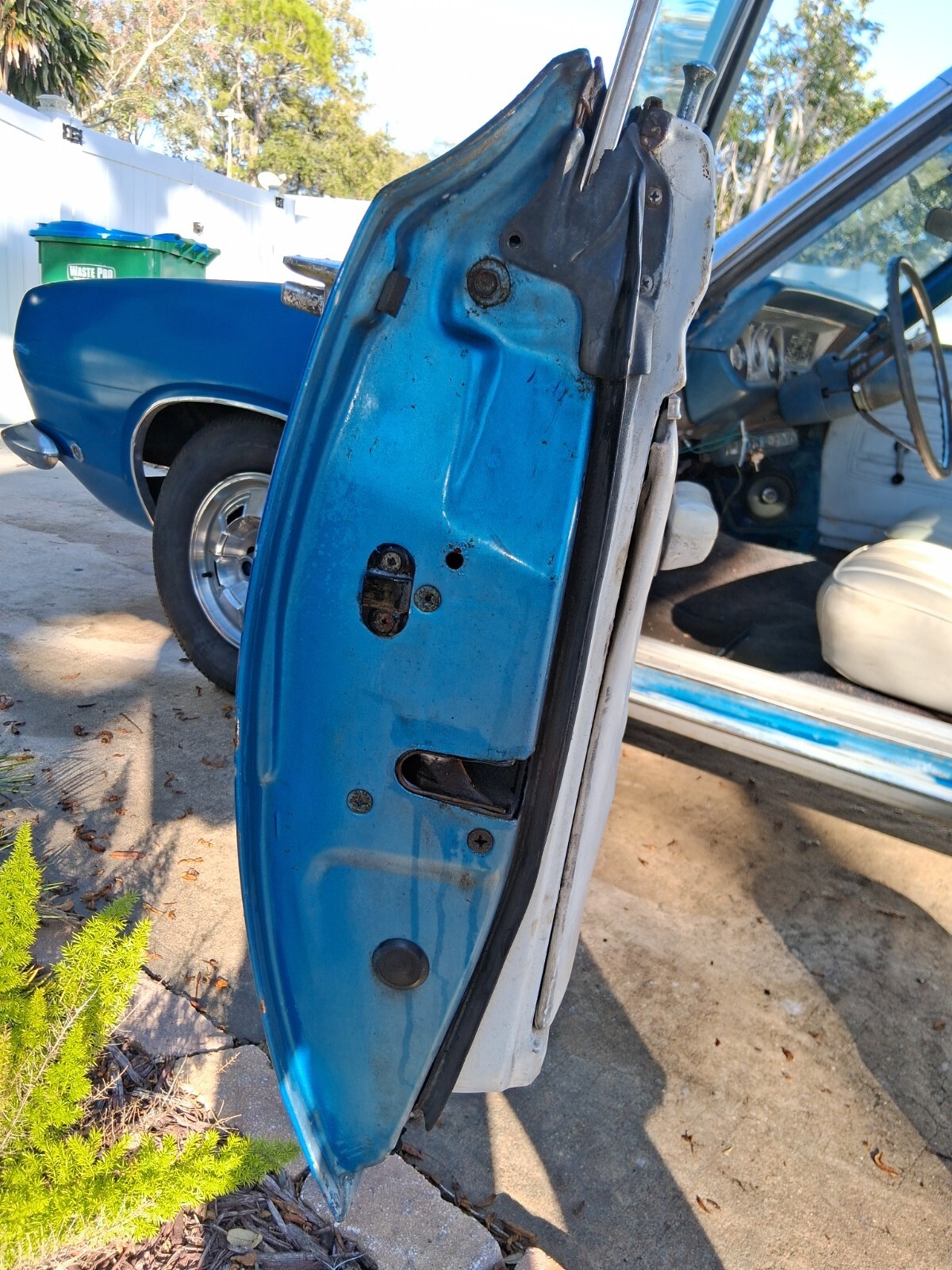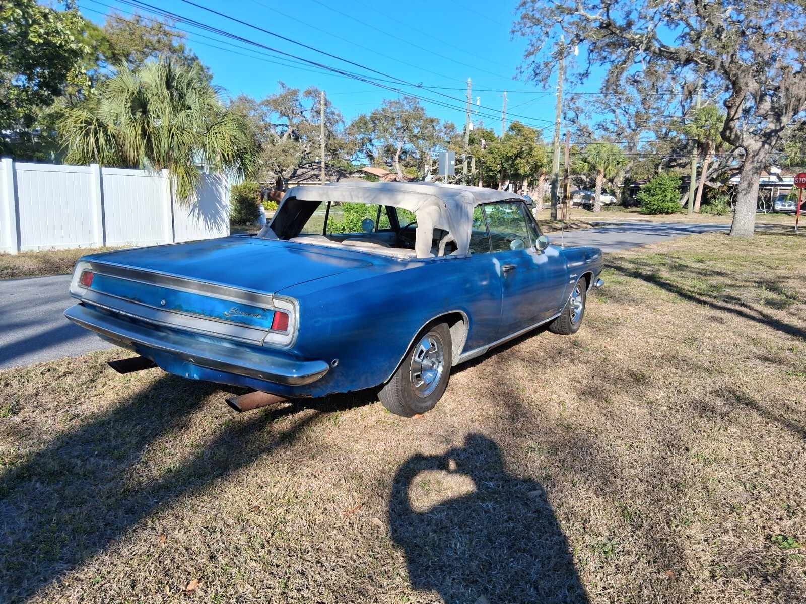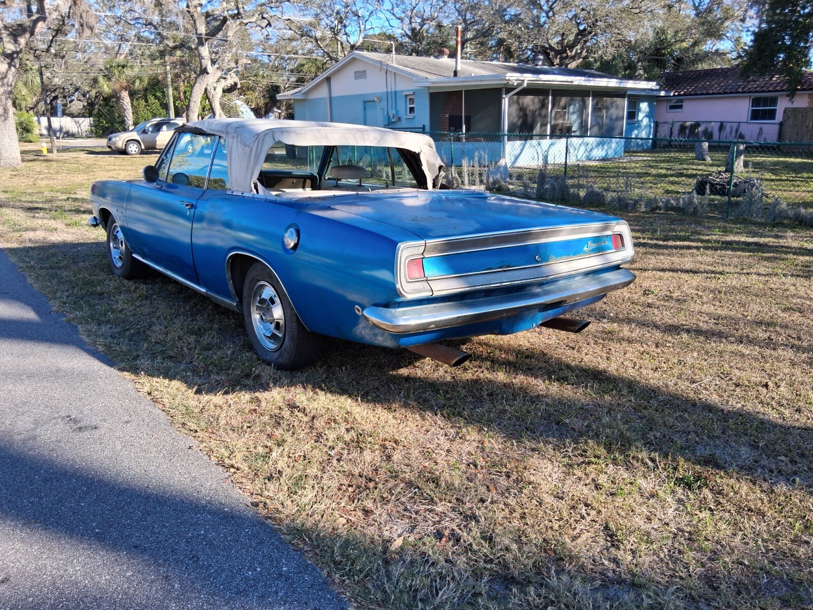 INTERIORWhite interior, white top, blue carpet. Beautiful color combo with the factory blue paint. It needs a full interior kit. It's all there but tired looking. Top is way shot but the power top does go up n down. Gauges work, interior dome lights, horn work. Lights work. Car had to pass Florida inspection for title issuance. Car comes with a very nice dash face with gauges. Chrome items are pitted. Simple interior to make awesome. Windows roll up and down.