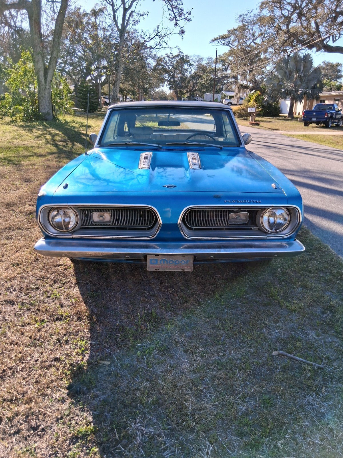 DRIVETRAINOriginal 318 starts up with bump of the original key and idles smooth. Comes with the original air cleaner. Auto transmission. Engine does not smoke. One freeze plug replaced, another needs it. Motor should be pulled and cleaned up, painted in my opinion. It is very stock, never modified. Great candidate for a stock Mopar restoration or put a new Hemi in it! They make kits that fit. It's great to look under the hood and see such a non-modified example. A/C is all there, completely intact. Comes with new front left brake drum, shoes, 2 wheel cylinders. Dual exhaust sounds nice, needs new exhaust tips.